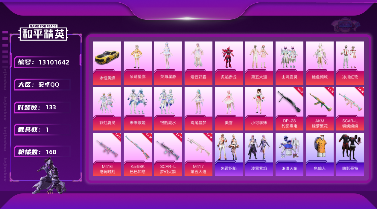 - PX_2057249- 苹果手Q-16王牌印记-18粉装-10特效枪-2载具-97333热力值-214套装-281枪皮-5卓越印记-2传奇印记 【18粉装】,天使彩虹糖,严莉莉,电波星,金曜白虎,复仇流浪者,天星战神,赤焰黑爵,守护天翼,冰霜白皇,炙焰红王,彩虹鹿灵,仲夏莫吉托,创世·救赎,幻影战神,烟云彩露,齐天大圣,小蓝,美琪 【10特效枪】AKM-绿萝繁花-5级 SCAR-L-锦绣绵绵-5级