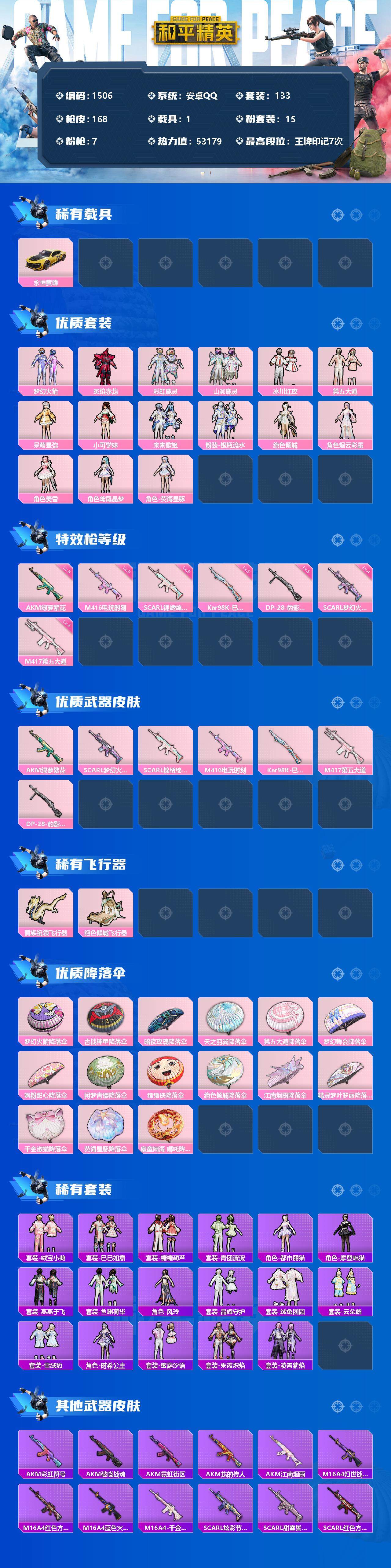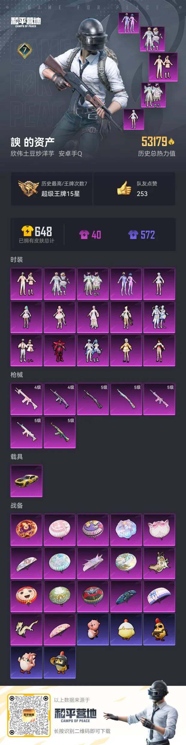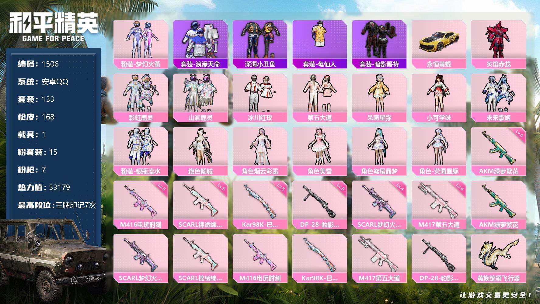 [13101642]安卓 手Q-15粉装-7特效枪-1载具-2粉色飞行器-53179热力值-7王牌印记-133套装-168枪皮