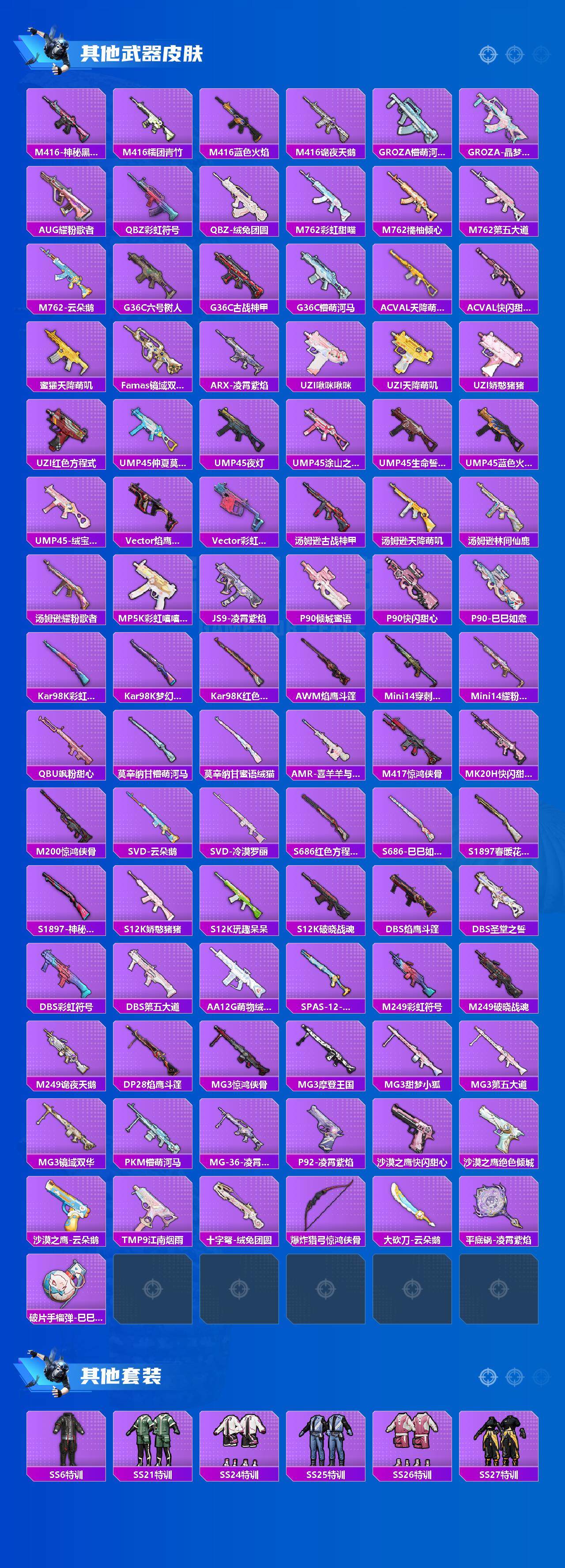 【稀有枪皮】:AKM-彩虹符号,AKM-江南烟雨,AKM-破晓战魂,AKM-霓虹街区,AKM-龙的传人,M16A4-幻世战舞者,M16A4-红色方程式,M16A4-蓝色火焰,M16A4-千金淑猫,SCAR-L-炫彩节奏,SCAR-L-甜蜜誓约,SCAR-L-红色方程式,M416-神秘黑猫,M416-糯团青竹,M416-蓝色火焰,M416-诡夜天鹅,GROZA-懵萌河马,GROZA-晶梦幻蝶,AUG-耀粉歌者,QBZ-彩虹符号,QBZ-绒兔团圆,M762-彩虹甜喵,M762-橘柚倾心,M762-第五大道,M762-云朵鹅,