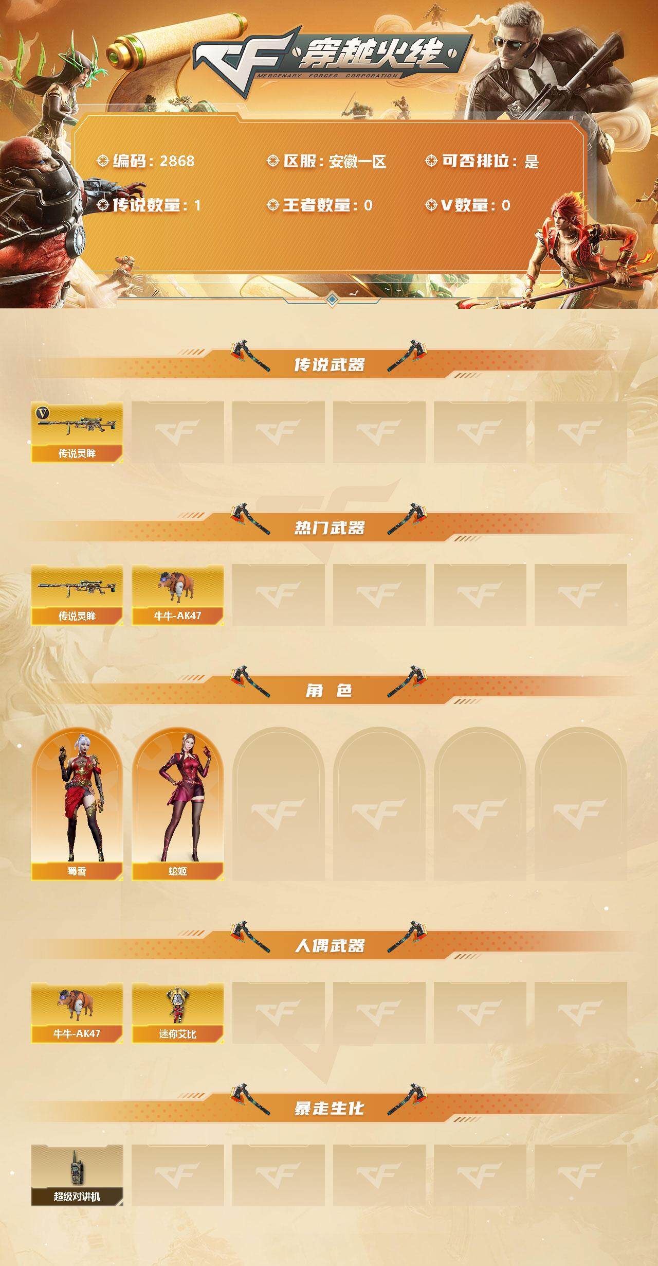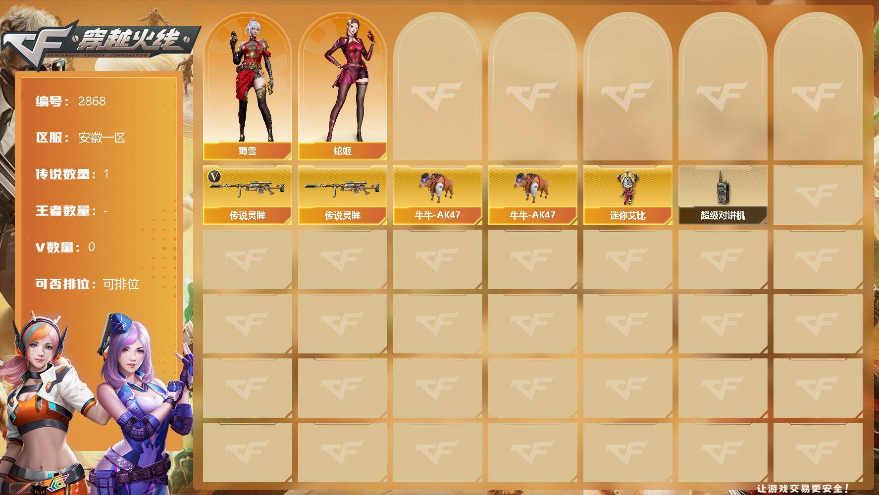 [13102087]安徽一区-0V-0王者-0炫金 【传说武器】:传说灵眸 【热门武器】:传说灵眸,牛牛-AK47 【角色】:蛇姬,蜀雪 【人偶武器】:迷你艾比,牛牛-AK47 【暴走生化】:超级对讲机 【特殊枪械】: