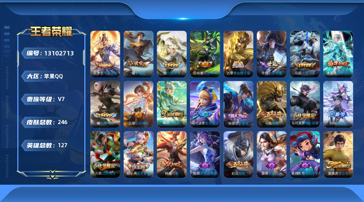 [13102713]苹果Q-V7-至尊星耀IV段位-127英雄-246皮肤-1典藏-0珍品无双-0无双-0珍品传说-11传说-66史诗