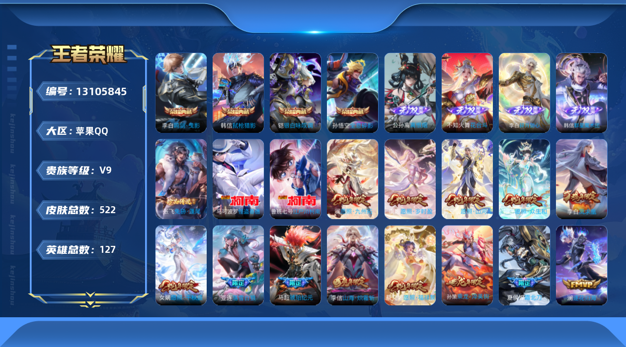 - PX_2095141-贵族7/皮肤228/典藏1/传说7/史诗53/英雄123/全息碎影/宫本武藏黑崎一护/优雅恋人/女武神/特工战影/末日机甲女/仲夏夜之梦/黄金狮子座/一念神魔/云鹰飞将/时雨天司/逐花归海/狰/姜子牙天穹之誓/狄仁杰阴阳师/凯尔特女王/赵云皇家上将/优雅恋人/狮舞东方/蜃楼王/高渐离死亡摇滚/钟无艳王者之锤/妖精王/炼金王/重明/赤莲之焰/云间偶戏/元歌无心/朔风刀/烛龙/穷