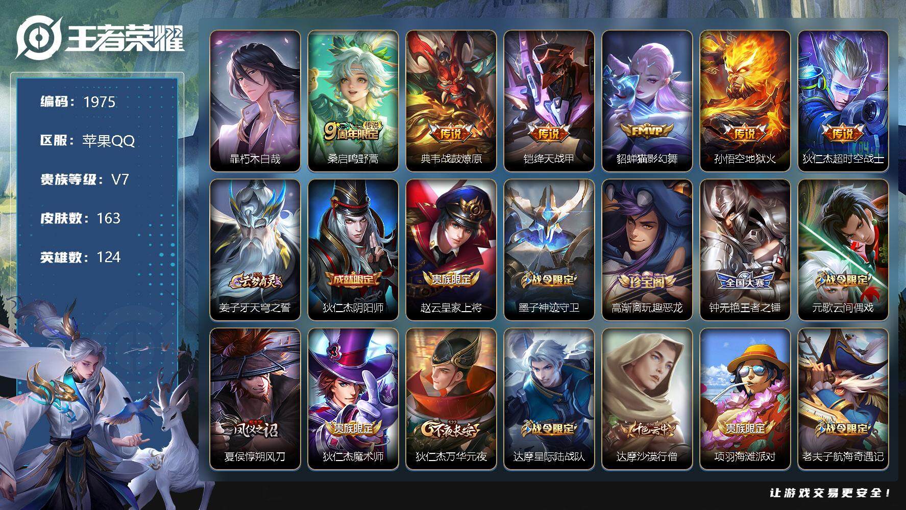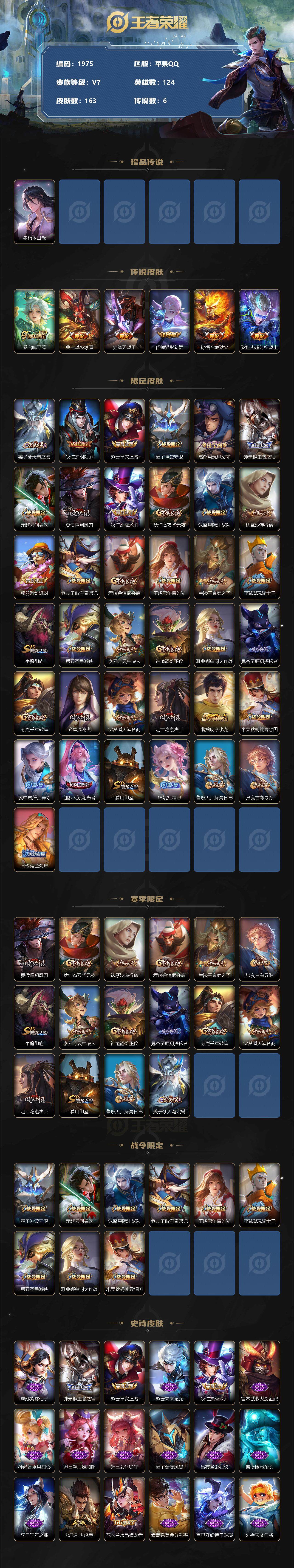 [13105944]苹果Q-V5-永恒钻石I段位-124英雄-163皮肤-0典藏-0珍品无双-0无双-1珍品传说-6传说-44史诗