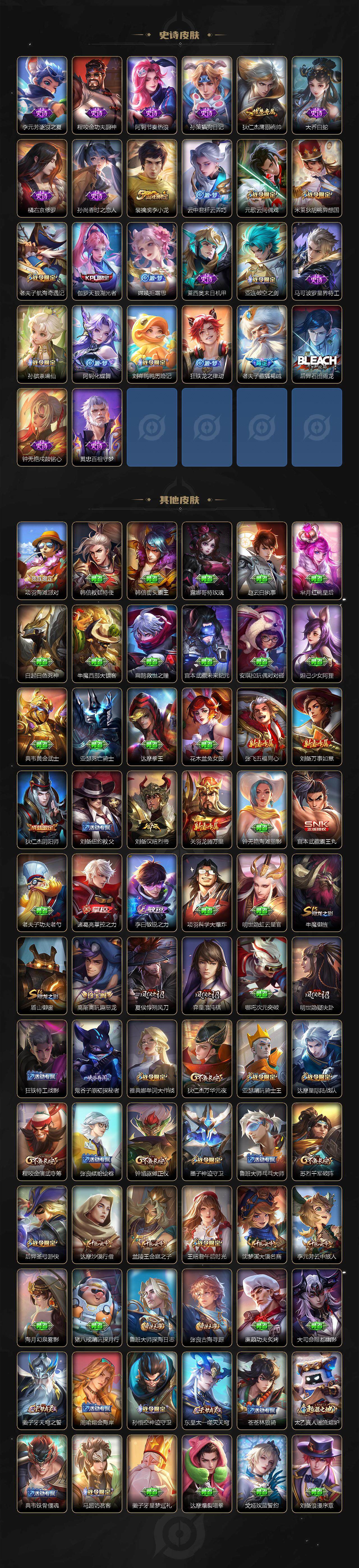 【史诗皮肤】:露娜紫霞仙子,钟无艳王者之锤,赵云皇家上将,赵云未来纪元,狄仁杰魔术师,宫本武藏鬼剑武藏,孙尚香水果甜心,妲己魅力维加斯,妲己女仆咖啡,墨子金属风暴,吕布圣诞狂欢,曹操幽灵船长,李白千年之狐,张飞乱世虎臣,花木兰水晶猎龙者,诸葛亮黄金分割率,百里守约特工魅影,刘禅天才门将,李元芳逐浪之夏,程咬金功夫厨神,阿轲节奏热浪,孙策猫狗日记,狄仁杰鹰眼统帅,大乔白蛇,橘右京修罗,孙尚香时之恋人,裴擒虎李小龙,云中君纤云弄巧,元歌云间偶戏,米莱狄胡桃异想国,老夫子航海奇遇记,伽罗天狼溯光者,嫦娥拒霜思,莱西奥末日机甲,亚连破空之剑,马可波罗星界特工,孙膑茶境仙,阿轲化蝶舞,刘禅鸭鸭历险记,狂铁龙之律动,老夫子藏狐褐绒,后羿石田雨龙,钟无艳戍鼓铭心,黄忠百相守梦