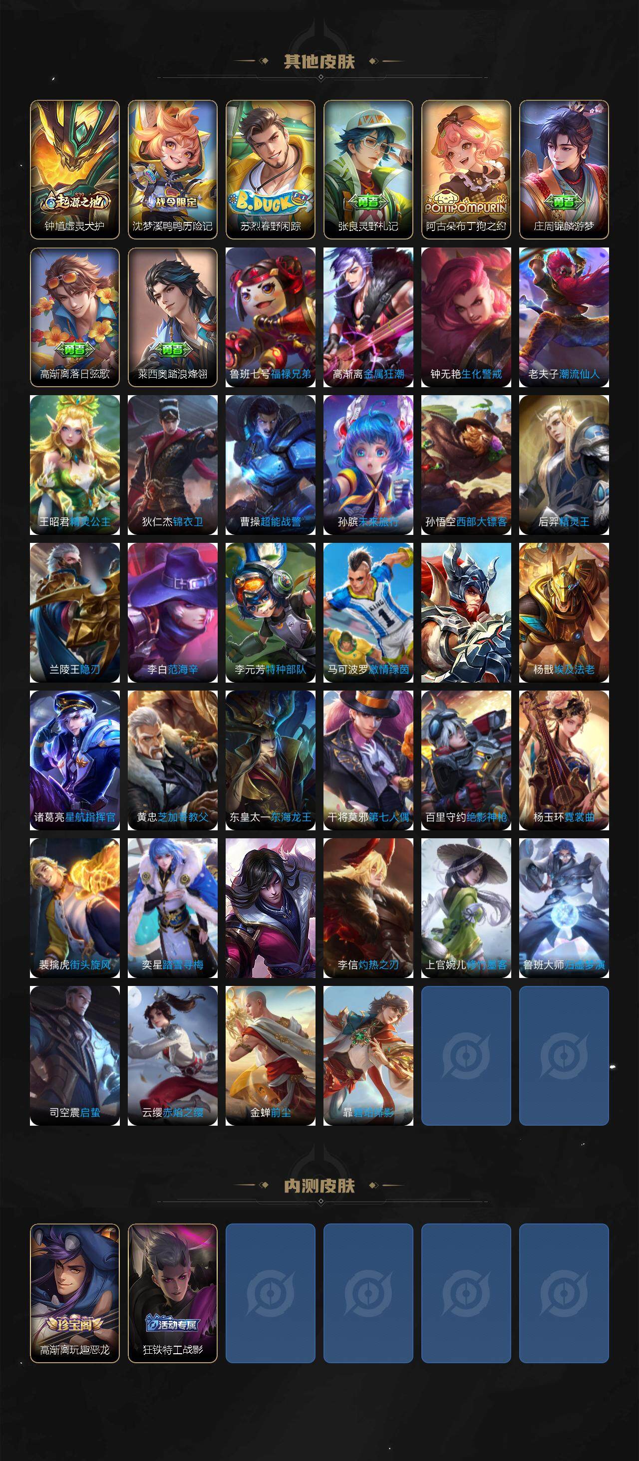 【赛季限定】:夏侯惇朔风刀,狄仁杰万华元夜,达摩沙漠行僧,程咬金演武夺筹,兰陵王金庭之子,张良古海寻踪,牛魔御旌,李元芳云中旅人,钟馗驱傩正仪,鬼谷子原初探秘者,苏烈千军破阵,弈星混沌棋,沈梦溪大漠名商,明世隐疑决卦,盾山御銮,鲁班大师探海日志,姜子牙天穹之誓