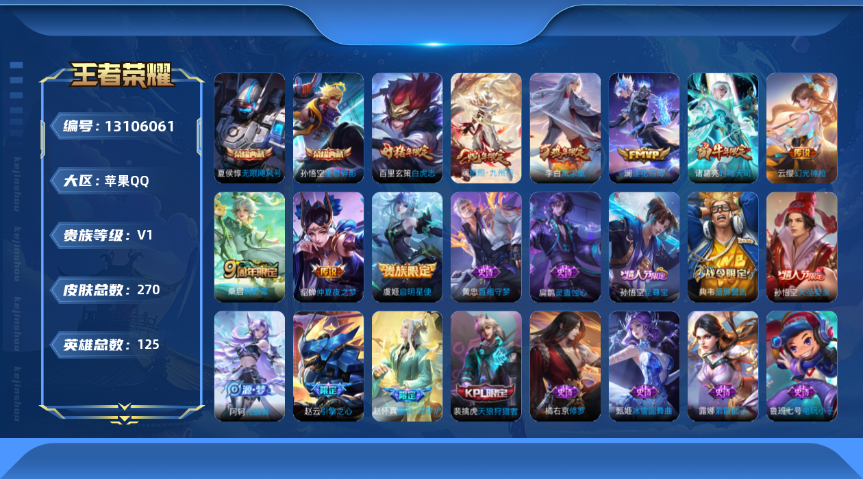 [13106061]打野42段/【特价急出/详情看图】:苹果Q-V1-最强王者段位-125英雄-270皮肤-2典藏-9传说-65史诗 【荣耀典藏】:孙悟空全息碎影,夏侯惇无限飓风号 【传说皮肤】:澜愿照九州拓,云缨幻光神枪,桑启鸣野蒿,澜逐花归海,诸葛亮时雨天司,虞姬启明星使,百里玄策白虎志,貂蝉仲夏夜之梦,李白凤求凰 【限定皮肤】:白起狰,狄仁杰阴阳师,虞姬凯尔特女王,赵云皇家上将,赵云引擎之心,嬴政白昼王子,孙尚香蔷薇恋人,鲁班七号狮舞东方,高渐离玩趣恶龙,孙膑妖精王,扁鹊炼金王,芈月重明,吕布猎兽之王,元歌无心,夏侯惇朔风刀,甄姬游园惊梦,曹操烛龙,典韦穷奇,典韦蓝屏警告,狄仁杰魔术师,狄仁杰万华元夜,达摩沙漠行僧,项羽海滩派对,老夫子醍醐杖,程咬金演武夺筹,兰陵王金庭之子,孙悟空至尊宝,孙悟空大圣娶亲,牛魔御旌,李元芳云中旅人,虞姬启明星使,钟馗神迹守卫,钟馗驱傩正仪,杨玉环遇见飞天,女娲朔望之晖,雅典娜黎明之约,太乙真人饕餮,鬼谷子原初探秘者,鬼谷子五谷丰年,诸葛亮时雨天司,苏烈千军破阵,百里玄策白虎志,百里玄策原初追逐者,弈星混沌棋,梦奇顽趣,沈梦溪大漠名商,明世隐疑决卦,裴擒虎天狼狩猎者,裴擒虎李小龙,狂铁御狮,米莱狄御霄,盾山御銮,上官婉儿梁祝,鲁班大师探海日志,桑启海盐诗旅,艾琳女武神,张良古海寻踪,蒙恬荣光圣徽 【年限皮肤】:百里玄策白虎志,李白凤求凰,诸葛亮时雨天司 【赛季限定】:孙膑妖精王,扁鹊炼金王,白起狰,芈月重明,夏侯惇朔风刀,曹操烛龙,典韦穷奇,狄仁杰万华元夜,达摩沙漠行僧,老夫子醍醐杖,程咬金演武夺筹,兰陵王金庭之子,张良古海寻踪,牛魔御旌,李元芳云中旅人,虞姬凯尔特女王,钟馗驱傩正仪,雅典娜黎明之约,太乙真人饕餮,鬼谷子原初探秘者,苏烈千军破阵,百里玄策原初追逐者,弈星混沌棋,梦奇顽趣,沈梦溪大漠名商,明世隐疑决卦,狂铁御狮,米莱狄御霄,盾山御銮,鲁班大师探海日志,桑启海盐诗旅,蒙恬荣光圣徽 【战令限定】:嬴政白昼王子,鲁班七号狮舞东方,吕布猎兽之王,典韦蓝屏警告,钟馗神迹守卫,女娲朔望之晖 【史诗皮肤】:鲁班七号电玩小子,露娜紫霞仙子,赵云皇家上将,赵云未来纪元,貂蝉圣诞恋歌,甄姬冰雪圆舞曲,狄仁杰魔术师,廉颇地狱岩魂,宫本武藏鬼剑武藏,孙尚香蔷薇恋人,孙尚香水果甜心,嬴政摇滚巨星,妲己魅力维加斯,妲己女仆咖啡,墨子龙骑士,墨子金属风暴,吕布圣诞