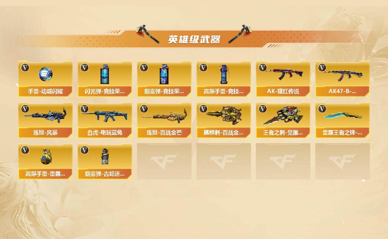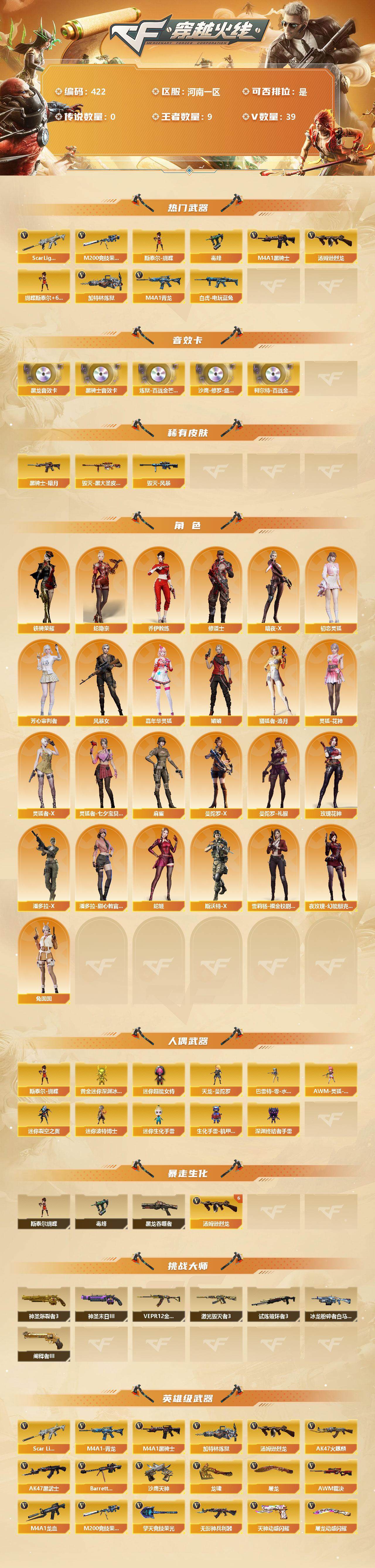 [13106369]【422】38V/102级/荣耀元首/9王者/1英雄/Scar Light-白虎/M4A1青龙/M200-竞技荣光/白虎-电玩蓝兔/毒蜂/M4A1-黑骑士/汤姆逊-烈龙/加特林-炼狱/斯泰尔蝴蝶/蝴蝶斯泰尔+6烈龙/M4A1-黑龙音效卡/M4A1-黑骑士音效卡/炼狱-百战金芒-庆典舞曲音效卡/沙鹰-修罗-盛典舞曲音效卡/柯尔特-百战金芒-庆典舞曲音效卡/AWM-裁决-凤灵皮肤/M4A1-再燃火线/毁灭-黑大圣皮肤/毁灭-风暴/黑骑士-暗月/战神-粉色甜心皮肤/炼狱-玩具枪皮肤/轻型军用手斧-再燃火线/蛇隐宗/乔伊教练/修道士/暗夜-X/初恋灵狐/芳心审判者/风暴女/嘉年华灵狐/娟娟/猎狐者-追月/灵狐-花神/灵狐者-X/灵狐者-七夕宝贝/麻雀/曼陀罗-X/曼陀罗-礼服/玫瑰花神/潘多拉-X/潘多拉-甜心教官/蛇姬/斯沃特-X/铁骑荣耀/兔囡囡/雪莉杨-摸金校尉/夜玫瑰-幻能朋克/天龙-曼陀罗/巴雷特-零-水下丽影/AWM-灵狐-15周年嘉年华/迷你超能女侍/黄金迷你深渊冰龙/迷你裂空之翼/迷你波特博士/迷你生化手雷/生化手雷-机甲核心/深渊终结者手雷/黑龙吞噬者/6烈龙/神圣爆裂者/冰龙粉碎者-白马银枪/VEPR-12-金魔/激光毁灭者/试炼破坏者/神圣爆裂者-末日/阐释者/AK47-火麒麟/AK47-黑武士/M4A1-龙血/无影-神兵利器/QBZ03-独角-III/AK-47-猩红传说/AK47-B-战神/Barrett-毁灭/AWM-裁决/炼狱-百战金芒/炼狱-风暴/沙鹰-天神/天神-动感闪耀/屠龙/龙啸/擎天-竞技荣光/屠龙-动感闪耀/麒麟刺-百战金芒/王者之刺-觉醒版/雷霆王者之锋-觉醒版/高爆手雷-竞技荣光/手雷-动感闪耀/高爆手雷-雷霆王者/闪光弹-竞技荣光/烟雾弹-竞技荣光/烟雾弹-古蛇迷踪