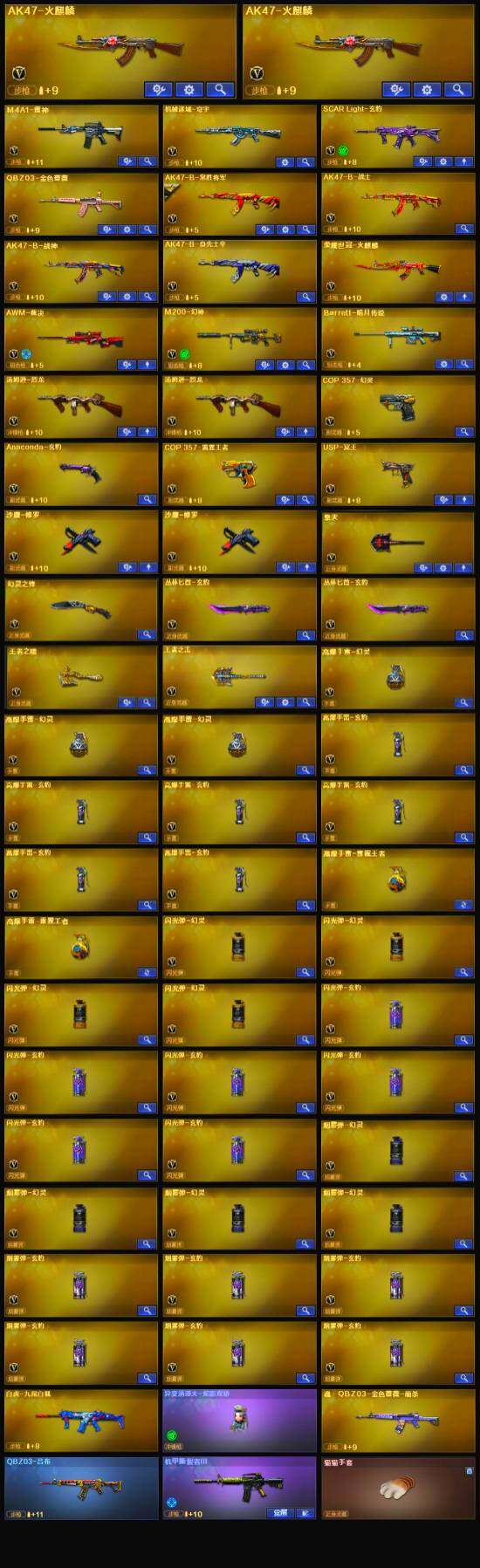 【英雄级武器】:AK47-火麒麟*2,M4A1-雷神,SCAR Light-玄豹,QBZ03-金色蔷薇,AK-47-猩红传说,AK47-B-战神,AK47-B-常胜将军,荣耀世冠-火麒麟,AWM-裁决,M200-幻神,汤姆逊-烈龙*2,沙鹰-修罗*2,COP 357-雷霆王者-觉醒版,COP 357-幻灵,USP-冥王,擎天,幻灵之锋,王者之啸-觉醒版,王者之击-觉醒版,高爆手雷-幻灵*3,高爆手雷-玄豹*6,高爆手雷-雷霆王者*2,闪光弹-幻灵*4,闪光弹-玄豹*6,烟雾弹-幻灵*4,烟雾弹-玄豹*6,M4A1-赤狱骑士,Barrett-碧霄极光