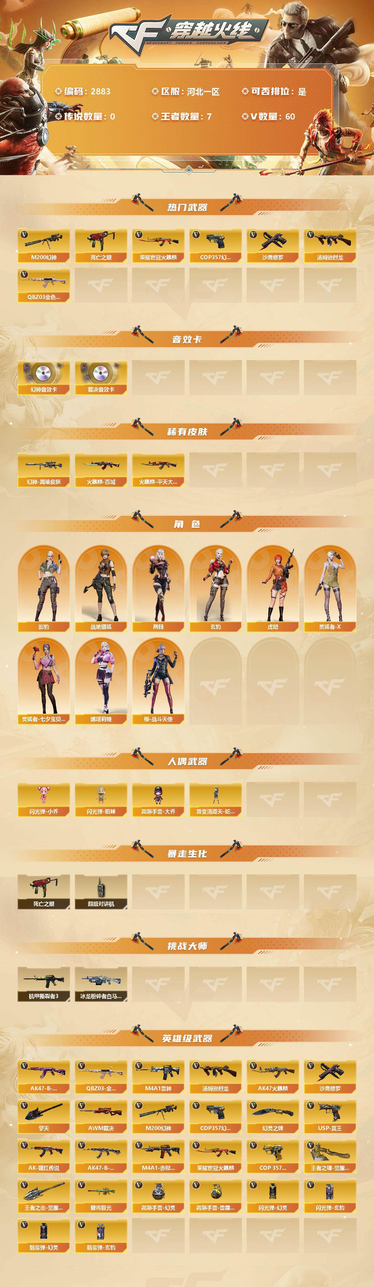 [13106370]河北一区-60V-7王者-0炫金 【热门武器】:QBZ03-金色蔷薇,M200-幻神,死亡之眼,荣耀世冠-火麒麟,汤姆逊-烈龙*2,COP 357-幻灵,沙鹰-修罗*2 【音效卡】:M200-幻神音效卡,AWM-裁决音效卡 【皮肤】:幻神-周瑜皮肤,裁决-巅峰荣耀 皮肤,雷神-烈虎皮肤,雷神-诺拉 皮肤,火麒麟-平天大圣,火麒麟-百城,战神-粉色甜心皮肤,战神-流金岁月皮肤,AK47-B-常胜将军-刘备,AK47-B-常胜将军-孙权,轻型军用手斧-再燃火线 【角色】:影豹,玄豹,荆棘,战地猎狐,虎妞,灵狐者-X,灵狐者-七夕宝贝,娜塔莉娅,樱-战斗天使 【人偶武器】:异变清道夫-蛇影双骄,闪光弹-小乔,闪光弹-貂蝉,高爆手雷-大乔 【暴走生化】:死亡之眼,超级对讲机 【挑战大师】:冰龙粉碎者-白马银枪,机甲撕裂者III 【英雄级武器】:AK47-火麒麟*2,M4A1-雷神,SCAR Light-玄豹,QBZ03-金色蔷薇,AK-47-猩红传说,AK47-B-战神,AK47-B-常胜将军,荣耀世冠-火麒麟,AWM-裁决,M200-幻神,汤姆逊-烈龙*2,沙鹰-修罗*2,COP 357-雷霆王者-觉醒版,COP 357-幻灵,USP-冥王,擎天,幻灵之锋,王者之啸-觉醒版,王者之击-觉醒版,高爆手雷-幻灵*3,高爆手雷-玄豹*6,高爆手雷-雷霆王者*2,闪光弹-幻灵*4,闪光弹-玄豹*6,烟雾弹-幻灵*4,烟雾弹-玄豹*6,M4A1-赤狱骑士,Barrett-碧霄极光 【特殊枪械】:2烈龙