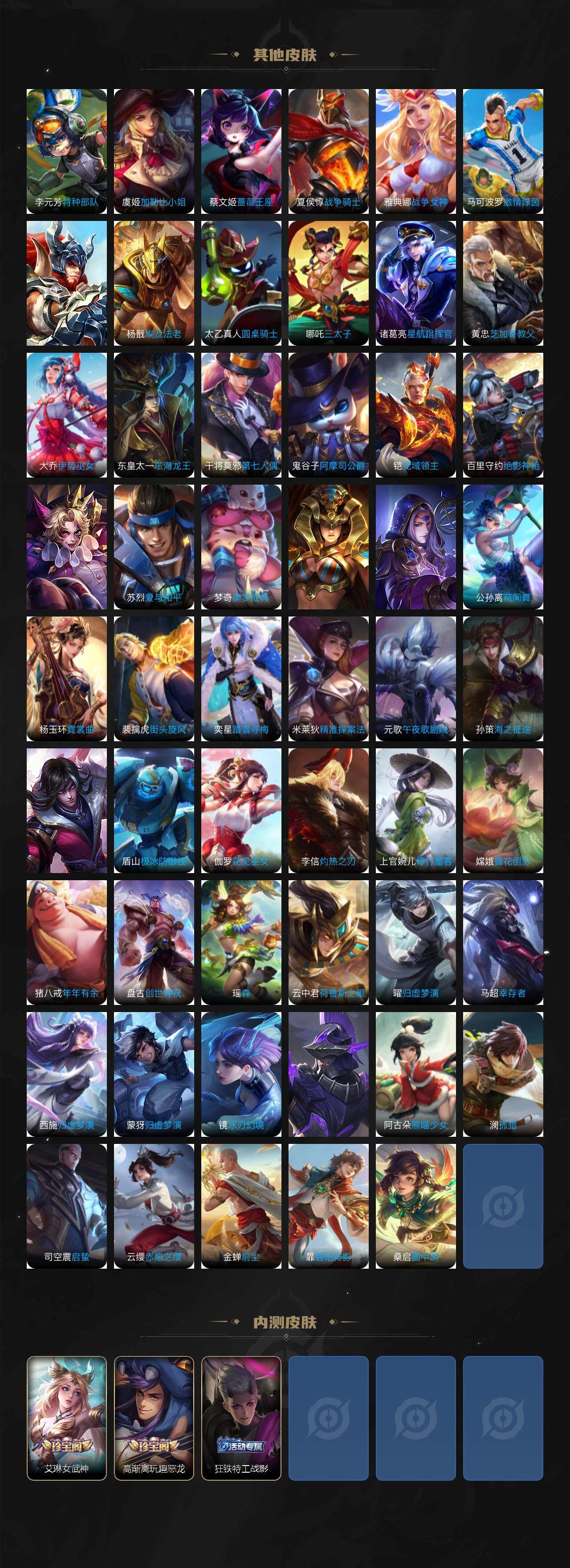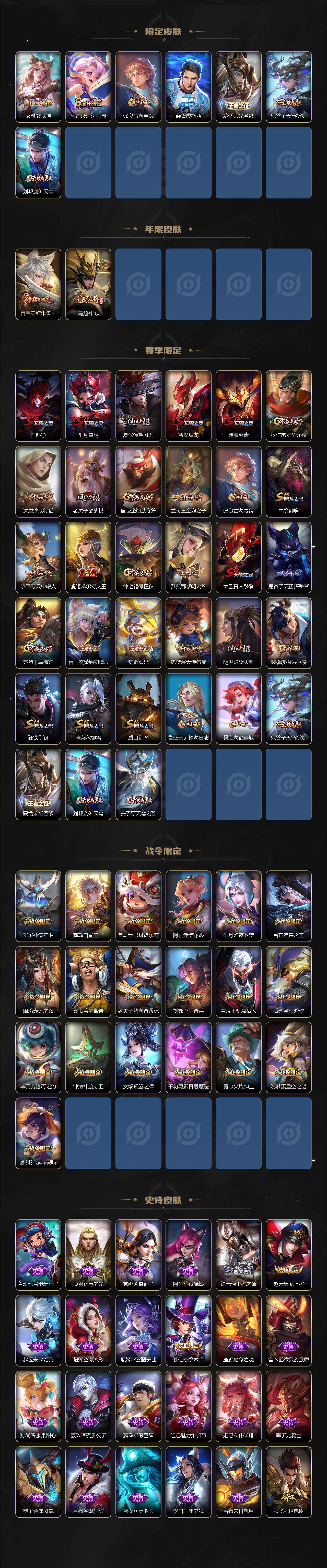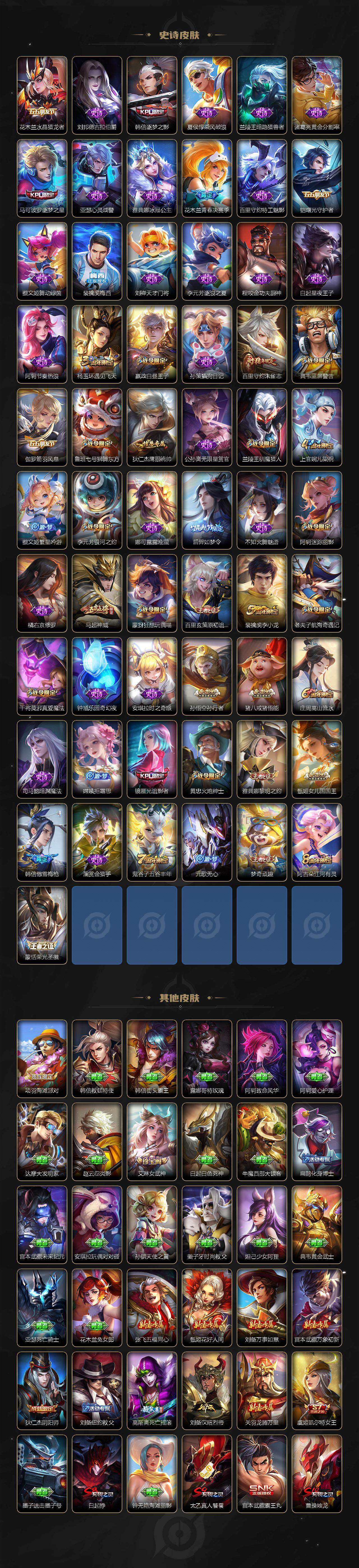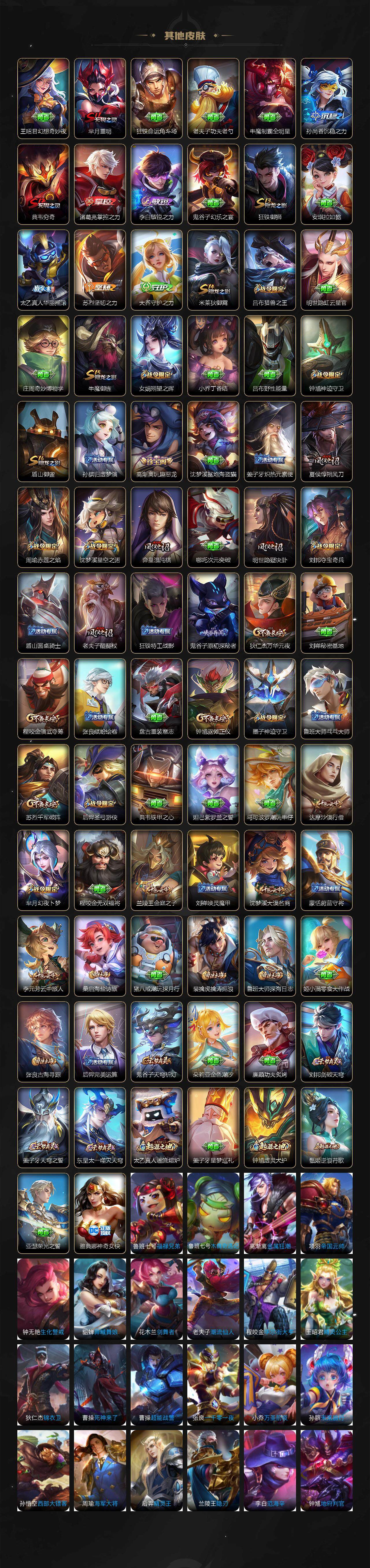 【限定皮肤】:白起狰,姜子牙天穹之誓,狄仁杰阴阳师,虞姬凯尔特女王,赵云皇家上将,墨子神迹守卫,嬴政白昼王子,孙尚香异界灵契,鲁班七号狮舞东方,庄周高山流水,高渐离死亡摇滚,高渐离玩趣恶龙,阿轲迷踪丽影,钟无艳王者之锤,芈月重明,芈月幻夜卜梦,吕布猎兽之王,周瑜赤莲之焰,元歌无心,夏侯惇朔风刀,甄姬女儿国国王,曹操烛龙,典韦穷奇,典韦蓝屏警告,马可波罗逐梦之星,狄仁杰魔术师,狄仁杰万华元夜,达摩沙漠行僧,项羽海滩派对,老夫子醍醐杖,老夫子航海奇遇记,程咬金演武夺筹,刘邦夺宝奇兵,韩信逐梦之影,韩信傲雪梅枪,兰陵王驯魔猎人,兰陵王金庭之子,花木兰青春决赛季,孙悟空孙行者,牛魔御旌,后羿如梦令,后羿圣弓游侠,李元芳银河之约,李元芳云中旅人,虞姬启明星使,钟馗神迹守卫,钟馗驱傩正仪,杨玉环遇见飞天,女娲朔望之晖,干将莫邪真爱魔法,雅典娜黎明之约,蔡文姬繁星吟游,太乙真人饕餮,太乙真人华丽摇滚,鬼谷子原初探秘者,鬼谷子五谷丰年,诸葛亮武陵仙君,黄忠火炮绅士,苏烈千军破阵,百里玄策原初追逐者,百里守约朱雀志,弈星混沌棋,梦奇顽趣,沈梦溪星空之诺,沈梦溪大漠名商,明世隐疑决卦,裴擒虎李小龙,裴擒虎擒涛扼浪,狂铁御狮,米莱狄御霄,盾山御銮,猪八戒猪悟能,上官婉儿梁祝,嫦娥拒霜思,蒙犽狂想玩偶喵,鲁班大师探海日志,镜匿光追影者,桑启海盐诗旅,艾琳女武神,阿古朵江河有灵,张良古海寻踪,裴擒虎梅西,蒙恬荣光圣徽,鬼谷子天穹祈灯,刘邦剑破天穹