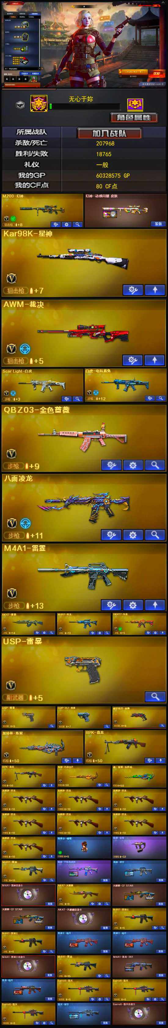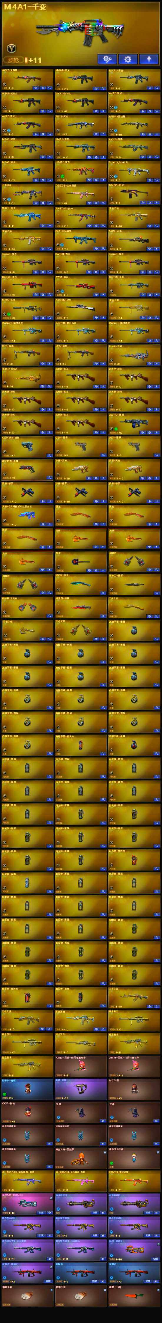 【热门武器】:QBZ03-金色蔷薇,Scar Light-白虎,HK417-朱雀,M4A1-青龙,M200-幻神,八面凌龙,白虎-电玩蓝兔,Kar98K-星神,金色小号,M4A1-黑骑士*2,汤姆逊-烈龙*7,RPK-盘龙*2,加特林-炼狱,斯泰尔-蝴蝶,USP-雷暴*2,沙鹰-修罗*3,金刚伞