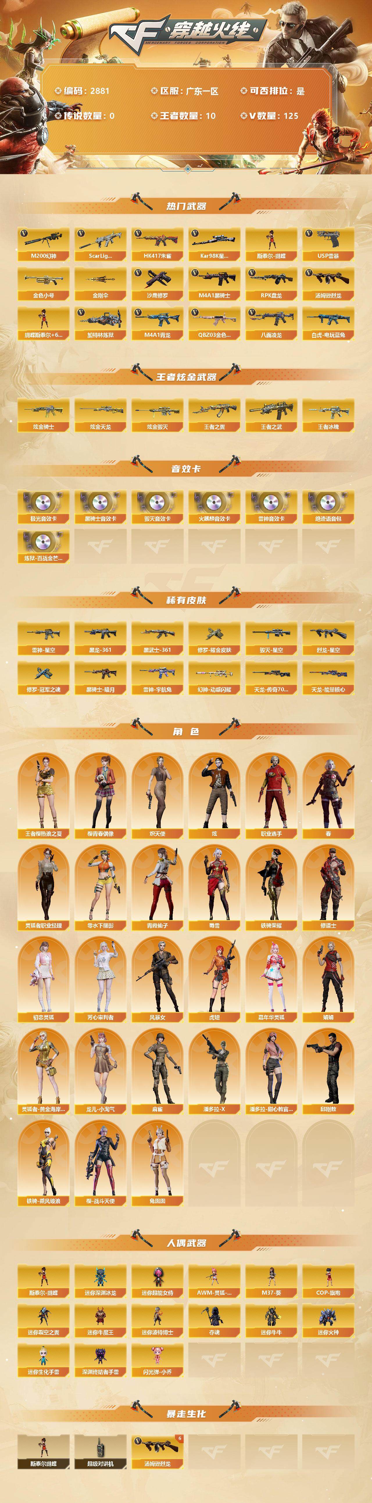 [13107569]广东一区-125V-10王者-5炫金 【热门武器】:QBZ03-金色蔷薇,Scar Light-白虎,HK417-朱雀,M4A1-青龙,M200-幻神,八面凌龙,白虎-电玩蓝兔,Kar98K-星神,金色小号,M4A1-黑骑士*2,汤姆逊-烈龙*7,RPK-盘龙*2,加特林-炼狱,斯泰尔-蝴蝶,USP-雷暴*2,沙鹰-修罗*3,金刚伞 【王者炫金武器】:王者冰魄,王者之翼,王者之武,炫金骑士*2,炫金天龙,炫金毁灭*2 【音效卡】:AK47-火麒麟音效卡,M4A1-雷神音效卡,M4A1-黑骑士音效卡,Barrett-毁灭音效卡,Barrett-极光音效卡,绝迹语音包,炼狱-百战金芒-庆典舞曲音效卡 【皮肤】:幻神-动感闪耀 皮肤,烈龙-星空,雷神-星空,雷神-宇航兔皮肤,M4A1-再燃火线,火麒麟-雷神*2,毁灭-星空,M4A1-千变-孔明皮肤,黑龙-暗月,M4A1-黑龙-361,黑骑士-暗月*2,AK47-黑武士-361,战神-紫绶金章皮肤*2,战神-流金岁月皮肤*2,AK47-B-常胜将军-曹操,AK47-B-常胜将军-刘备,天龙-能量核心,AWM-天龙-传奇70KG,极光-能量核心,修罗-能量核心,修罗耀金皮肤,修罗-冠军之魂,轻型军用手斧-再燃火线 【角色】:炫,春,王者樱-热浪之夏,修道士,炽天使,初恋灵狐,芳心审判者,风暴女*2,虎妞,嘉年华灵狐,娟娟,零-水下丽影,灵狐者-黄金海岸,灵狐者-职业经理,龙儿-小淘气,麻雀,潘多拉-X,潘多拉-甜心教官,邱刚敖,青霞仙子,蜀雪,铁骑-乘风破浪,铁骑荣耀,兔囡囡,樱-青春偶像,樱-战斗天使,职业选手 【人偶武器】:斯泰尔-蝴蝶,AWM-灵狐-15周年嘉年华*2,M37-葵,COP-旗袍,迷你超能女侍,迷你深渊冰龙*4,迷你裂空之翼,迷你牛魔王,迷你波特博士*3,夺魂*2,迷你牛牛*2,迷你火种,迷你生化手雷,深渊终结者手雷*3,闪光弹-小乔 【暴走生化】:斯泰尔-蝴蝶,超级对讲机 【挑战大师】:暴君乱世-超越Max,AK47-冰龙粉碎者,神圣爆裂者III*2,冰龙粉碎者-白马银枪*2,激光毁灭者III-白马银枪*2,激光毁灭者III*3,试炼破坏者III,神圣爆裂者-末日III*2,阐释者III*2 【英雄级武器】:M4A1-千变,AK47-火麒麟,M4A1-黑龙,M4A1-雷神,M4A1-黑骑士*2,AK4