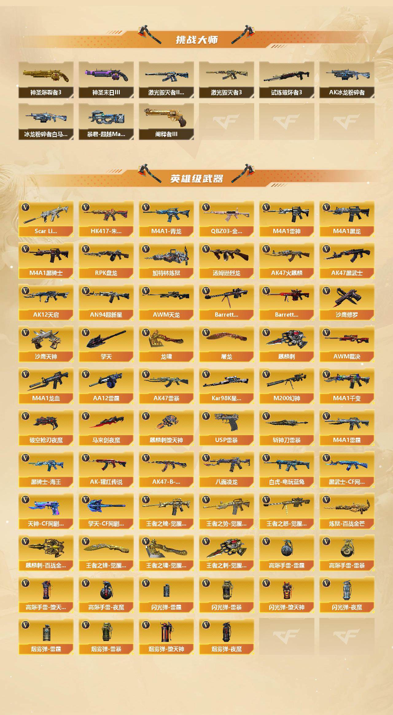 【英雄级武器】:M4A1-千变,AK47-火麒麟,M4A1-黑龙,M4A1-雷神,M4A1-黑骑士*2,AK4