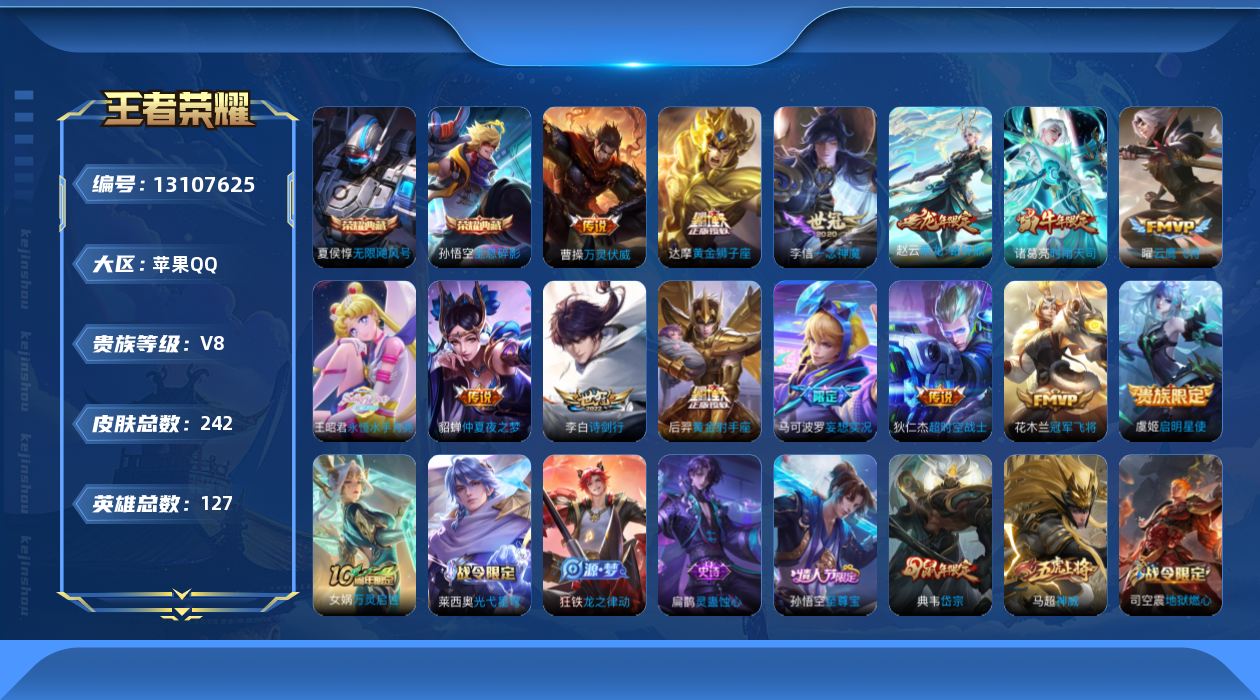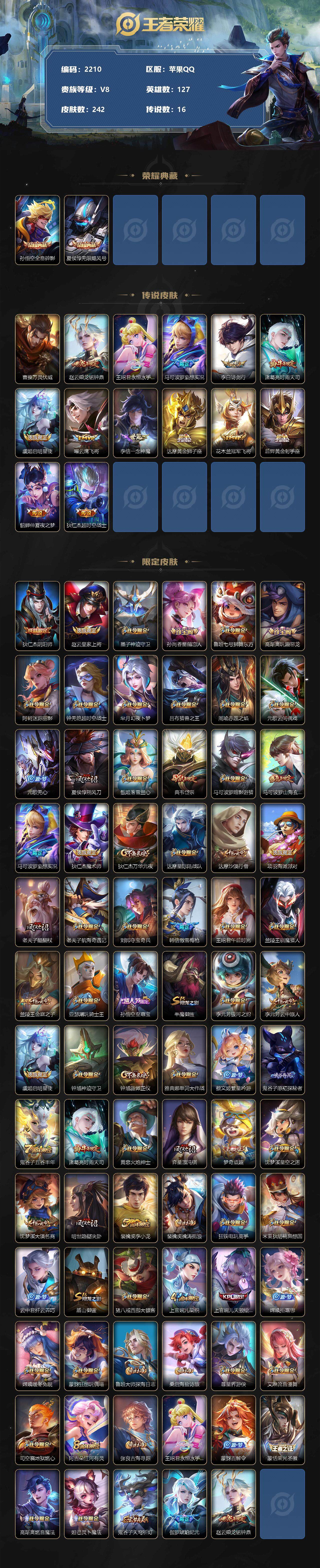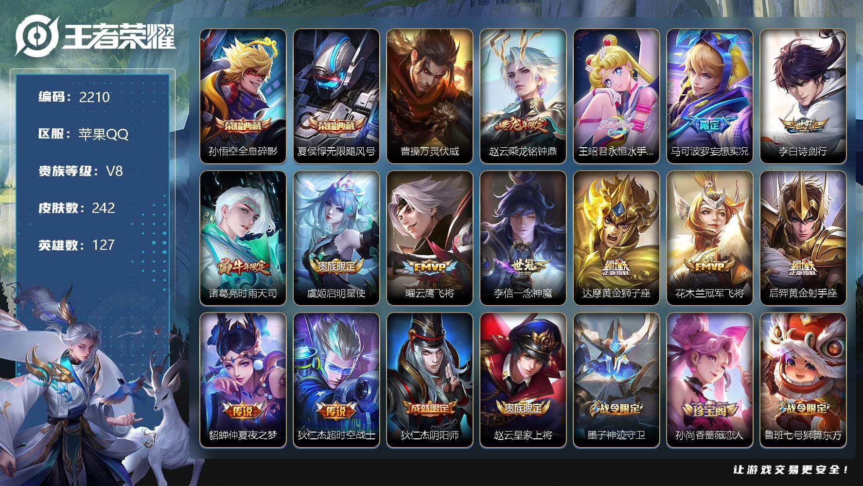 [13107625]苹果Q-V8-最强王者段位-127英雄-242皮肤-2典藏-0珍品无双-0无双-0珍品传说-16传说-71史诗
