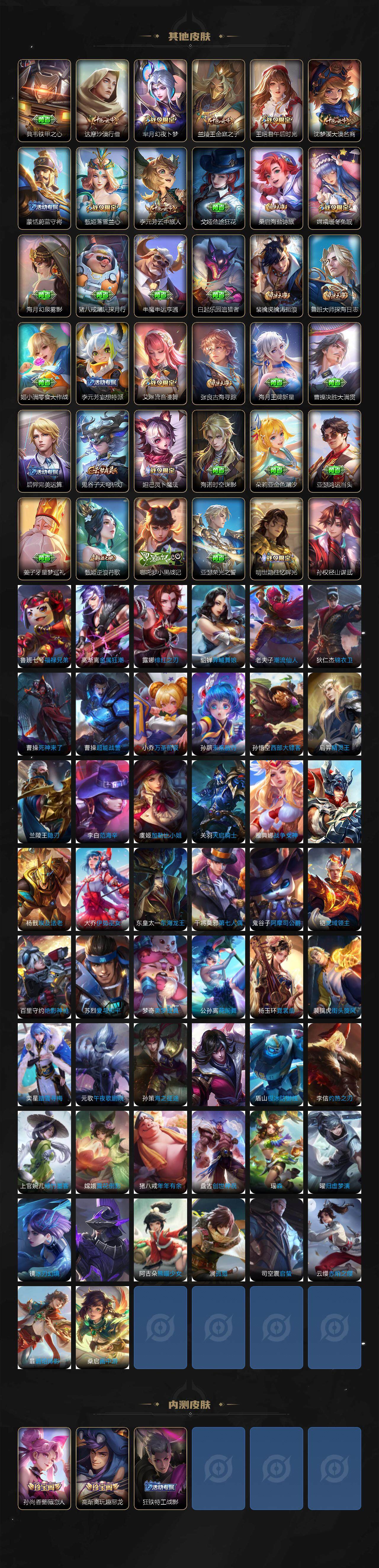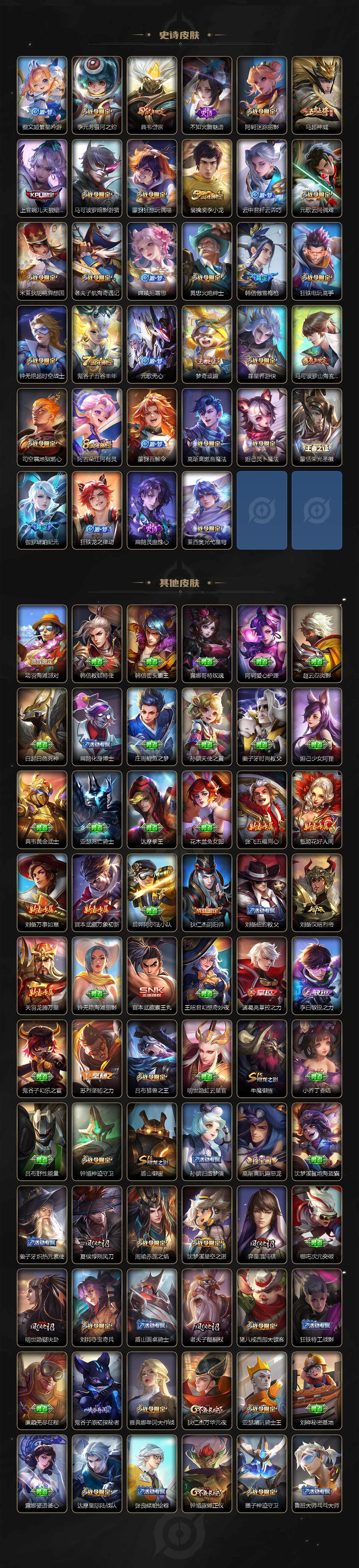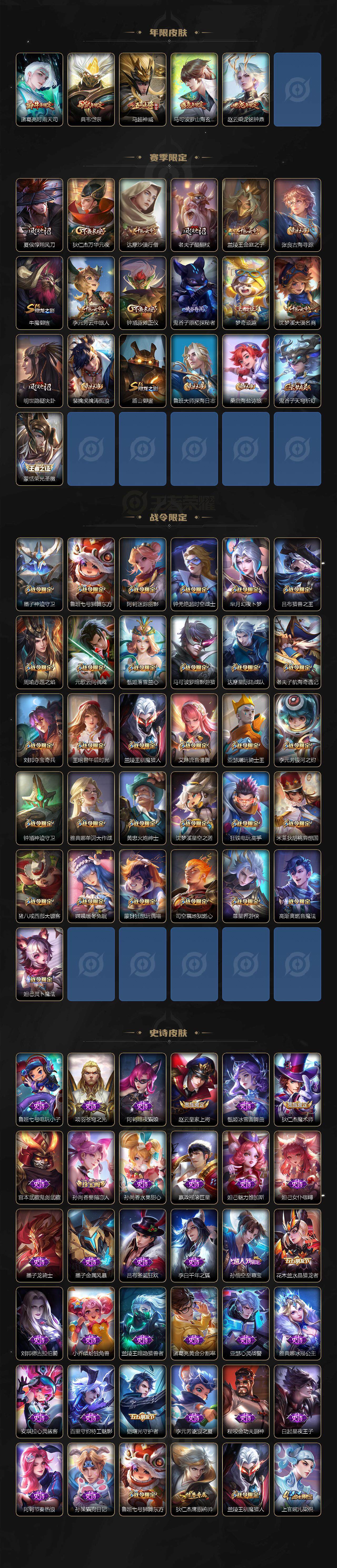 【限定皮肤】:狄仁杰阴阳师,赵云皇家上将,墨子神迹守卫,孙尚香蔷薇恋人,鲁班七号狮舞东方,高渐离玩趣恶龙,阿轲迷踪丽影,钟无艳超时空战士,芈月幻夜卜梦,吕布猎兽之王,周瑜赤莲之焰,元歌云间偶戏,元歌无心,夏侯惇朔风刀,甄姬落雪兰心,典韦岱宗,马可波罗暗影游猎,马可波罗山海玄木吟,马可波罗妄想实况,狄仁杰魔术师,狄仁杰万华元夜,达摩星际陆战队,达摩沙漠行僧,项羽海滩派对,老夫子醍醐杖,老夫子航海奇遇记,刘邦夺宝奇兵,韩信傲雪梅枪,王昭君午后时光,兰陵王驯魔猎人,兰陵王金庭之子,亚瑟潮玩骑士王,孙悟空至尊宝,牛魔御旌,李元芳银河之约,李元芳云中旅人,虞姬启明星使,钟馗神迹守卫,钟馗驱傩正仪,雅典娜单词大作战,蔡文姬繁星吟游,鬼谷子原初探秘者,鬼谷子五谷丰年,诸葛亮时雨天司,黄忠火炮绅士,弈星混沌棋,梦奇顽趣,沈梦溪星空之诺,沈梦溪大漠名商,明世隐疑决卦,裴擒虎李小龙,裴擒虎擒涛扼浪,狂铁电玩高手,米莱狄胡桃异想国,云中君纤云弄巧,盾山御銮,猪八戒西部大镖客,上官婉儿梁祝,上官婉儿天狼绘梦者,嫦娥拒霜思,嫦娥暖冬兔眠,蒙犽狂想玩偶喵,鲁班大师探海日志,桑启海盐诗旅,暃星界游侠,艾琳流音漫舞,司空震地狱燃心,阿古朵江河有灵,张良古海寻踪,王昭君永恒水手月亮,蒙犽百解令,蒙恬荣光圣徽,高渐离燃音魔法,妲己灵卜魔法,鬼谷子天穹祈灯,伽罗琥珀纪元,赵云乘龙铭钟鼎