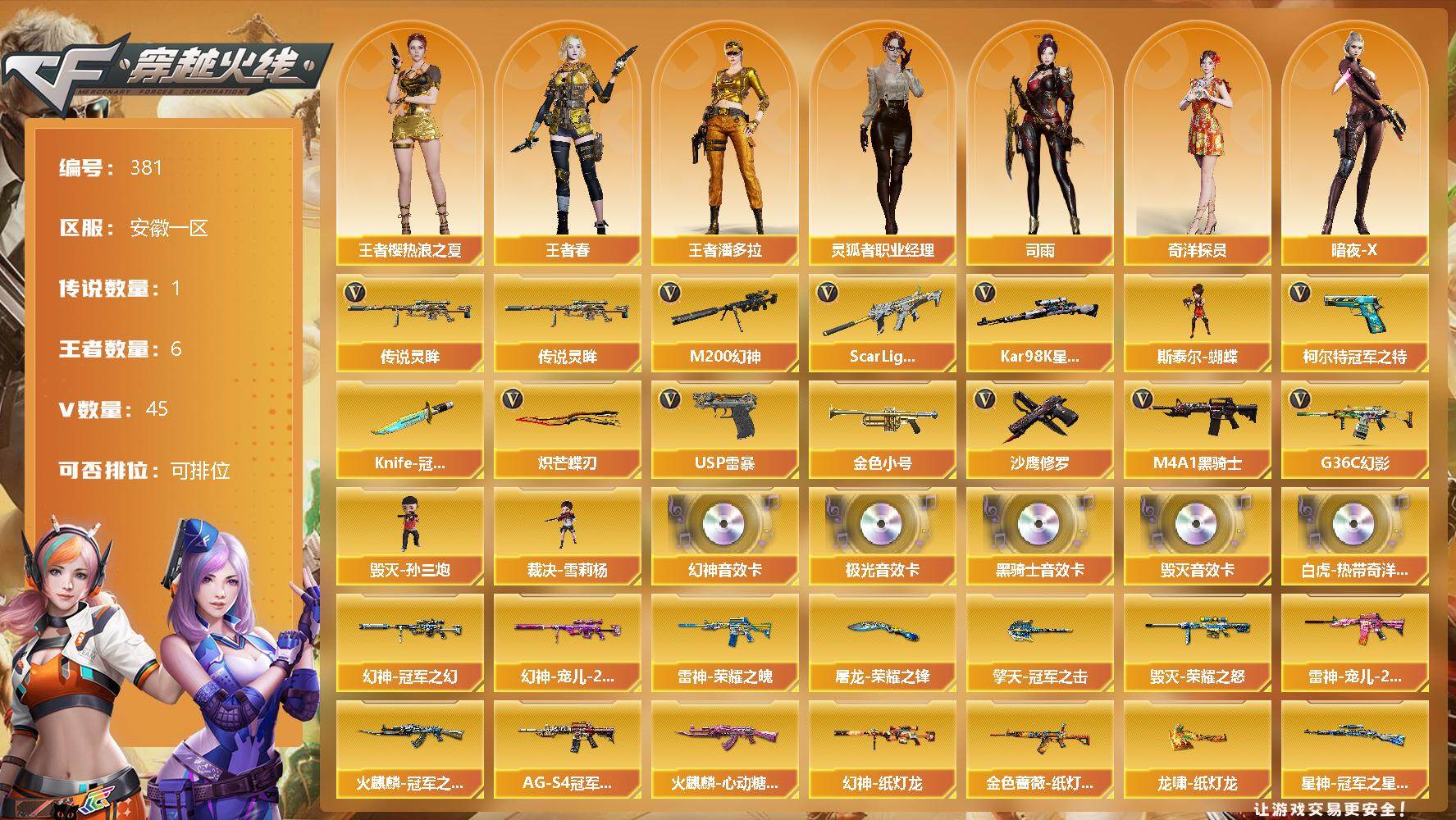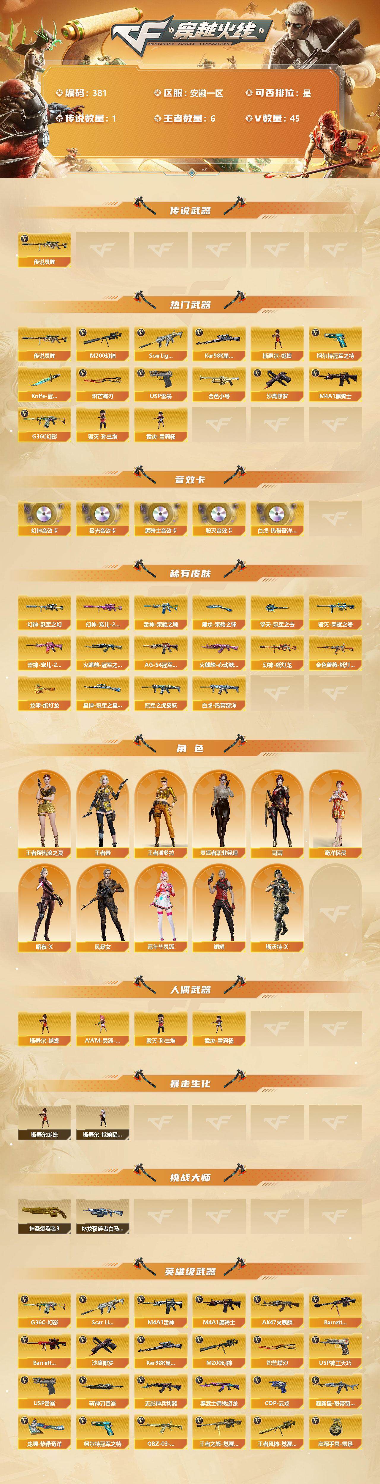 [13107772]安徽一区-45V-6王者-0炫金 【传说武器】:传说灵眸 【热门武器】:传说灵眸,G36C-幻影,Scar Light-白虎,M200-幻神,柯尔特-冠军之特*2,Kar98K-星神,金色小号,M4A1-黑骑士,斯泰尔-蝴蝶,毁灭-孙三炮,裁决-雪莉杨,USP-雷暴,沙鹰-修罗*4,Knife-冠军之刃*2,炽芒蝶刃 【音效卡】:Scar Light-白虎-热带奇洋音效卡,M200-幻神音效卡*2,M4A1-黑骑士音效卡,Barrett-毁灭音效卡,Barrett-极光音效卡 【皮肤】:幻神-冠军之幻,幻神-宠儿-2021MVP,幻神-纸灯龙皮肤,ScarLight-白虎-冠军之虎皮肤,白虎-热带奇洋 皮肤,金色蔷薇-纸灯龙皮肤,Kar98K-星神-冠军之星皮肤,雷神-荣耀之魄,雷神-宠儿-2019MVP,M4A1-雷神-巅峰荣耀皮肤,火麒麟-冠军之心,火麒麟-心动糖果,毁灭-荣耀之怒,黑骑士-AG-S4冠军典藏,超新星-深海萌鲨 皮肤,屠龙-荣耀之锋,龙啸-纸灯龙皮肤,擎天-冠军之击 【角色】:司雨,王者樱-热浪之夏,王者春,王者潘多拉,奇洋探员,暗夜-X,风暴女,嘉年华灵狐,娟娟,灵狐者-职业经理,斯沃特-X 【人偶武器】:毁灭-孙三炮,裁决-雪莉杨,斯泰尔-蝴蝶,AWM-灵狐-15周年嘉年华 【暴走生化】:斯泰尔-蝴蝶,斯泰尔-枪娘暗刃 【挑战大师】:神圣爆裂者III,冰龙粉碎者-白马银枪 【英雄级武器】:AK47-火麒麟,M4A1-雷神,M4A1-黑骑士,Scar Light-白虎,无影-神兵利器,G36C-幻影,黑武士-锦绣游龙,超新星-热带奇洋,QBZ-03-王者蔷薇-觉醒版,Barrett-毁灭,Barrett-极光,M200-幻神,Kar98K-星神,王者之怒-觉醒版,王者风神-觉醒版,沙鹰-修罗*4,USP-雷暴,柯尔特-冠军之特*2,COP 357-云龙,USP-神工天巧,炽芒蝶刃,龙啸-热带奇洋,斩神刀-雷暴,高爆手雷-雷暴*4,高爆手雷-神工天巧*2,高爆手雷-云龙*2,手雷-热带奇洋,闪光弹-雷暴*5,闪光弹-神工天巧,闪光弹-云龙*2,烟雾弹-雷暴*4,烟雾弹-云龙*2 【特殊枪械】:蝴蝶斯泰尔+0烈龙,1白虎,1黑骑士,1蝴蝶斯泰尔