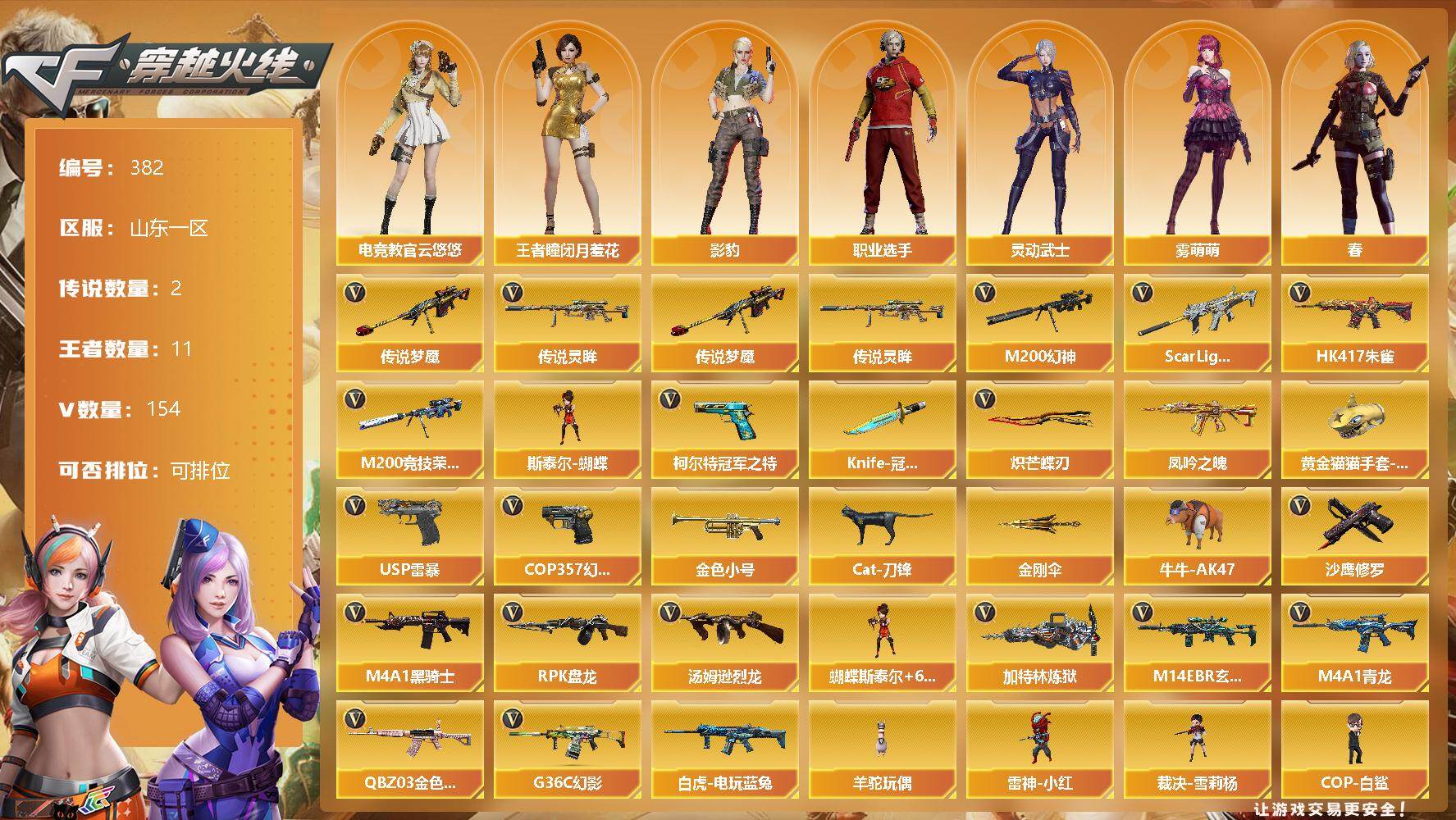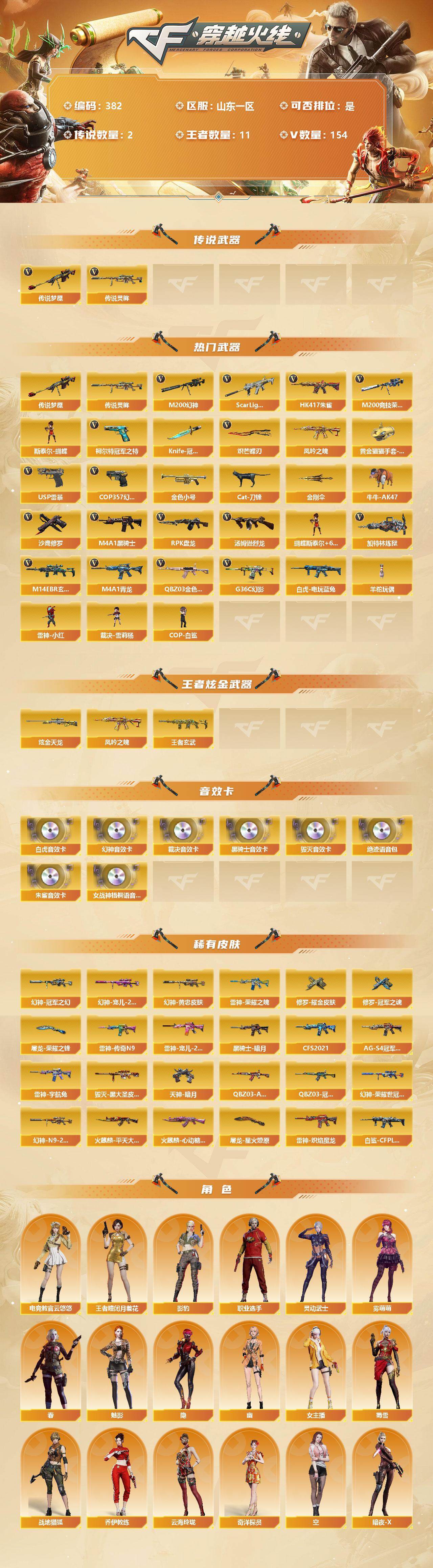 [13107822]山东一区-154V-11王者-1炫金 【传说武器】:传说梦魇,传说灵眸 【热门武器】:传说梦魇,传说灵眸,G36C-幻影,QBZ03-金色蔷薇,M14EBR-玄武,Scar Light-白虎,HK417-朱雀,M4A1-青龙,M200-幻神*2,M200-竞技荣光,凤吟之魄,白虎-电玩蓝兔,柯尔特-冠军之特,金色小号,Cat-刀锋,牛牛-AK47,M4A1-黑骑士*3,汤姆逊-烈龙*6,RPK-盘龙*4,加特林-炼狱*2,斯泰尔-蝴蝶,羊驼玩偶,雷神-小红,裁决-雪莉杨,COP-白鲨,USP-雷暴*2,COP 357-幻灵*2,沙鹰-修罗*7,Knife-冠军之刃*2,炽芒蝶刃,黄金猫猫手套-白鲨,金刚伞 【王者炫金武器】:凤吟之魄,王者玄武,炫金天龙 【音效卡】:M200-幻神音效卡,M4A1-黑骑士音效卡,Barrett-毁灭音效卡,AWM-裁决音效卡,Scar Light-白虎音效卡,绝迹语音包,HK417-朱雀音效卡,女战神梧桐语音包 【皮肤】:M200-幻神-黄忠皮肤,幻神-冠军之幻,幻神-宠儿-2021MVP,M200-幻神-荣耀世冠白鲨,M200-幻神-N9-2022MVP,白虎-白鲨-CFPLS23冠军,QBZ03-冠军之薇,QBZ03-AG-CFPLS19冠军,AWM-裁决-凤灵皮肤,裁决-巅峰荣耀 皮肤,雷神-暗月*2,雷神-荣耀之魄,雷神-传奇N9,雷神-宠儿-2019MVP,雷神-机甲刑天皮肤,雷神-宇航兔皮肤,雷神-炽焰魔龙,雷神-云海游龙皮肤,雷神-源计划2.0专属 皮肤,火麒麟-平天大圣*2,火麒麟-虎牙平台皮肤,火麒麟-心动糖果,毁灭-黑大圣皮肤*2,M4A1-千变-孔明皮肤,黑骑士-暗月,黑骑士-CFS2021,黑骑士-AG-S4冠军典藏,无影-能量核心,战神-紫绶金章皮肤,战神-流金岁月皮肤*2,极光-能量核心,修罗耀金皮肤,修罗-冠军之魂,修罗-15周年嘉年华 皮肤,天神-暗月,屠龙-荣耀之锋,屠龙-QQ会员,屠龙-星火燎原,麒麟刺-萌杀皮肤 【角色】:魅影,春,影豹,电竞教官-云悠悠,雾萌萌,隐,战地猎狐,王者-瞳-闭月羞花,奇洋探员,乔伊教练,云海玲珑,空,暗夜-X,初恋灵狐,飞虎队-X,风暴女,虎妞,嘉年华灵狐,娟娟,兰-新年限定,灵动武士,灵狐者-X,灵狐者-七夕宝贝,龙儿-小淘气,曼陀罗-X,曼陀罗-礼服,女主播,潘