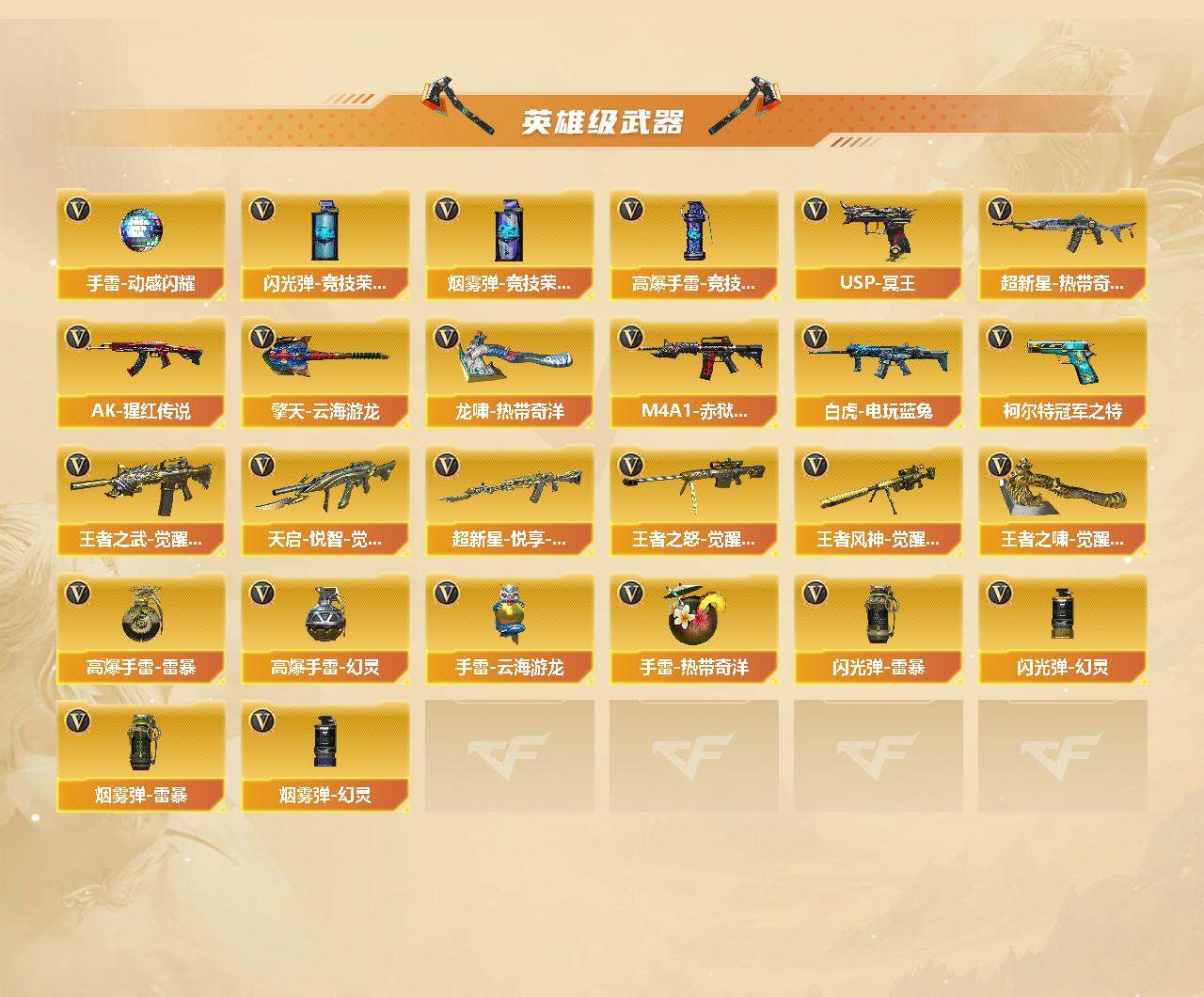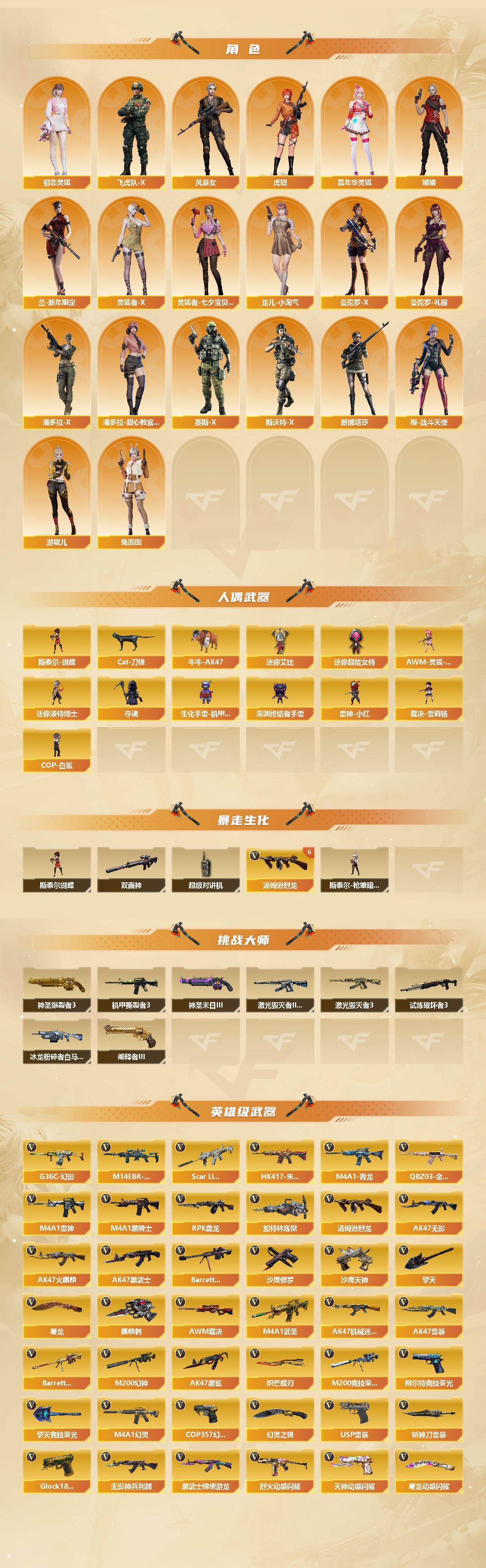 【热门武器】:传说梦魇,传说灵眸,G36C-幻影,QBZ03-金色蔷薇,M14EBR-玄武,Scar Light-白虎,HK417-朱雀,M4A1-青龙,M200-幻神*2,M200-竞技荣光,凤吟之魄,白虎-电玩蓝兔,柯尔特-冠军之特,金色小号,Cat-刀锋,牛牛-AK47,M4A1-黑骑士*3,汤姆逊-烈龙*6,RPK-盘龙*4,加特林-炼狱*2,斯泰尔-蝴蝶,羊驼玩偶,雷神-小红,裁决-雪莉杨,COP-白鲨,USP-雷暴*2,COP 357-幻灵*2,沙鹰-修罗*7,Knife-冠军之刃*2,炽芒蝶刃,黄金猫猫手套-白鲨,金刚伞