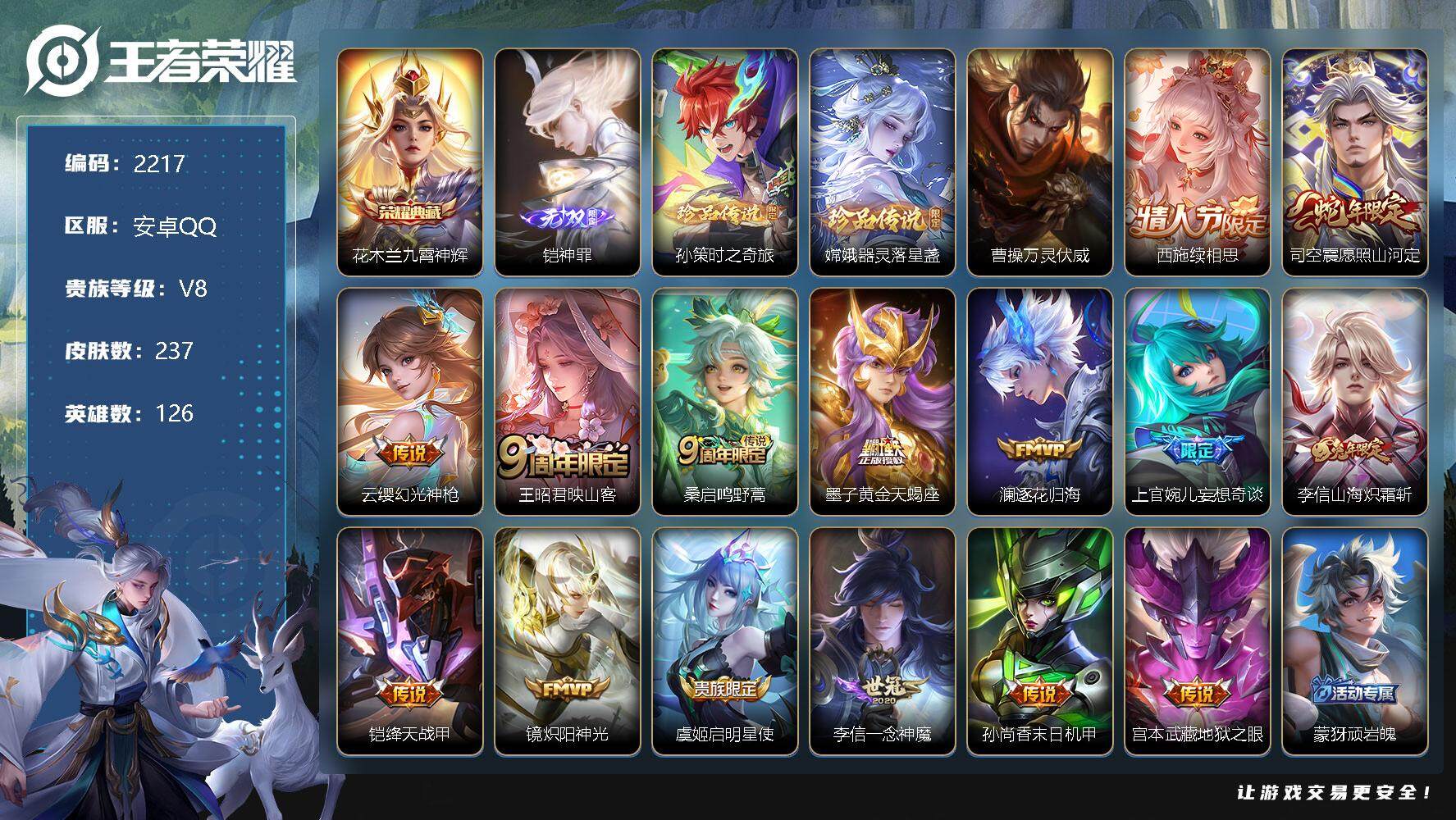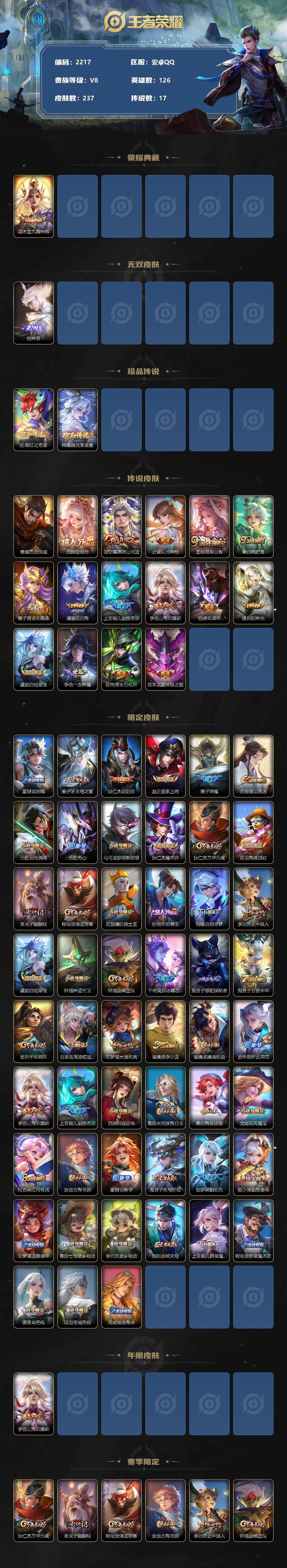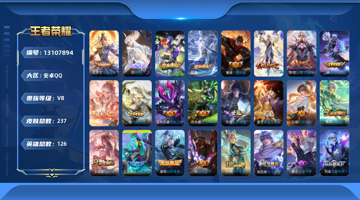 [13107894]安卓Q-V8-最强王者段位-126英雄-237皮肤-1典藏-0珍品无双-1无双-2珍品传说-17传说-72史诗