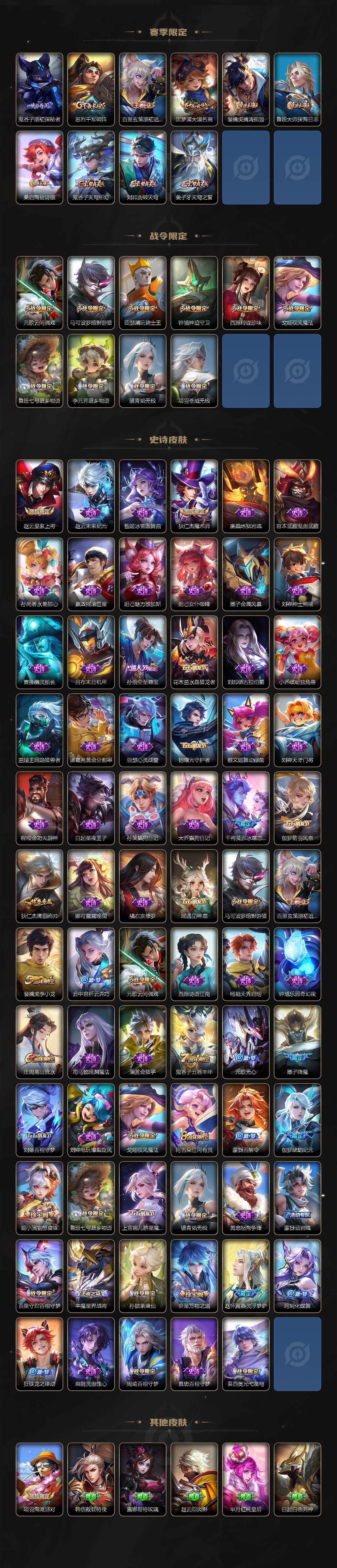 【赛季限定】:狄仁杰万华元夜,老夫子醍醐杖,程咬金演武夺筹,张良古海寻踪,李元芳云中旅人,钟馗驱傩正仪,鬼谷子原初探秘者,苏烈千军破阵,百里玄策原初追逐者,沈梦溪大漠名商,裴擒虎擒涛扼浪,鲁班大师探海日志,桑启海盐诗旅,鬼谷子天穹祈灯,刘邦剑破天穹,姜子牙天穹之誓