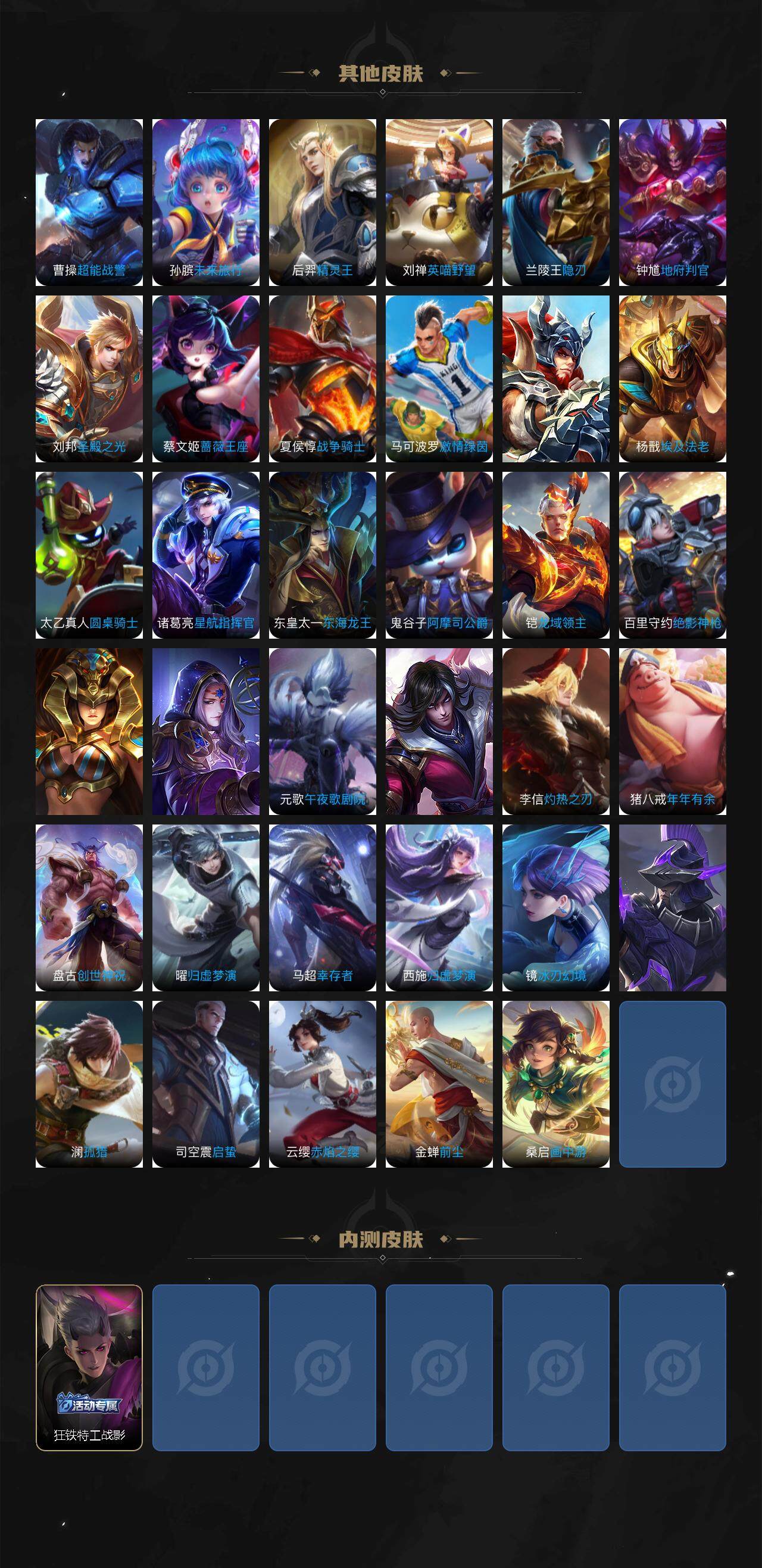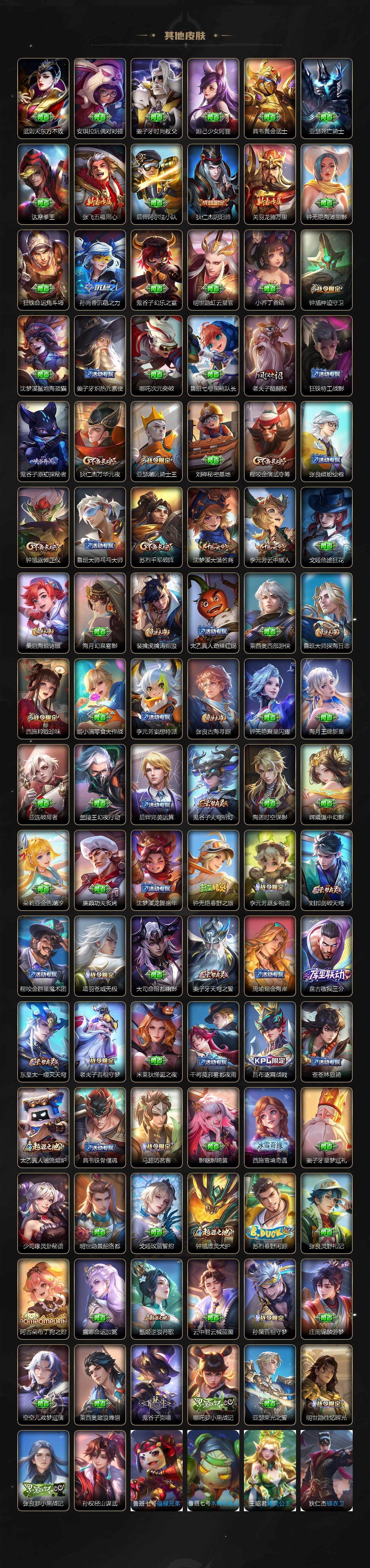 瑶遇见神鹿,娜可露露晚萤,伽罗箭羽风息,大乔猫狗日记,孙策猫狗日记,诸葛亮黄金分割率,吕布末日机甲,橘右京修罗,嬴政摇滚巨星,刘禅绅士熊喵,刘禅天才门将,白起星夜王子,程咬金功夫厨神,刘邦德古拉伯爵,兰陵王暗隐猎兽者,曹操幽灵船长,宫本武藏鬼剑武藏,司马懿暗渊魔法,亚瑟心灵战警,钟馗乐园奇幻夜,杨戬天秀·启明,蔡文姬舞动绿茵,廉颇地狱岩魂,西施诗语江南,小乔缤纷独角兽,花木兰水晶猎龙者,铠曙光守护者,墨子金属风暴,百里玄策原初追逐者,澜赏金猎手,刘备百相守梦,刘禅电玩·爆裂旋风,蒙犽百解令,伽罗琥珀纪元,上官婉儿群星魔术团,赵怀真器灵·浮梦炉