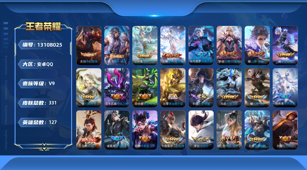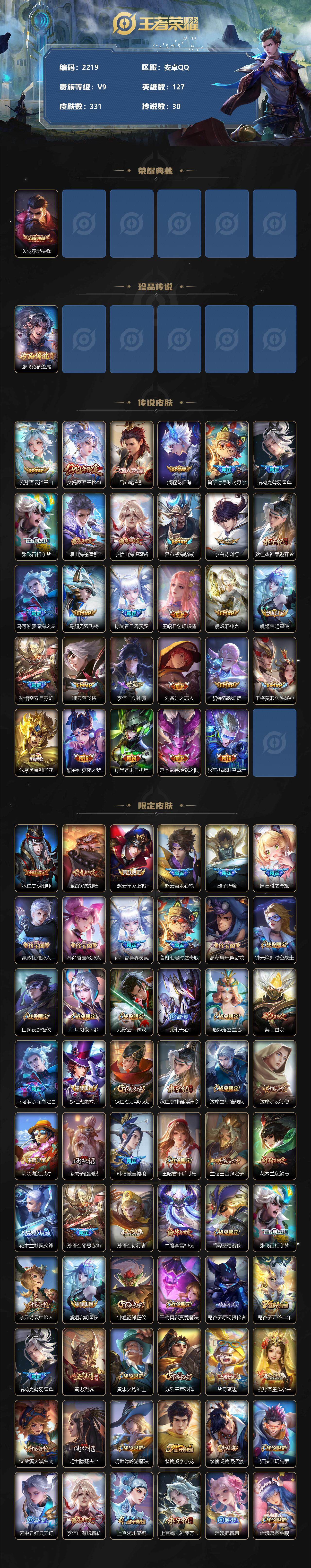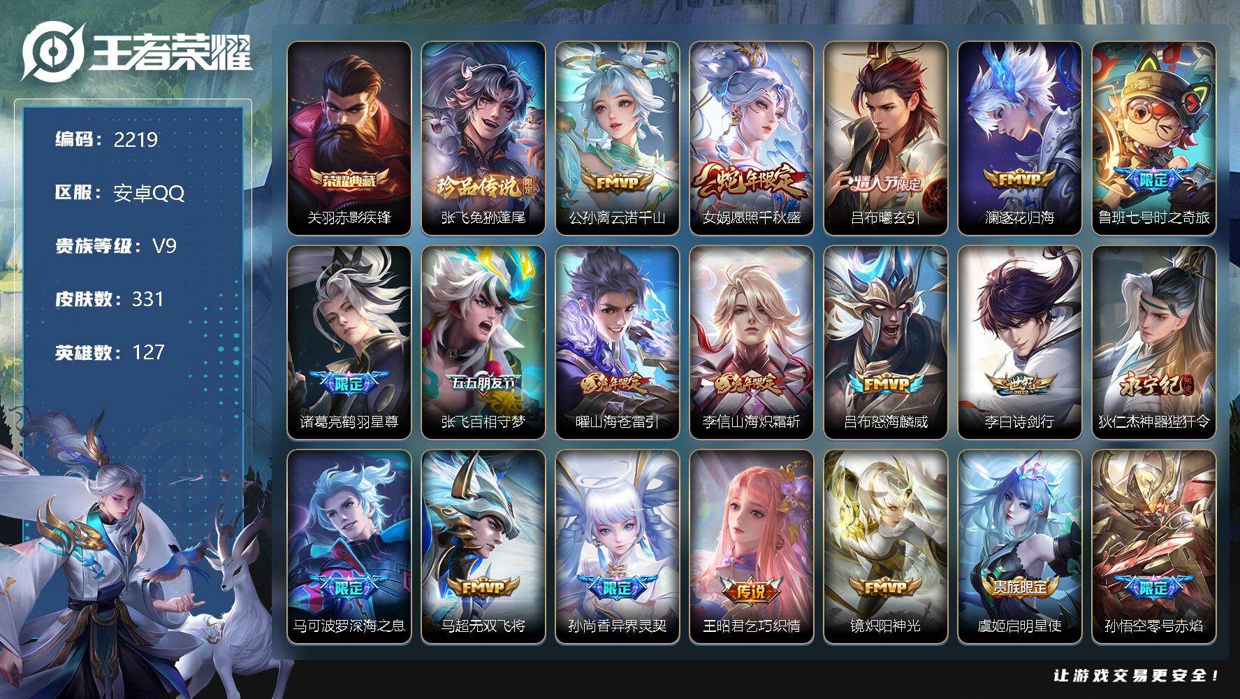 [13108025]安卓Q-V9-最强王者段位-127英雄-331皮肤-1典藏-0珍品无双-0无双-1珍品传说-30传说-106史诗