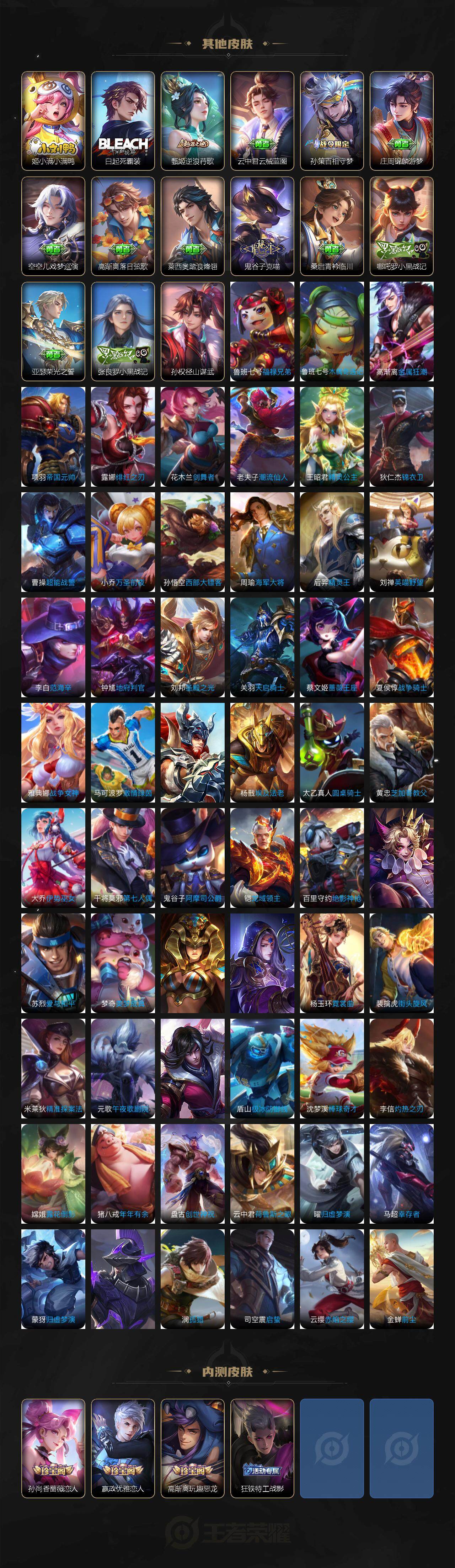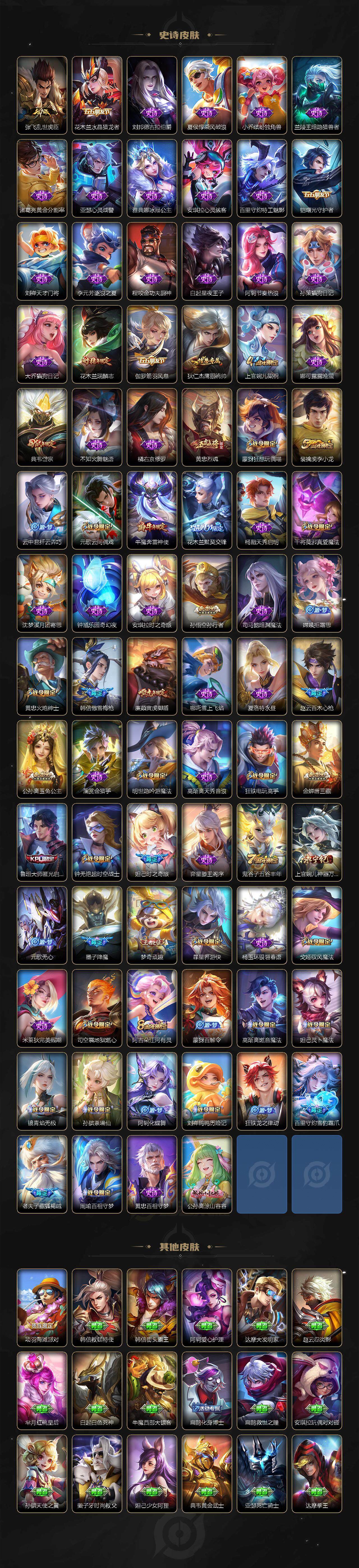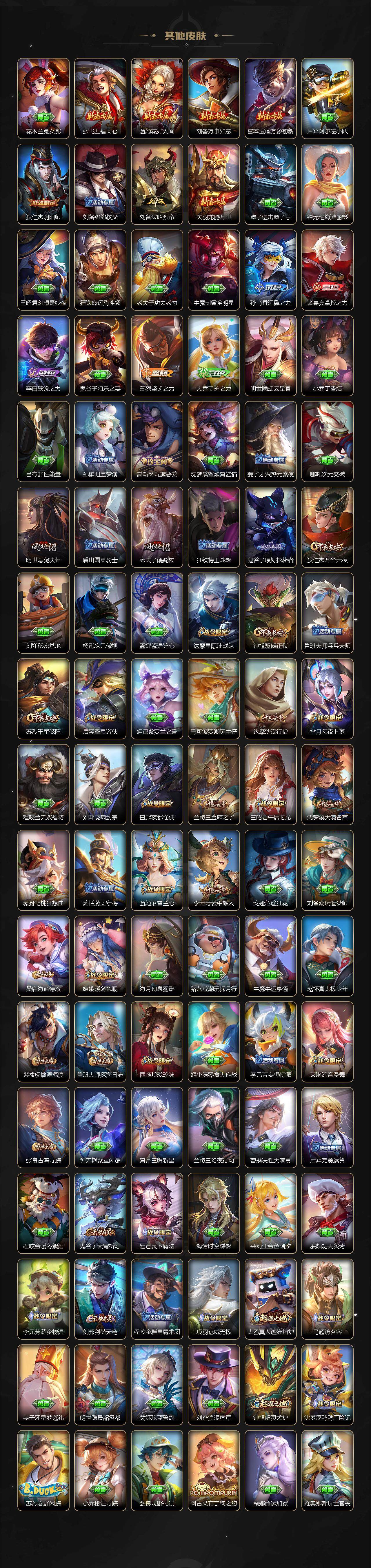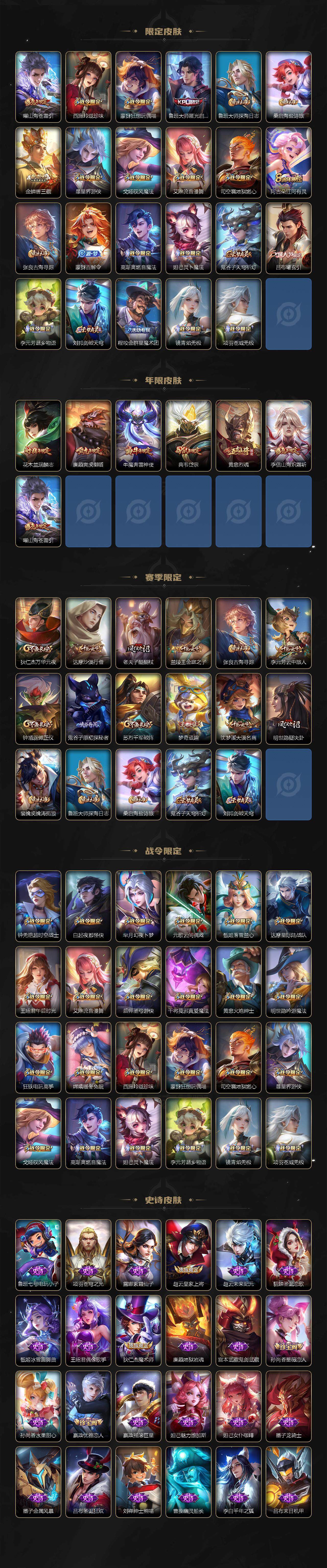 【限定皮肤】:狄仁杰阴阳师,廉颇寅虎御盾,赵云皇家上将,赵云百木心枪,墨子降魔,妲己时之奇旅,嬴政优雅恋人,孙尚香蔷薇恋人,孙尚香异界灵契,鲁班七号时之奇旅,高渐离玩趣恶龙,钟无艳超时空战士,白起夜都怪侠,芈月幻夜卜梦,元歌云间偶戏,元歌无心,甄姬落雪兰心,典韦岱宗,马可波罗深海之息,狄仁杰魔术师,狄仁杰万华元夜,狄仁杰神器狴犴令,达摩星际陆战队,达摩沙漠行僧,项羽海滩派对,老夫子醍醐杖,韩信傲雪梅枪,王昭君午后时光,兰陵王金庭之子,花木兰瑞麟志,花木兰默契交锋,孙悟空零号赤焰,孙悟空孙行者,牛魔奔雷神使,后羿圣弓游侠,张飞百相守梦,李元芳云中旅人,虞姬启明星使,钟馗驱傩正仪,干将莫邪真爱魔法,鬼谷子原初探秘者,鬼谷子五谷丰年,诸葛亮鹤羽星尊,黄忠烈魂,黄忠火炮绅士,苏烈千军破阵,梦奇顽趣,公孙离玉兔公主,沈梦溪大漠名商,明世隐疑决卦,明世隐吟游魔法,裴擒虎李小龙,裴擒虎擒涛扼浪,狂铁电玩高手,云中君纤云弄巧,李信山海炽霜斩,上官婉儿梁祝,上官婉儿神器万象笔,嫦娥拒霜思,嫦娥暖冬兔眠,曜山海苍雷引,西施玲珑珍味,蒙犽狂想玩偶喵,鲁班大师匿光启智者,鲁班大师探海日志,桑启海盐诗旅,金蝉唐三藏,暃星界游侠,戈娅驭风魔法,艾琳流音漫舞,司空震地狱燃心,阿古朵江河有灵,张良古海寻踪,蒙犽百解令,高渐离燃音魔法,妲己灵卜魔法,鬼谷子天穹祈灯,吕布曦玄引,李元芳蔬乡物语,刘邦剑破天穹,程咬金群星魔术团,镜青焰无极,项羽苍威无极