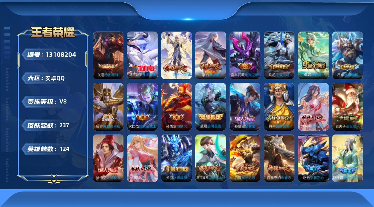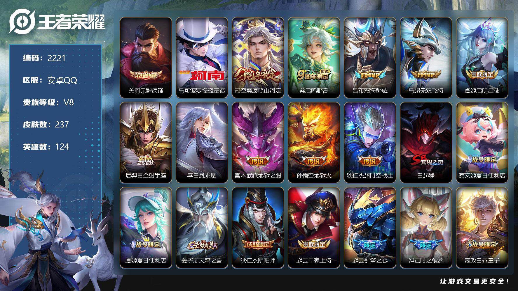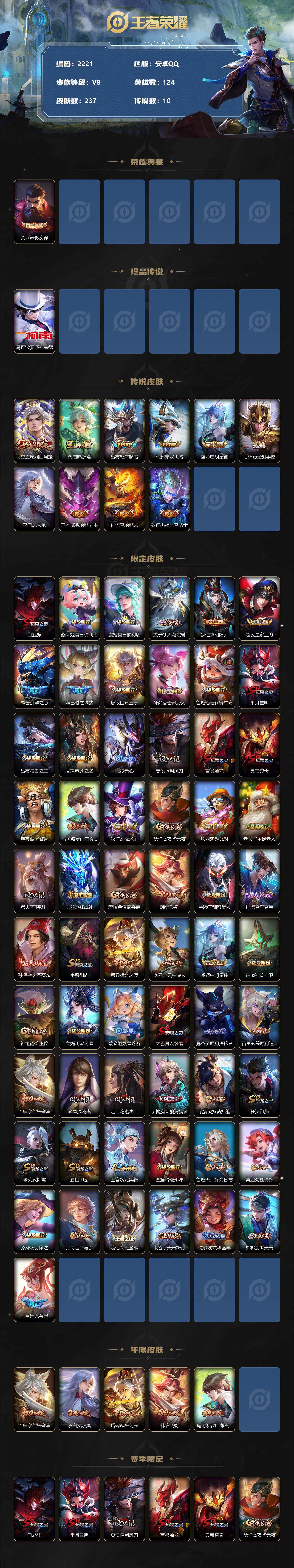 [13108204]安卓Q-V8-永恒钻石V段位-124英雄-237皮肤-1典藏-0珍品无双-0无双-1珍品传说-10传说-66史诗