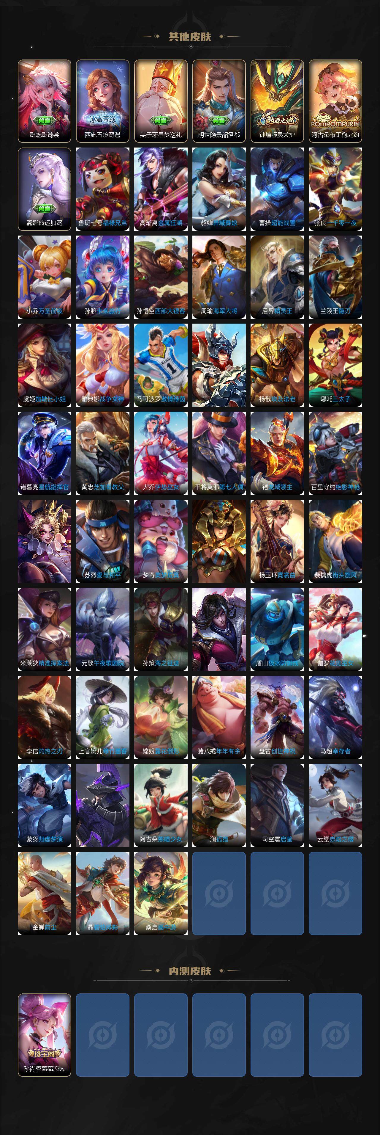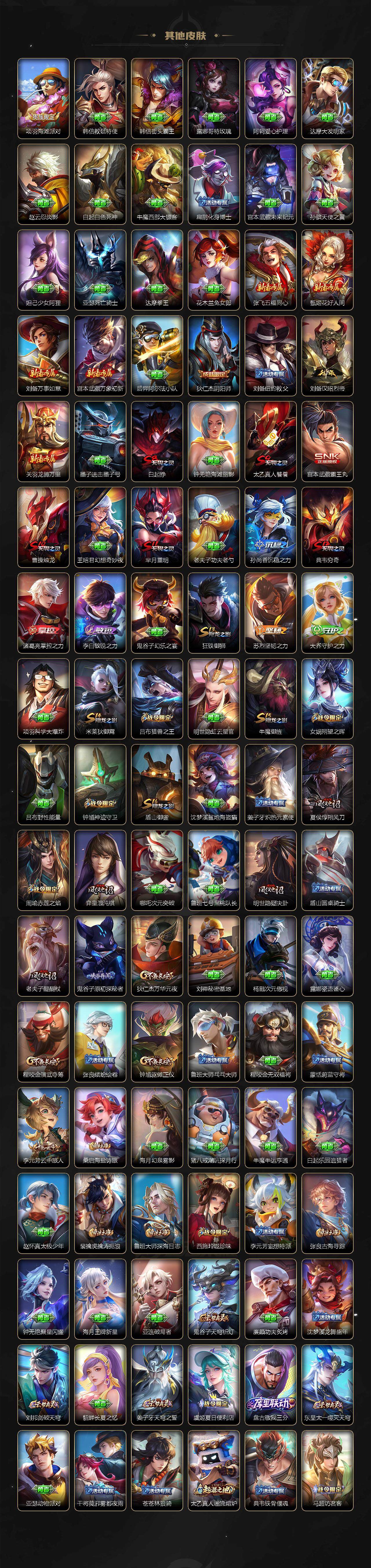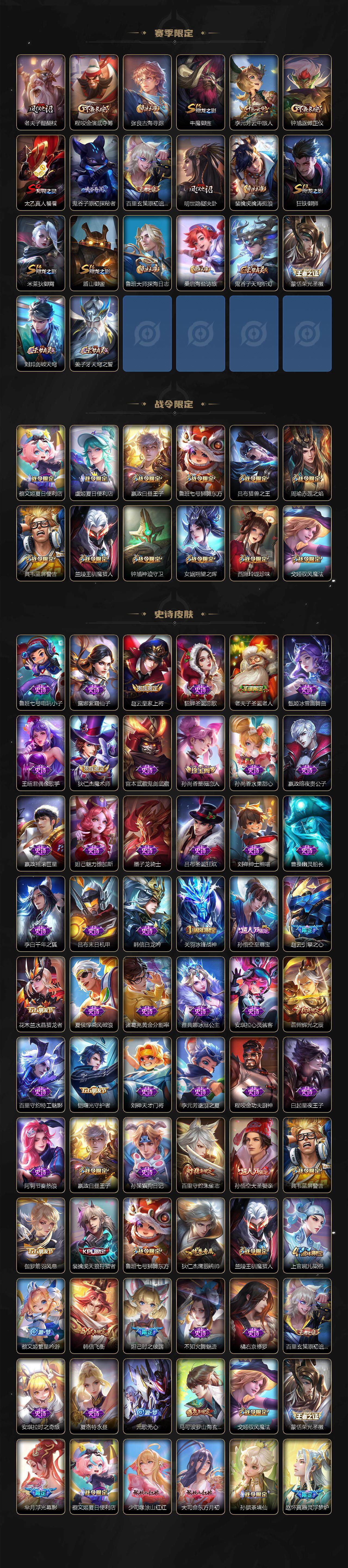 【限定皮肤】:白起狰,蔡文姬夏日便利店,虞姬夏日便利店,姜子牙天穹之誓,狄仁杰阴阳师,赵云皇家上将,赵云引擎之心,妲己时之彼端,嬴政白昼王子,孙尚香蔷薇恋人,鲁班七号狮舞东方,芈月重明,吕布猎兽之王,周瑜赤莲之焰,元歌无心,夏侯惇朔风刀,曹操烛龙,典韦穷奇,典韦蓝屏警告,马可波罗山海玄木吟,狄仁杰魔术师,狄仁杰万华元夜,项羽海滩派对,老夫子圣诞老人,老夫子醍醐杖,关羽冰锋战神,程咬金演武夺筹,韩信飞衡,兰陵王驯魔猎人,孙悟空至尊宝,孙悟空大圣娶亲,牛魔御旌,后羿辉光之辰,李元芳云中旅人,虞姬启明星使,钟馗神迹守卫,钟馗驱傩正仪,女娲朔望之晖,蔡文姬繁星吟游,太乙真人饕餮,鬼谷子原初探秘者,百里玄策原初追逐者,百里守约朱雀志,弈星混沌棋,明世隐疑决卦,裴擒虎天狼狩猎者,裴擒虎擒涛扼浪,狂铁御狮,米莱狄御霄,盾山御銮,上官婉儿梁祝,西施玲珑珍味,鲁班大师探海日志,桑启海盐诗旅,戈娅驭风魔法,张良古海寻踪,蒙恬荣光圣徽,鬼谷子天穹祈灯,沈梦溪龙舞盛年,刘邦剑破天穹,芈月浮光幕影