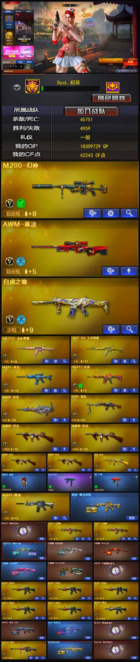 【热门武器】:QBZ03-金色蔷薇,HK417-朱雀,M4A1-青龙,M200-幻神,死亡之眼,Cat-刀锋,M4A1-黑骑士*5,汤姆逊-烈龙*4,RPK-盘龙,加特林-炼狱,斯泰尔-蝴蝶,火麒麟-绝迹,COP-白鲨,沙鹰-修罗*4,金刚伞*2