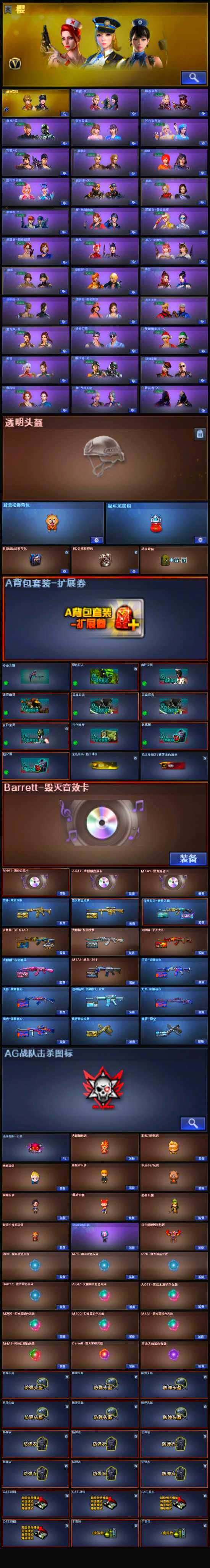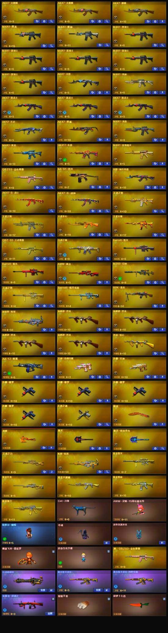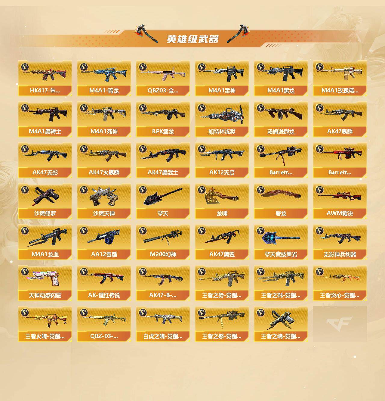 【英雄级武器】:AK47-火麒麟*2,AK47-麒麟,M4A1-黑龙,M4A1-雷神,M4A1-黑骑士*5,AK47-无影,M4A1-死神,AK47-黑武士*3,AK12-天启,AK47-黑鲨,M4A1-龙血,M4A1-青龙,HK417-朱雀,无影-神兵利器,M4A1-玫瑰精灵,QBZ03-金色蔷薇,王者之势-觉醒版,王者之戮-觉醒版,AK-47-猩红传说,AK47-B-战神,王者炎心-觉醒版,王者火魄-觉醒版,QBZ-03-王者蔷薇-觉醒版,白虎之魄-觉醒版,Barrett-毁灭,