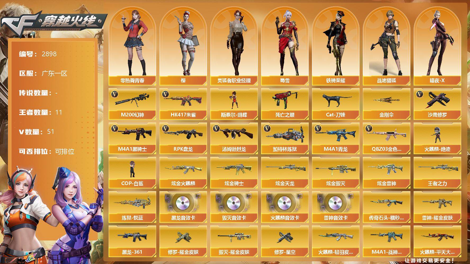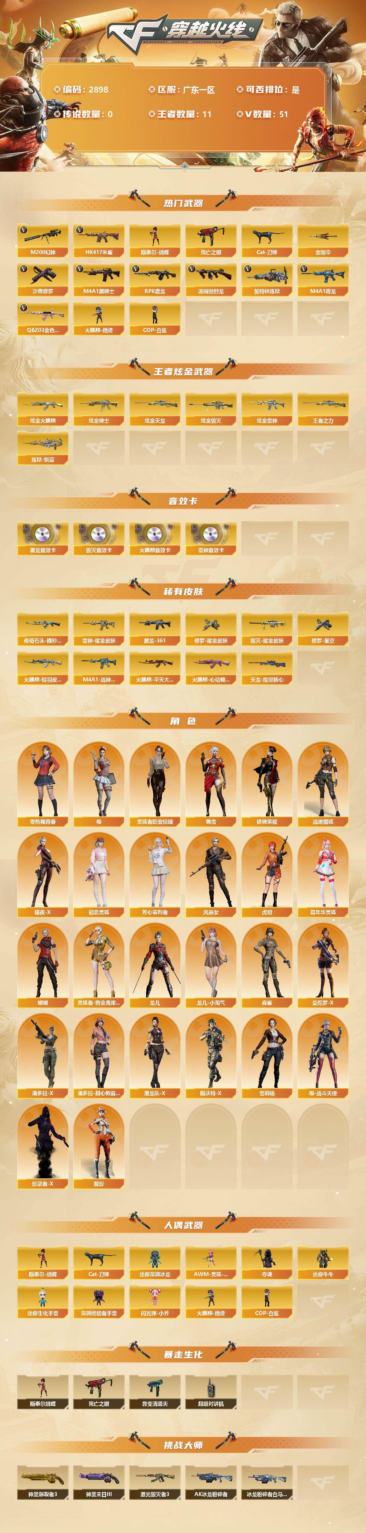 [13108188]广东一区-51V-11王者-5炫金 【热门武器】:QBZ03-金色蔷薇,HK417-朱雀,M4A1-青龙,M200-幻神,死亡之眼,Cat-刀锋,M4A1-黑骑士*5,汤姆逊-烈龙*4,RPK-盘龙,加特林-炼狱,斯泰尔-蝴蝶,火麒麟-绝迹,COP-白鲨,沙鹰-修罗*4,金刚伞*2 【王者炫金武器】:王者之力,炼狱-悦蓝,炫金火麒麟,炫金骑士,炫金天龙,炫金毁灭,炫金雷神 【音效卡】:AK47-火麒麟音效卡,M4A1-雷神音效卡,M4A1-黑龙音效卡,Barrett-毁灭音效卡 【皮肤】:雷神-耀金皮肤,M4A1-战神赵云,火麒麟-轻羽皮肤,传奇石头-横秒之巅,火麒麟-平天大圣,火麒麟-心动糖果,毁灭耀金皮肤,M4A1-千变-孔明皮肤*2,黑龙-能量核心,M4A1-黑龙-361,无影-能量核心,玫瑰精灵-蓝调梦幻 皮肤,战神-粉色甜心皮肤,战神-紫绶金章皮肤,战神-流金岁月皮肤,天龙-能量核心,AWM-再燃火线,极光-能量核心,修罗耀金皮肤,修罗-星空 【角色】:樱,战地猎狐,暗夜-X,初恋灵狐,芳心审判者,风暴女,虎妞,嘉年华灵狐,娟娟,零-热舞青春,灵狐者-黄金海岸,灵狐者-职业经理,龙儿,龙儿-小淘气,麻雀,曼陀罗-X,潘多拉-X,潘多拉-甜心教官,潜龙队-X,斯沃特-X,蜀雪,铁骑荣耀,雪莉杨,樱-战斗天使,影武者-X,智影 【人偶武器】:火麒麟-绝迹,COP-白鲨,斯泰尔-蝴蝶,AWM-灵狐-15周年嘉年华,Cat-刀锋,迷你深渊冰龙,夺魂,迷你牛牛,迷你生化手雷,深渊终结者手雷,闪光弹-小乔 【暴走生化】:异变清道夫,斯泰尔-蝴蝶,死亡之眼,超级对讲机 【挑战大师】:AK47-冰龙粉碎者,神圣爆裂者III,冰龙粉碎者-白马银枪,激光毁灭者III,神圣爆裂者-末日III*2 【英雄级武器】:AK47-火麒麟*2,AK47-麒麟,M4A1-黑龙,M4A1-雷神,M4A1-黑骑士*5,AK47-无影,M4A1-死神,AK47-黑武士*3,AK12-天启,AK47-黑鲨,M4A1-龙血,M4A1-青龙,HK417-朱雀,无影-神兵利器,M4A1-玫瑰精灵,QBZ03-金色蔷薇,王者之势-觉醒版,王者之戮-觉醒版,AK-47-猩红传说,AK47-B-战神,王者炎心-觉醒版,王者火魄-觉醒版,QBZ-03-王者蔷薇-觉醒版,白虎之魄-觉醒版,Barrett-毁灭,