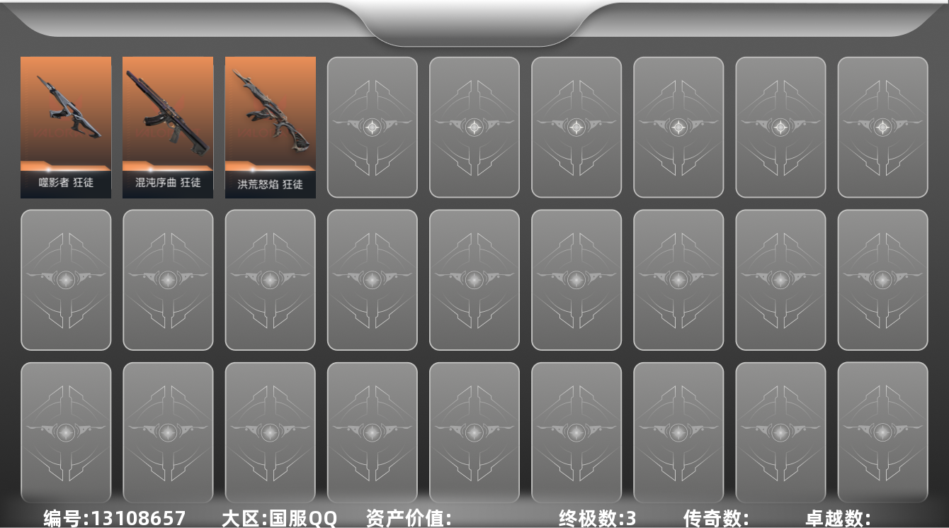 [13108657]【英雄】:幻棱,炼狱,暮蝶,壹决,捷风,幽影,不死鸟,贤者,猎枭,零,芮娜,尚勃勒,霓虹,夜露,K/O,盖可,黑梦 【狂徒】:狂徒-洪荒怒焰,狂徒-混沌序曲,狂徒-噬影者 【卡面】:无畏契约GO!第一卷:芮娜 卡面,无畏契约GO!第一卷:零 卡面,代号红色 卡面,新兵报到 卡面,V契约 卡面,无畏契约 卡面 【喷漆】:买装还是存钱 喷漆,胜利属于无畏契约 喷漆,GLHF 喷漆,无畏契约 喷漆 【挂饰】:天外飞客 挂饰,无畏契约 纪念币 挂饰