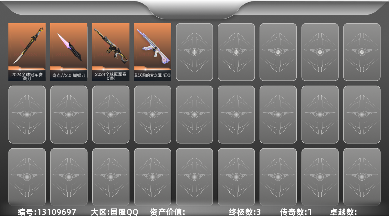 [13109697]【套装】:2024全球冠军赛套装 【英雄】:炼狱,维斯,暮蝶,壹决,捷风,不死鸟,贤者,猎枭,零,芮娜,奇乐,尚勃勒,夜露,黑梦,钢锁 【近战 武器】:近战武器-2024全球冠军赛 战刀,近战武器-奇点//2.0 蝴蝶刀 【狂徒】:狂徒-艾沃莉的梦之翼 【幻影】:幻影-2024全球冠军赛 【卡面】:修车达人 卡面,正义的化身 卡面,2024全球冠军赛 卡面,时间到 卡面,最高舞台 卡面,声感陷阱设计图 卡面,梦幻奶茶 卡面,源能反应 卡面,零点嗅探设计图 卡面,无畏契约GO!第一卷:芮娜 卡面,无畏契约GO!第一卷:零 卡面,无垠星环 卡面,"Luie" 卡面,铁臂设计图 卡面,代号红色 卡面,冰淇淋店 卡面,新兵报到 卡面,友军火力 卡面,V契约 卡面,无畏契约 卡面 【喷漆】:小丑猫 喷漆,熊抱 喷漆,2024全球冠军赛 喷漆,超级粉丝 喷漆,捷风差距 喷漆,惊声尖叫 喷漆,拼一枪 喷漆,我的刀呢? 喷漆,买装还是存钱 喷漆,胜利属于无畏契约 喷漆,GLHF 喷漆,无畏契约 喷漆 【挂饰】:V25第三幕:超凡 挂饰,工具腰带 挂饰,无畏契约GO!第一卷 芮娜 挂饰,无畏契约GO!第一卷 零 挂饰,熔岩灯 挂饰,第九季//第二幕 纪念币 挂饰,2024全球冠军赛 挂饰,袖珍捷风 挂饰,迷你浓缩 挂饰,第九季//第一幕 纪念币 挂饰,第八季//第三幕 纪念币 挂饰,好运福爪 挂饰,第七季//第三幕 纪念币 挂饰,无畏契约 纪念币 挂饰