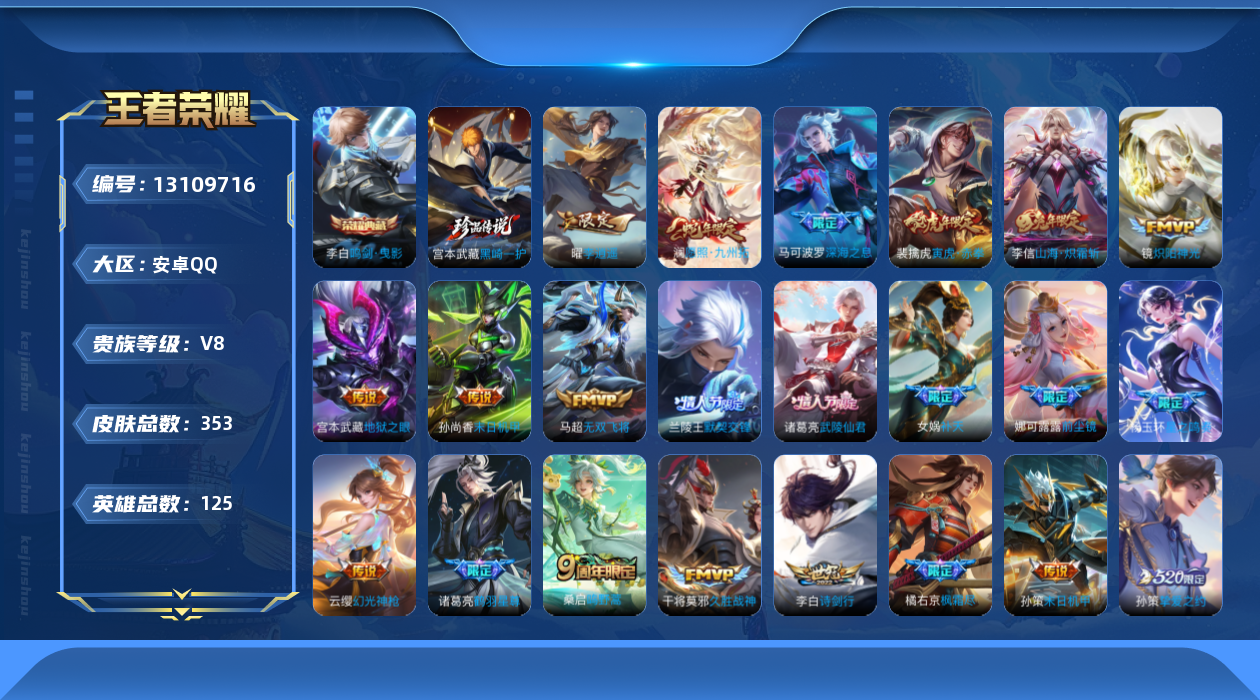 [13109716]安卓Q-V8-最强王者段位-125英雄-353皮肤-1典藏-0珍品无双-0无双-1珍品传说-28传说-106史诗 【荣耀典藏】:李白鸣剑曳影 【珍品传说】:宫本武藏黑崎一护 【传说皮肤】:杨玉环星之鸣奏,澜愿照九州拓,云缨幻光神枪,桑启鸣野蒿,诸葛亮鹤羽星尊,李信山海炽霜斩,李白诗剑行,橘右京枫霜尽,娜可露露前尘镜,马可波罗深海之息,马超无双飞将,孙策挚爱之约,露娜启示之音,女娲补天,孙策末日机甲,裴擒虎寅虎赤拳,王昭君乞巧织情,曜李逍遥 ,兰陵王默契交锋,铠绛天战甲,镜炽阳神光,虞姬启明星使,张良黄金白羊座,干将莫邪久胜战神,花木兰冠军飞将,诸葛亮武陵仙君,孙尚香末日机甲,宫本武藏地狱之眼 【限定皮肤】:姜子牙天穹之誓,狄仁杰阴阳师,赵云皇家上将,赵云百木心枪,墨子神迹守卫,嬴政优雅恋人,庄周高山流水,高渐离死亡摇滚,高渐离玩趣恶龙,钟无艳超时空战士,扁鹊奇幻香踪,白起夜都怪侠,芈月幻夜卜梦,元歌云间偶戏,元歌无心,夏侯惇朔风刀,甄姬落雪兰心,马可波罗深海之息,狄仁杰魔术师,狄仁杰万华元夜,达摩沙漠行僧,项羽海滩派对,老夫子醍醐杖,老夫子航海奇遇记,关羽百相守梦,程咬金演武夺筹,露娜一生所爱,露娜启示之音,韩信逐梦之影,韩信飞衡,韩信傲雪梅枪,王昭君午后时光,兰陵王默契交锋,兰陵王金庭之子,花木兰青春决赛季,娜可露露前尘镜,橘右京枫霜尽,亚瑟潮玩骑士王,孙悟空至尊宝,刘备百相守梦,李元芳云中旅人,虞姬启明星使,钟馗驱傩正仪,杨玉环遇见飞天,杨戬潮玩骑兵,女娲补天,雅典娜单词大作战,雅典娜黎明之约,蔡文姬繁星吟游,鬼谷子原初探秘者,鬼谷子五谷丰年,诸葛亮武陵仙君,诸葛亮鹤羽星尊,黄忠火炮绅士,苏烈千军破阵,百里玄策原初追逐者,百里守约朱雀志,弈星混沌棋,梦奇顽趣,公孙离玉兔公主,沈梦溪大漠名商,明世隐疑决卦,明世隐吟游魔法,裴擒虎李小龙,裴擒虎寅虎赤拳,裴擒虎擒涛扼浪,狂铁电玩高手,云中君纤云弄巧,云中君时之祈愿,李信山海炽霜斩,盾山御銮,孙策挚爱之约,猪八戒猪悟能,上官婉儿梁祝,嫦娥拒霜思,嫦娥暖冬兔眠,曜李逍遥 ,西施玲珑珍味,蒙犽狂想玩偶喵,鲁班大师探海日志,桑启海盐诗旅,暃星界游侠,戈娅驭风魔法,艾琳女武神,艾琳流音漫舞,司空震地狱燃心,阿古朵江河有灵,张良古海寻踪,蒙犽百解令,蒙恬荣光圣徽,高渐离燃音魔法,妲己灵卜魔法,鬼谷子天穹祈灯,沈梦溪龙舞盛年,刘