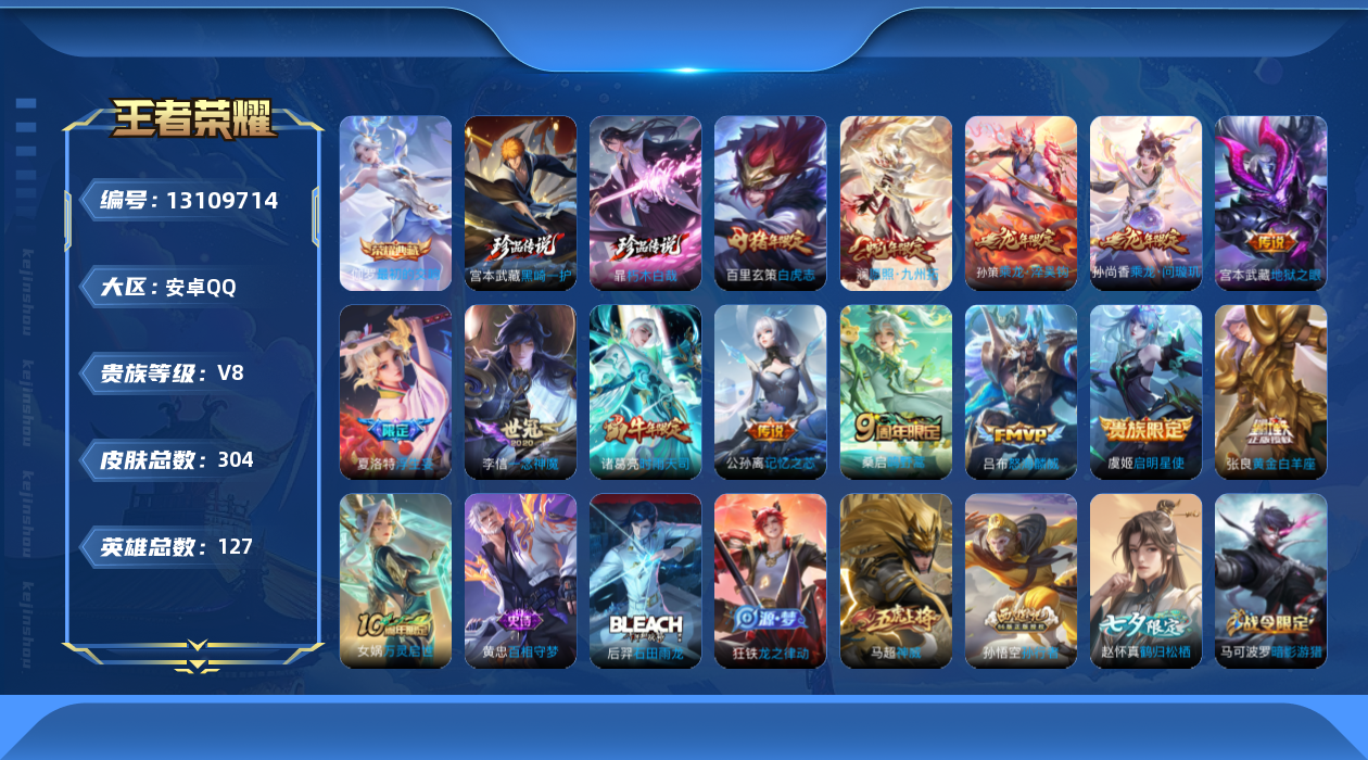 - PX_2077597-实名:,可修改,贵族等级:,V8,英雄数:,121,皮肤数:,278,荣耀水晶:,杀手不太冷,星传说:,幽冥火,金色仲夏夜,传说皮:,久胜战神,炽阳神光,一念神魔,地狱火,仲夏夜之梦,李逍遥,游龙清影,碎云,限定皮:,遇见飞天,李小龙,梁祝,引擎之心,天狼溯光者,神威,时之彼端,逐梦之音,青春决赛季,逐梦之星,凤求凰,美猴王,朱雀志,至尊宝,默契交锋-花木兰,高山流水,补天,