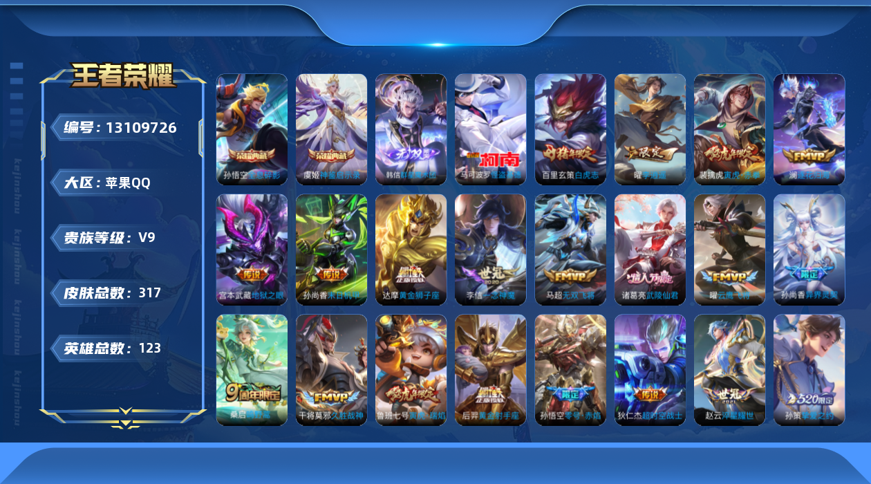 [13109726]苹果Q-V4-荣耀黄金I段位-123英雄-317皮肤-2典藏-0珍品无双-1无双-1珍品传说-22传说-103史诗