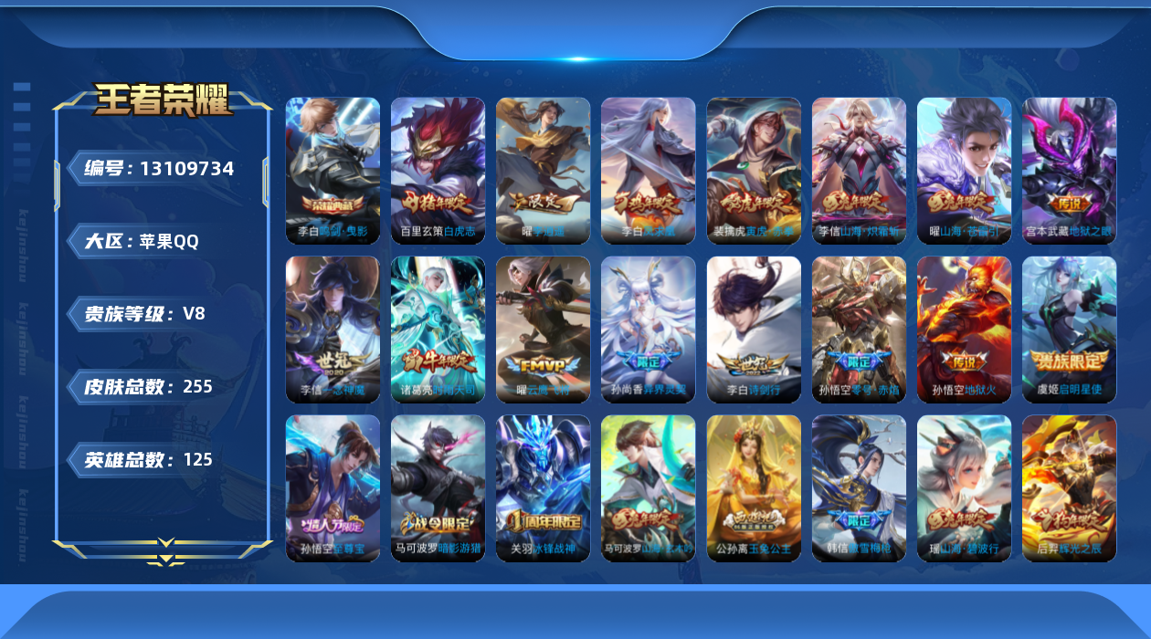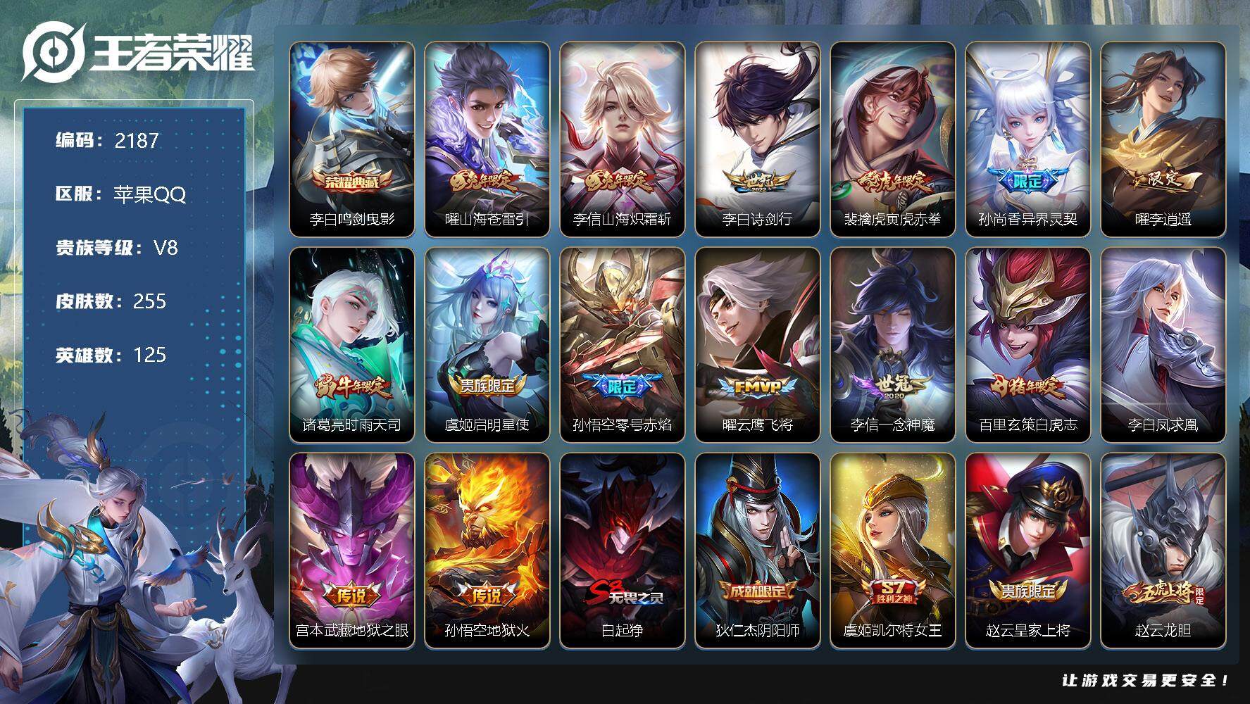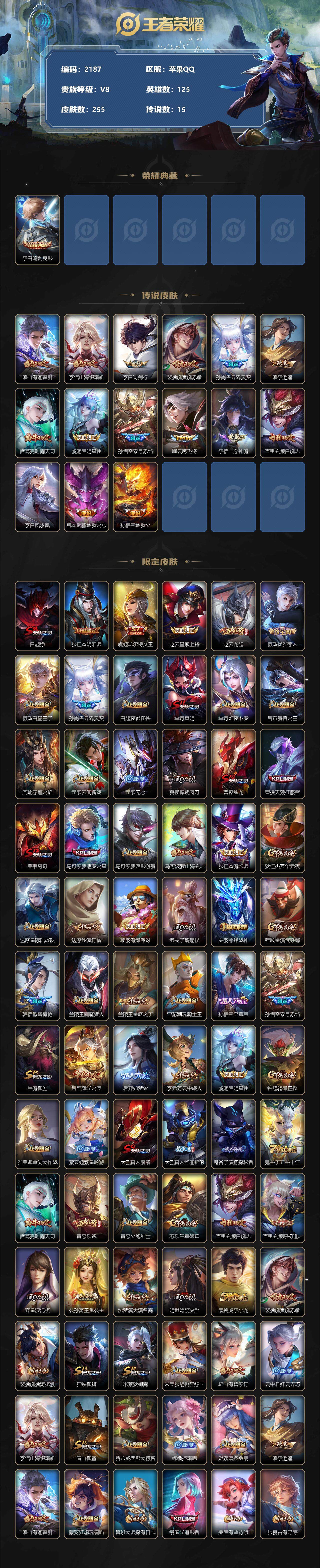 [13109734]苹果Q-V6-荣耀黄金II段位-125英雄-255皮肤-1典藏-0珍品无双-0无双-0珍品传说-15传说-67史诗