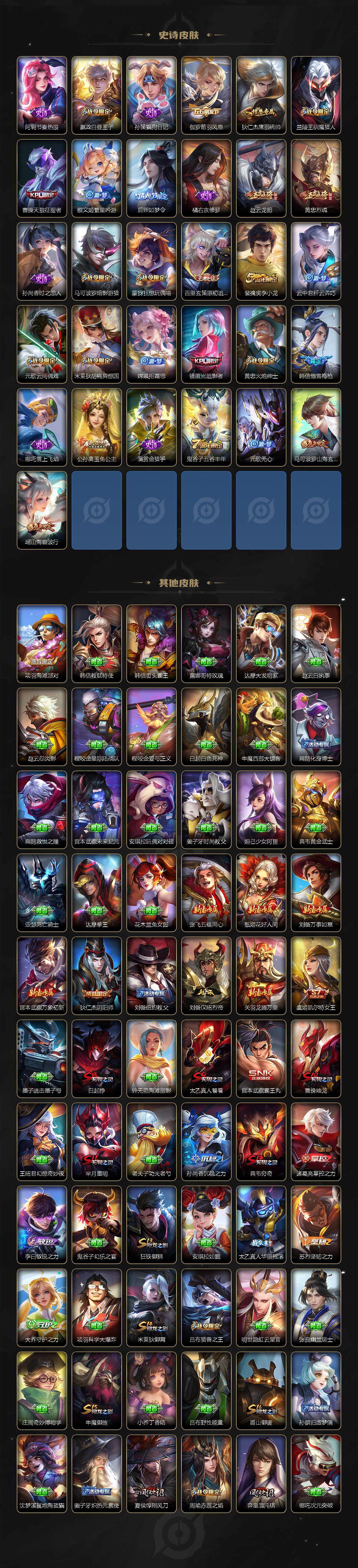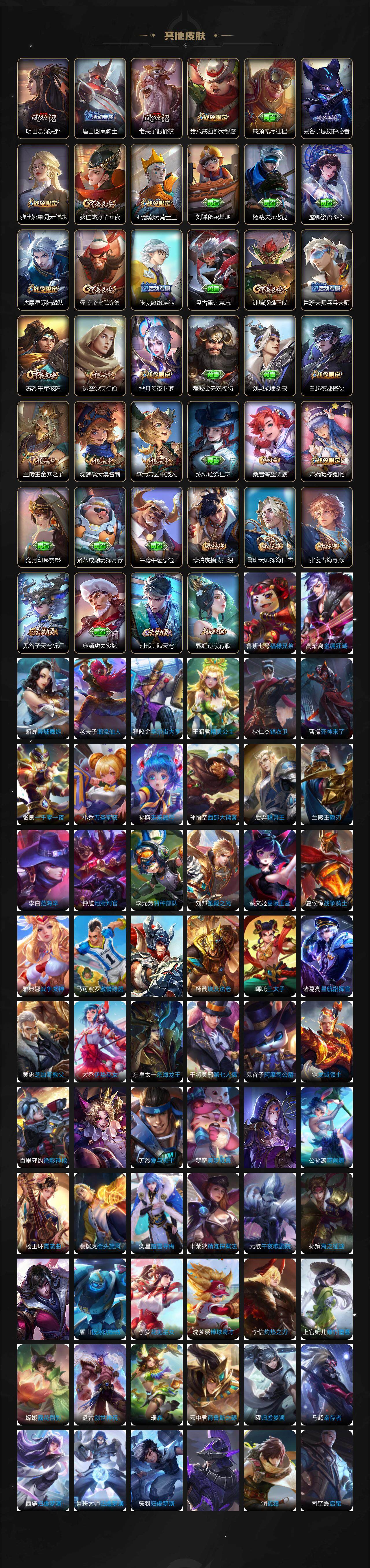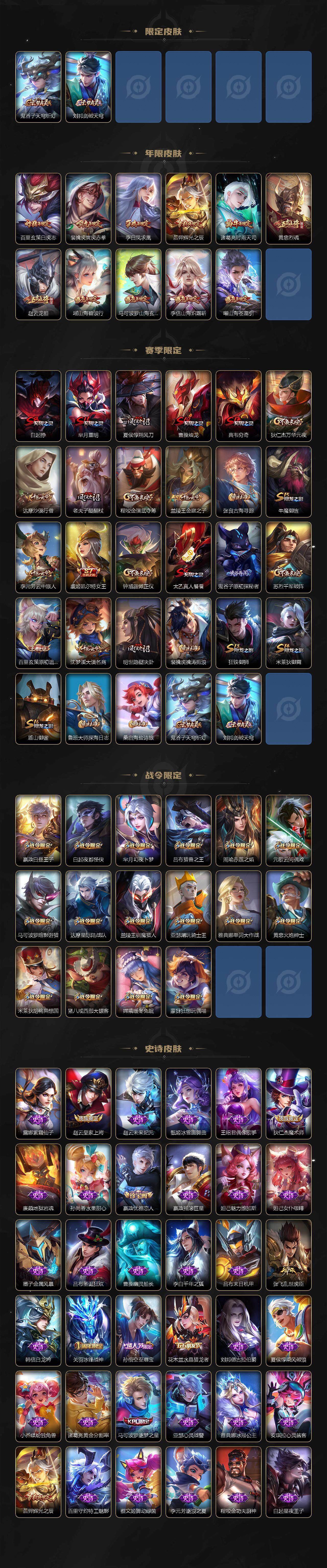 【限定皮肤】:白起狰,狄仁杰阴阳师,虞姬凯尔特女王,赵云皇家上将,赵云龙胆,嬴政优雅恋人,嬴政白昼王子,孙尚香异界灵契,白起夜都怪侠,芈月重明,芈月幻夜卜梦,吕布猎兽之王,周瑜赤莲之焰,元歌云间偶戏,元歌无心,夏侯惇朔风刀,曹操烛龙,曹操天狼征服者,典韦穷奇,马可波罗逐梦之星,马可波罗暗影游猎,马可波罗山海玄木吟,狄仁杰魔术师,狄仁杰万华元夜,达摩星际陆战队,达摩沙漠行僧,项羽海滩派对,老夫子醍醐杖,关羽冰锋战神,程咬金演武夺筹,韩信傲雪梅枪,兰陵王驯魔猎人,兰陵王金庭之子,亚瑟潮玩骑士王,孙悟空至尊宝,孙悟空零号赤焰,牛魔御旌,后羿辉光之辰,后羿如梦令,李元芳云中旅人,虞姬启明星使,钟馗驱傩正仪,雅典娜单词大作战,蔡文姬繁星吟游,太乙真人饕餮,太乙真人华丽摇滚,鬼谷子原初探秘者,鬼谷子五谷丰年,诸葛亮时雨天司,黄忠烈魂,黄忠火炮绅士,苏烈千军破阵,百里玄策白虎志,百里玄策原初追逐者,弈星混沌棋,公孙离玉兔公主,沈梦溪大漠名商,明世隐疑决卦,裴擒虎李小龙,裴擒虎寅虎赤拳,裴擒虎擒涛扼浪,狂铁御狮,米莱狄御霄,米莱狄胡桃异想国,瑶山海碧波行,云中君纤云弄巧,李信山海炽霜斩,盾山御銮,猪八戒西部大镖客,嫦娥拒霜思,嫦娥暖冬兔眠,曜李逍遥 ,曜山海苍雷引,蒙犽狂想玩偶喵,鲁班大师探海日志,镜匿光追影者,桑启海盐诗旅,张良古海寻踪,鬼谷子天穹祈灯,刘邦剑破天穹