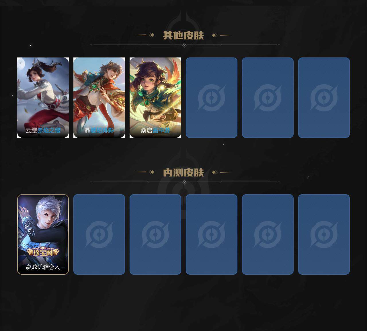 【年限皮肤】:百里玄策白虎志,裴擒虎寅虎赤拳,李白凤求凰,后羿辉光之辰,诸葛亮时雨天司,黄忠烈魂,赵云龙胆,瑶山海碧波行,马可波罗山海玄木吟,李信山海炽霜斩,曜山海苍雷引