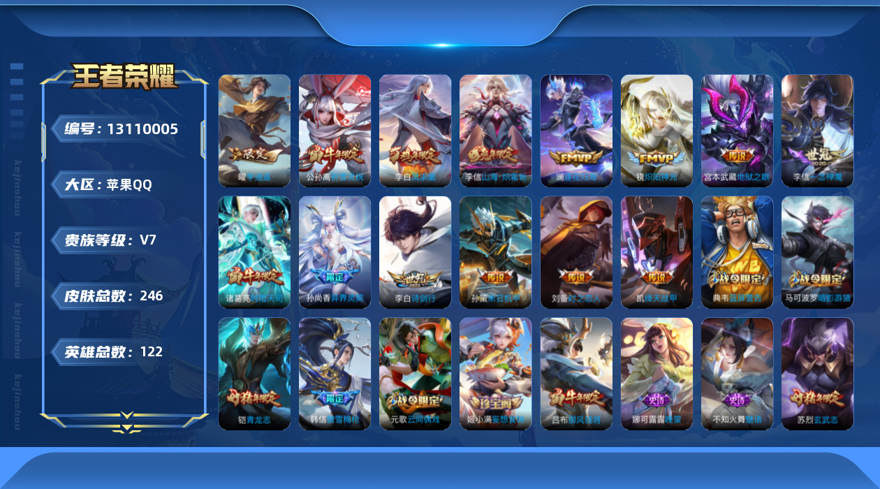[13110005]苹果Q-V0-永恒钻石I段位-122英雄-246皮肤-0典藏-0珍品无双-0无双-0珍品传说-14传说-69史诗