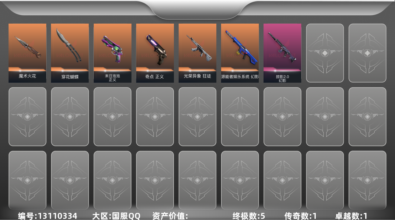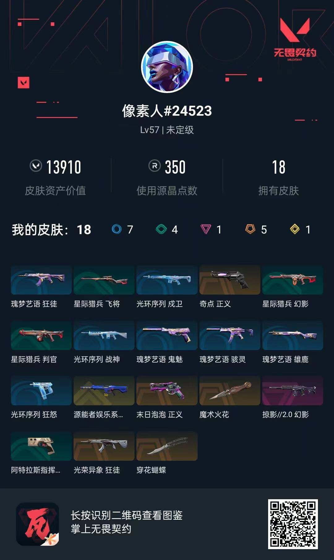 [13110334]【英雄】:炼狱,暮蝶,壹决,铁臂,捷风,雷兹,幽影,不死鸟,贤者,猎枭,零,芮娜,奇乐,尚勃勒,霓虹,斯凯,夜露,盖可,钢锁 【近战 武器】:近战武器-魔术火花,近战武器-穿花蝴蝶,近战武器-魔术火花 【狂徒】:狂徒-光荣异象 【幻影】:幻影-源能者娱乐系统,幻影-掠影//2.0 【正义】:正义-奇点,正义-末日泡泡 【卡面】:红鳞松叶 卡面,Clutch 卡面,无畏契约GO!第一卷:芮娜 卡面,无畏契约GO!第一卷:零 卡面,《双城之战》金克丝 卡面,代号红色 卡面,新兵报到 卡面,V契约 卡面,无畏契约 卡面 【喷漆】:霓光四射 喷漆,买装还是存钱 喷漆,关门放狗 喷漆,暴走萝莉 喷漆,胜利属于无畏契约 喷漆,GLHF 喷漆,无畏契约 喷漆 【挂饰】:无畏契约GO!第一卷 芮娜 挂饰,无畏契约GO!第一卷 零 挂饰,薰衣草之心 挂饰,天外飞客 挂饰,海豹的认可 挂饰,无畏契约 纪念币 挂饰