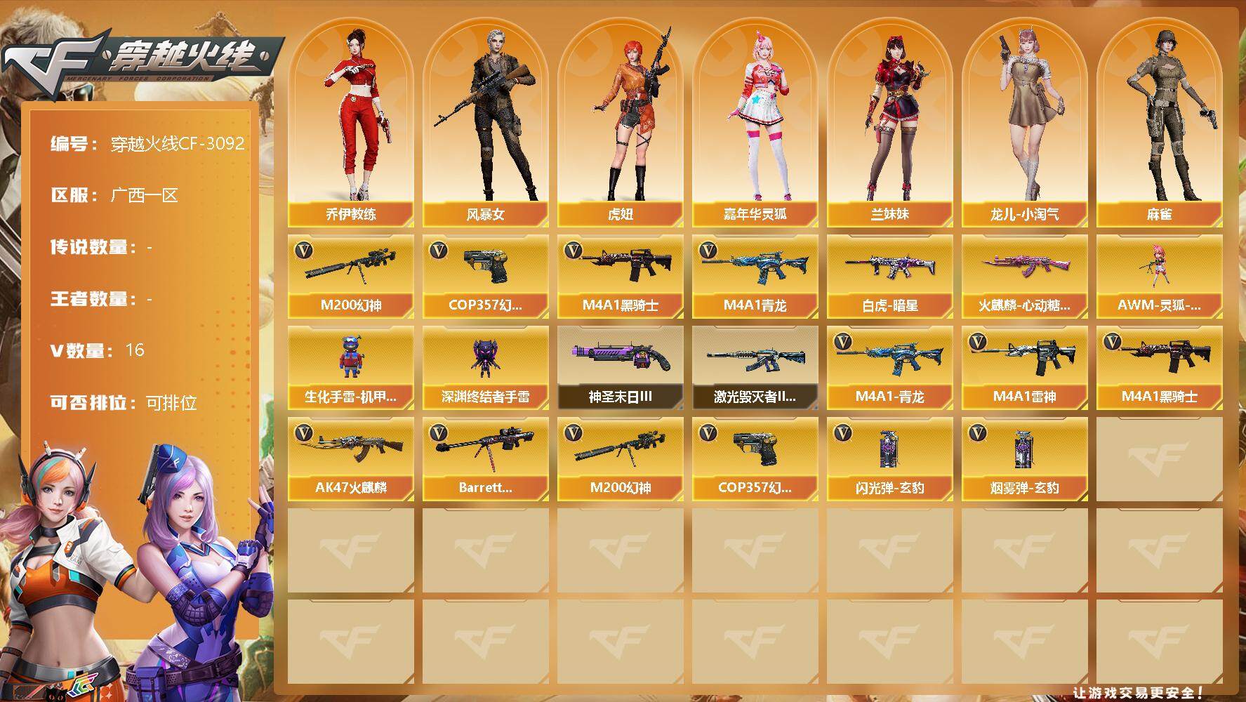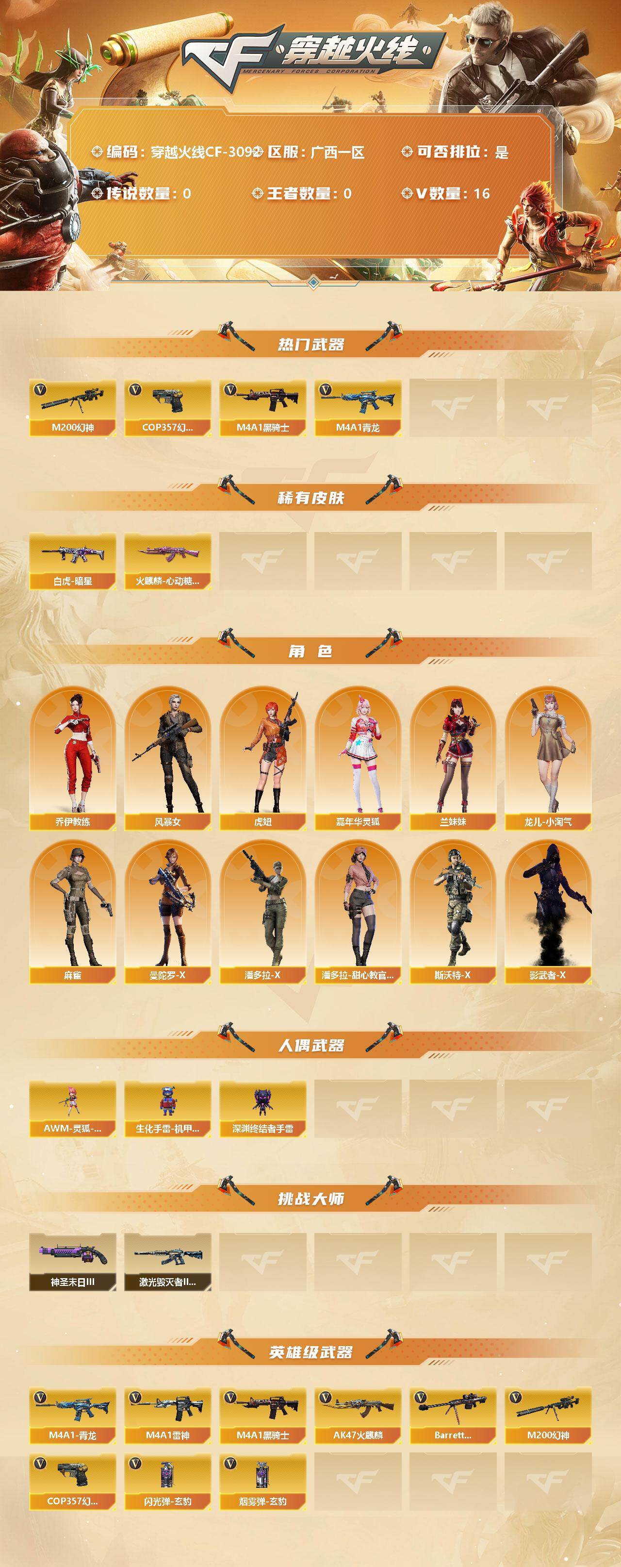 [13110843]广西一区-16V-0王者-0炫金 【热门武器】:M4A1-青龙,M200-幻神,M4A1-黑骑士,COP 357-幻灵 【皮肤】:Scar Light-白虎-暗星,火麒麟-心动糖果,轻型军用手斧-再燃火线 【角色】:乔伊教练,风暴女,虎妞,嘉年华灵狐,兰妹妹,龙儿-小淘气,麻雀,曼陀罗-X,潘多拉-X,潘多拉-甜心教官,斯沃特-X,影武者-X 【人偶武器】:AWM-灵狐-15周年嘉年华,生化手雷-机甲核心,深渊终结者手雷 【挑战大师】:激光毁灭者III-白马银枪,神圣爆裂者-末日III 【英雄级武器】:AK47-火麒麟,M4A1-雷神,M4A1-黑骑士,M4A1-青龙,Barrett-毁灭,M200-幻神,COP 357-幻灵,高爆手雷-玄豹*2,闪光弹-玄豹*2,烟雾弹-玄豹*2 【特殊枪械】:1黑骑士