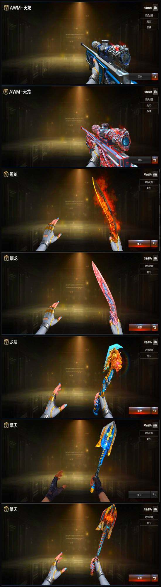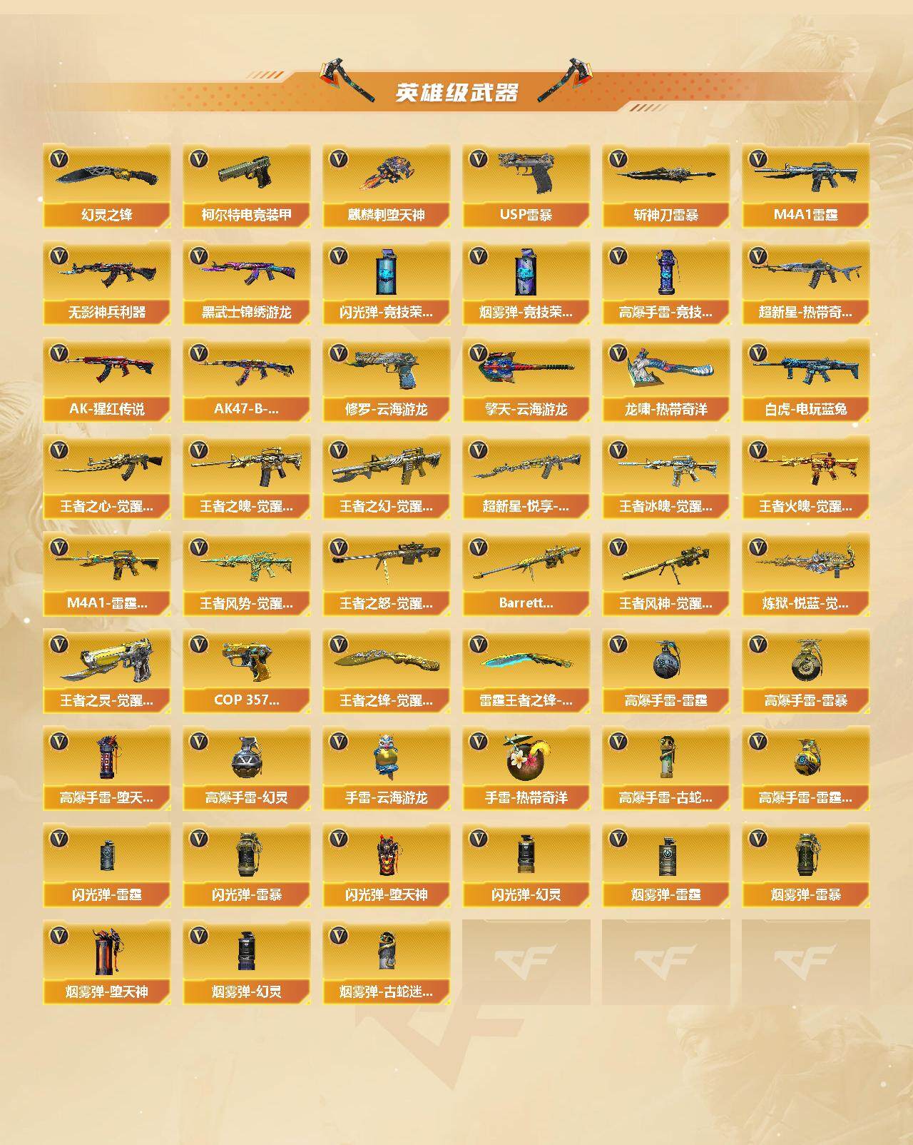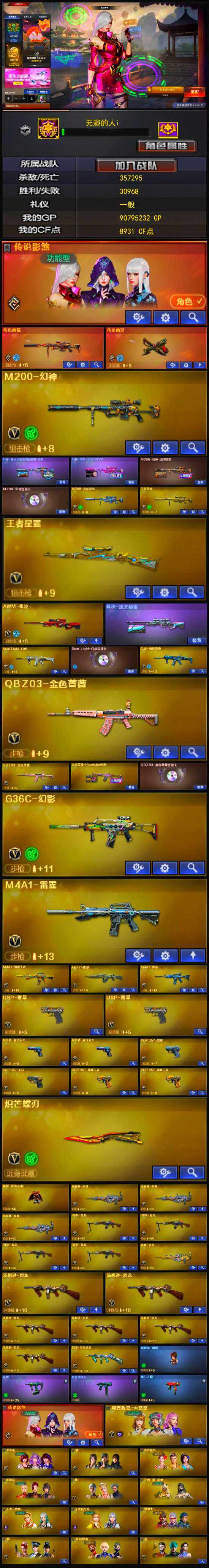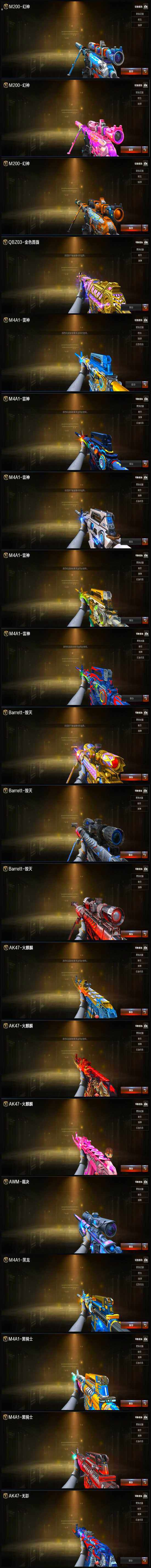 【热门武器】:传说幽瞳,传说幽冥,G36C-幻影,QBZ03-金色蔷薇*2,Scar Light-白虎,M4A1-青龙,M200-幻神,金色蔷薇-古蛇迷踪,修罗-古蛇迷踪,M200-竞技荣光,死亡之眼,白虎-电玩蓝兔,C.A.T,炼狱-迷你小钢,毒蜂,M4A1-黑骑士*3,汤姆逊-烈龙*6,RPK-盘龙*4,加特林-炼狱*3,斯泰尔-蝴蝶,火麒麟-绝迹,USP-雷暴*2,COP 357-幻灵,沙鹰-修罗*6,炽芒蝶刃