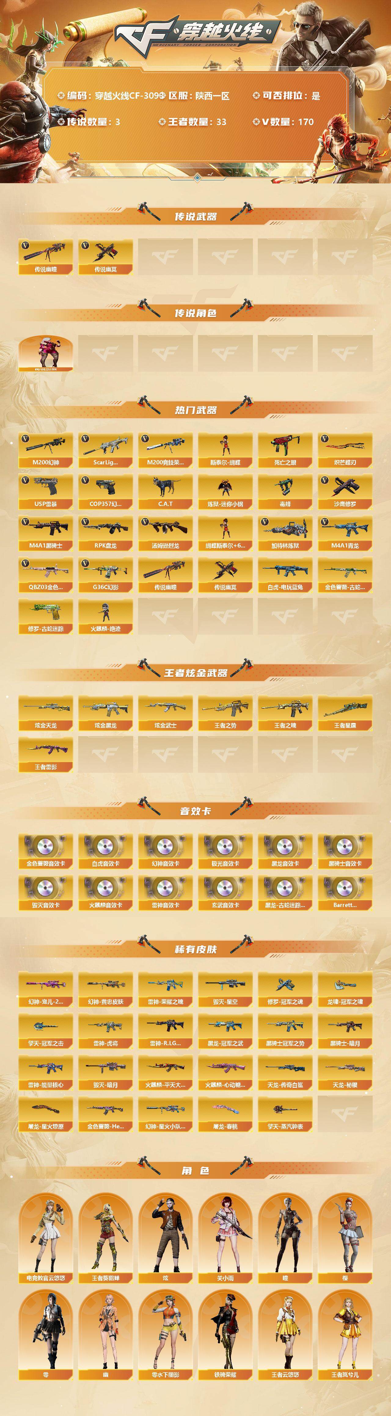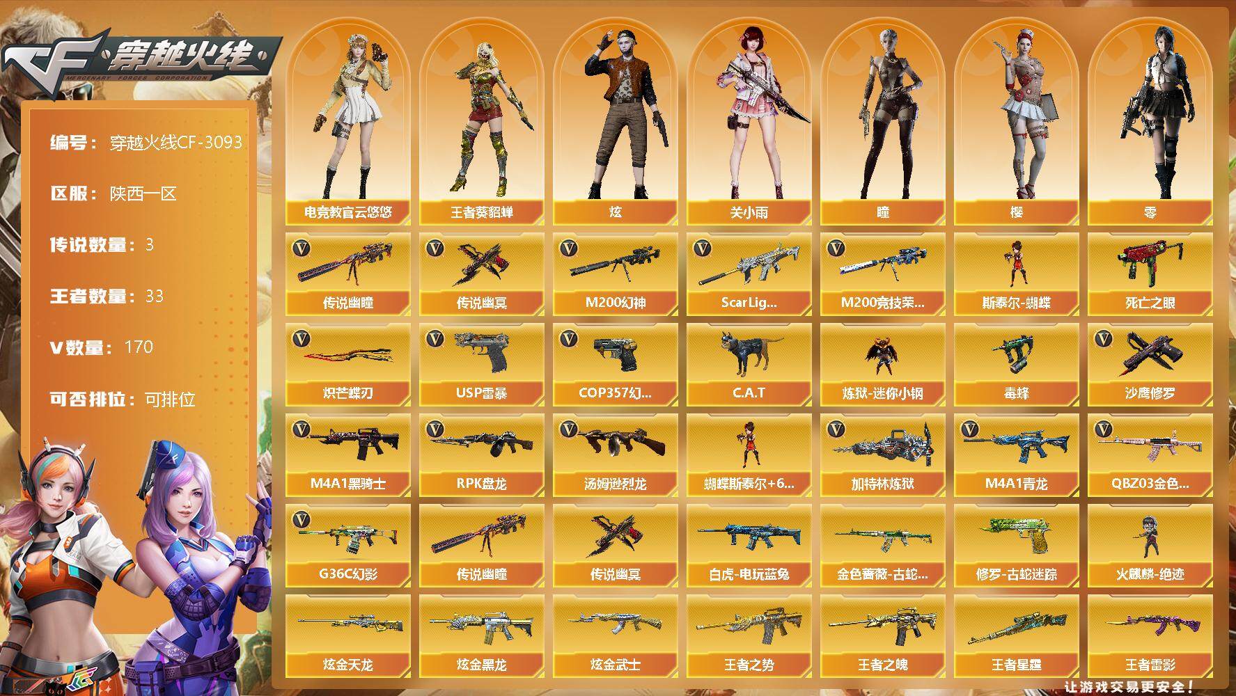 [13111246]陕西一区-170V-33王者-4炫金 【传说武器】:传说幽瞳,传说幽冥 【传说角色】:传说影煞 【热门武器】:传说幽瞳,传说幽冥,G36C-幻影,QBZ03-金色蔷薇*2,Scar Light-白虎,M4A1-青龙,M200-幻神,金色蔷薇-古蛇迷踪,修罗-古蛇迷踪,M200-竞技荣光,死亡之眼,白虎-电玩蓝兔,C.A.T,炼狱-迷你小钢,毒蜂,M4A1-黑骑士*3,汤姆逊-烈龙*6,RPK-盘龙*4,加特林-炼狱*3,斯泰尔-蝴蝶,火麒麟-绝迹,USP-雷暴*2,COP 357-幻灵,沙鹰-修罗*6,炽芒蝶刃 【王者炫金武器】:王者之势,王者之魄,王者雷影,王者星霆,炫金天龙*2,炫金黑龙,炫金武士 【音效卡】:黑龙-古蛇迷踪音效卡,M200-幻神音效卡,AK47-火麒麟音效卡,M4A1-雷神音效卡,M4A1-黑龙音效卡,M4A1-黑骑士音效卡,Barrett-毁灭音效卡,Barrett-极光音效卡,QBZ03-金色蔷薇音效卡,Scar Light-白虎音效卡,M14EBR-玄武音效卡,Barrett-碧霄极光音效卡*3 【皮肤】:M200-幻神-黄忠皮肤,幻神-宠儿-2021MVP,幻神-星火小队签名臻藏版 皮肤,金色蔷薇-Heartshot皮肤,裁决-流光秘银,雷神-暗月,雷神-能量核心,雷神-荣耀之魄,雷神-虎将,雷神-R.LGD-CFPLS18冠军,雷神-航星皮肤,火麒麟-雷神,火麒麟-平天大圣,火麒麟-心动糖果,毁灭-暗月,毁灭-星空,黑龙-冠军之武,黑骑士-暗月*2,黑骑士-冠军之势,无影-能量核心,死神-机甲核心皮肤,玫瑰精灵-粉色浪漫 皮肤,天龙-秘银,AWM-天龙-传奇白鲨,修罗-能量核心*2,修罗-冠军之魂,屠龙-星火燎原,屠龙-春桃 皮肤,龙啸-冠军之啸,擎天-冠军之击,擎天-蒸汽钟表 皮肤 【角色】:零,樱,瞳,炫,电竞教官-云悠悠,关小雨,王者-葵-貂蝉,王者云悠悠,王者岚兮儿,蛇隐宗,奇洋探员,修道士,云海玲珑,北极狐-X,初恋灵狐,电竞少女,芳心审判者,嘉年华灵狐,兰妹妹,零-水下丽影,灵狐-花神,灵狐者-黄金海岸,龙儿-小淘气,潘多拉-X,潘多拉-甜心教官,蛇姬,斯沃特-X,铁骑荣耀,五号兵器-赛博朋克,夜玫瑰-幻能朋克,幽 【人偶武器】:火麒麟-绝迹,火麒麟-灵狐,炼狱-迷你小钢,斯泰尔-蝴蝶,Scar Light-马枪,AWM