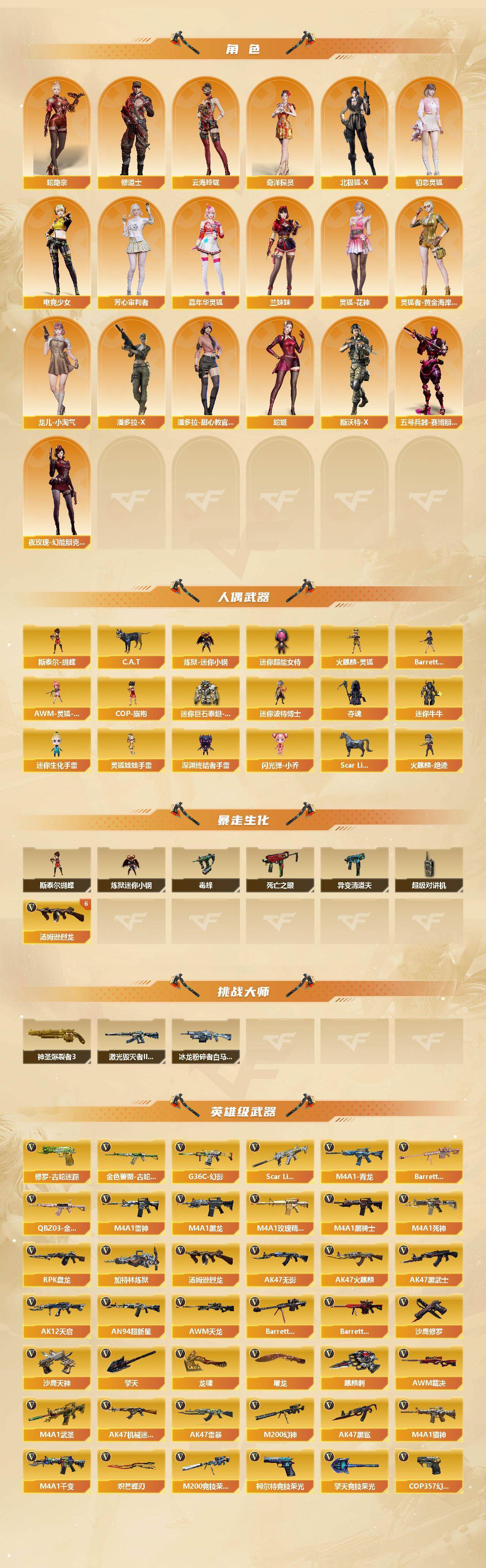 - [12713758]山西一区-43V-20王者-0炫金 【热门武器】:QBZ03-金色蔷薇,Scar Light-白虎,M200-幻神,白虎-电玩蓝兔,柯尔特-冠军之特,Kar98K-星神,Knife-冠军之刃 【王者炫金武器】:王者之圣,王者之城,王者蔷薇 【音效卡】:屠龙-动感闪耀 音效卡,M200-幻神音效卡,AK47-火麒麟音效卡,M4A1-黑骑士音效卡,Barrett-极光音效卡,QBZ03-金色蔷薇音效卡,Scar Light-白虎音效卡 【稀有皮肤】:幻神-周瑜皮肤,幻神-宠儿-2021MVP,幻神-巅峰荣耀,白虎-电玩粉兔皮肤,QBZ03-冠军之薇,雷神-荣耀之魄,火麒麟-冠军之心,火麒麟-平天大圣,火麒麟-心动糖果,毁灭-荣耀之怒,毁灭-冠军之怒 【角色】:王者潘多拉,王者沙漠玫瑰,魅影,荒漠琉璃,隼,战地猎狐,女主播 【人偶武器】:白虎-迷你小艾,巴雷特-零-水下丽影,AWM-灵狐-15周年嘉年华,迷你超能女侍 【暴走生化】:超级对讲机 【挑战大师】:神圣爆裂者-末日III,VEPR-12-金魔,冰龙粉碎者-白马银枪*2 【英雄级武器】:USP-神工天巧*2,擎天-竞技荣光,高爆手雷-竞技荣光,烟雾弹-竞技荣光,闪光弹-竞技荣光,烈火-动感闪耀,天神-动感闪耀,屠龙-动感闪耀,手雷-动感闪耀,QBZ03-金色蔷薇,Scar Light-白虎,白虎-电玩蓝兔,无影-神兵利器,M4A1-雷神,AK47-火麒麟,Barrett-毁灭,Barrett-极光,QBZ03-天罚,Kar98K-星神,M200-幻神,黑武士-锦绣游龙,AK-47-猩红传说,M4A1-赤狱骑士,柯尔特-冠军之特,沙鹰-天神*2,麒麟刺,屠龙*2 【特殊枪械】:1白虎