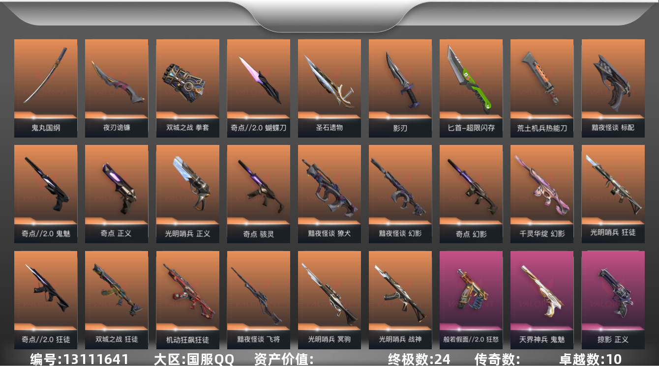 [13111641]【套装】:《双城之战》收藏套装,光明哨兵套装,奇点//2.0套装,黯夜怪谈套装,回火礼包:奇点套装,般若假面//2.0套装,掠影套装 【英雄】:炼狱,维斯,暮蝶,壹决,铁臂,捷风,不死鸟,贤者,猎枭,蝰蛇,芮娜,奇乐,尚勃勒,霓虹,盖可,黑梦,钢锁 【近战 武器】:近战武器-鬼丸国纲,近战武器-双城之战 拳套,近战武器-超限闪存 匕首,近战武器-荒土机兵 热能刀,近战武器-奇点//2.0 蝴蝶刀,近战武器-圣石遗物,近战武器-夜刃诡镰,近战武器-影刃 【标配】:标配-黯夜怪谈,标配-荒土机兵,标配-浮光跃金 【狂怒】:狂怒-般若假面//2.0,狂怒-逆冲蛮牛 【鬼魅】:鬼魅-奇点//2.0,鬼魅-天界神兵,鬼魅-模拟赫兹 【正义】:正义-光明哨兵,正义-奇点,正义-掠影,正义-超限闪存,正义-纳米打击 【蜂刺】:蜂刺-超限闪存 【骇灵】:骇灵-奇点,骇灵-荒土机兵,骇灵-浮光跃金 【雄鹿】:雄鹿-模拟赫兹,雄鹿-逆冲蛮牛 【判官】:判官-纳米打击x 【獠犬】:獠犬-黯夜怪谈,獠犬-般若假面//2.0,獠犬-模拟赫兹,獠犬-逆冲蛮牛 【戍卫】:戍卫-掠影,戍卫-浮光跃金,戍卫-逆冲蛮牛 【幻影】:幻影-黯夜怪谈,幻影-奇点,幻影-千灵华绽,幻影-侦察力量,幻影-超限闪存,幻影-纳米打击 【狂徒】:狂徒-光明哨兵,狂徒-机动狂飙,狂徒-奇点//2.0,狂徒-双城之战,狂徒-般若假面//2.0,狂徒-掠影,狂徒-荒土机兵 【飞将】:飞将-黯夜怪谈 【冥驹】:冥驹-光明哨兵,冥驹-掠影,冥驹-荒土机兵,冥驹-模拟赫兹 【莽侠】:莽侠-超限闪存 【战神】:战神-光明哨兵,战神-般若假面//2.0,战神-浮光跃金 【奥丁】:奥丁-纳米打击 【卡面】:终章:激斗汉堡 卡面,进入射程 卡面,分崩离析 卡面,纳米打击 卡面,抑制技术 卡面,激斗汉堡 卡面,瓦娃脸雪糕 P2 卡面,从黄昏到黎明 卡面,荒土机兵 卡面,银弹猎手 卡面,逆冲蛮牛 卡面,《双城之战》拥抱 卡面,精灵大战 卡面,欢迎来到底城 卡面,南瓜盛典 卡面,VCT CN首冠 卡面,唱片的故事 卡面,钢弓与箭弦 卡面,排除故障 卡面,奇点//2.0 卡面,战术桌游 卡面,悠享食光 卡面,修车达人 卡面,热舞环节 卡面,模拟赫兹 卡面,浮光跃金 卡面,超限闪存 卡面,维斯工牌 卡面,正义的化身 卡面,无畏契约GO!第一卷: