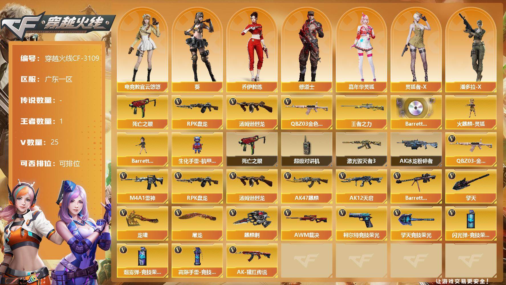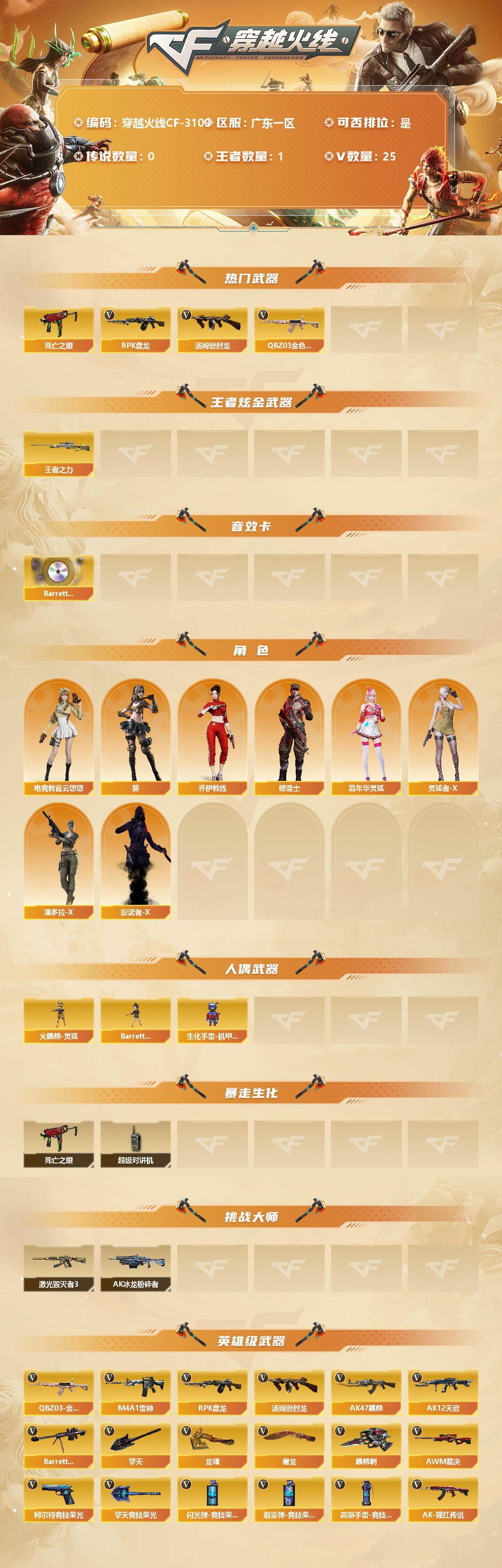[13111879]广东一区-25V-1王者-0炫金 【热门武器】:QBZ03-金色蔷薇,死亡之眼,汤姆逊-烈龙*4,RPK-盘龙 【王者炫金武器】:王者之力 【音效卡】:Barrett-碧霄极光音效卡 【皮肤】:火麒麟-雷神,毁灭-黑曼巴 皮肤,屠龙-破浪逐光 皮肤 【角色】:葵,电竞教官-云悠悠,乔伊教练,修道士,嘉年华灵狐,灵狐者-X,潘多拉-X,影武者-X 【人偶武器】:火麒麟-灵狐,Barrett-夜玫瑰,生化手雷-机甲核心*2 【暴走生化】:死亡之眼,超级对讲机 【挑战大师】:AK47-冰龙粉碎者*2,激光毁灭者III 【英雄级武器】:AK47-麒麟,M4A1-雷神,AK12-天启,QBZ03-金色蔷薇,AK-47-猩红传说*2,Barrett-毁灭,AWM-裁决,RPK-盘龙,汤姆逊-烈龙*4,柯尔特-竞技荣光,屠龙,龙啸,擎天,麒麟刺,擎天-竞技荣光,高爆手雷-竞技荣光,闪光弹-竞技荣光,烟雾弹-竞技荣光 【特殊枪械】:4烈龙,1盘龙