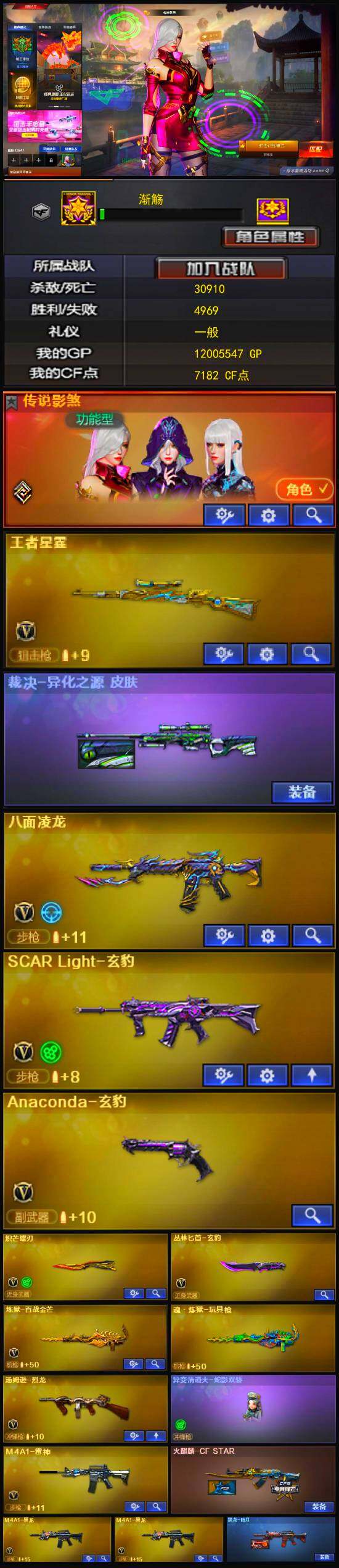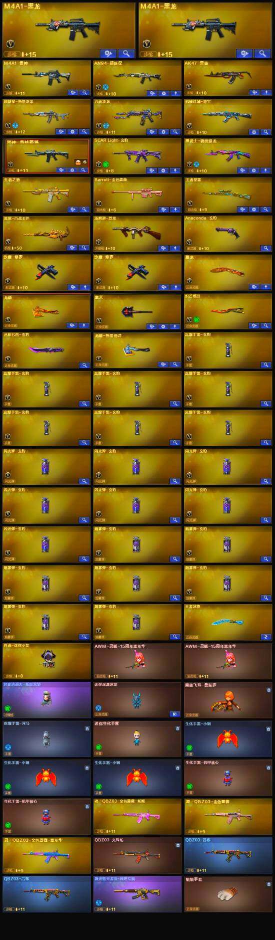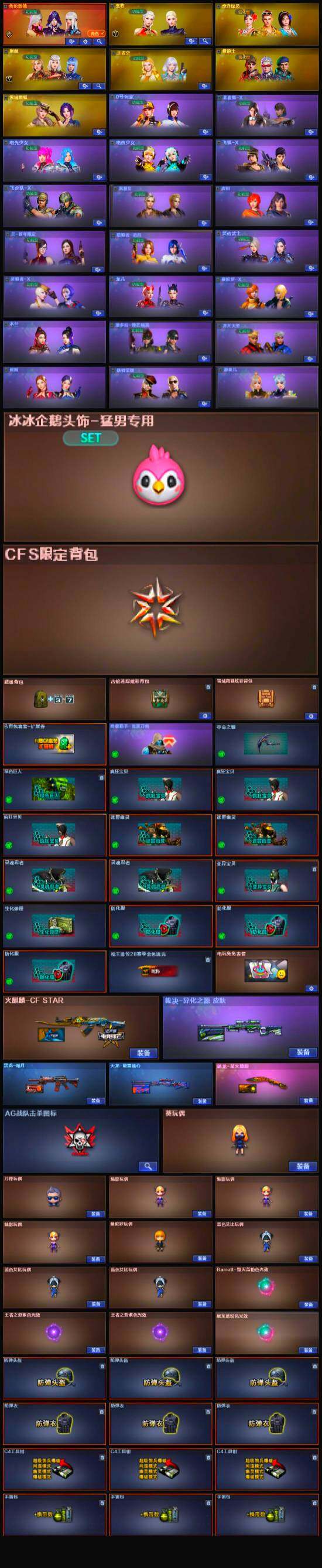 【英雄级武器】:M4A1-黑龙*2,M4A1-雷神,AN94-超新星,AK47-黑鲨,黑武士-锦绣游龙,超新星-热带奇洋,八面凌龙,死神-雪域霜狐,SCAR Light-玄豹,王者之势-觉醒版,Barrett-金色蔷薇,炼狱-百战金芒,汤姆逊-烈龙,沙鹰-修罗*2,屠龙,龙啸,擎天,炽芒蝶刃,龙啸-热带奇洋,麒麟刺-百战金芒,手雷-热带奇洋,高爆手雷-玄豹*7,闪光弹-玄豹*7,烟雾弹-玄豹*7,M4A1-赤狱骑士