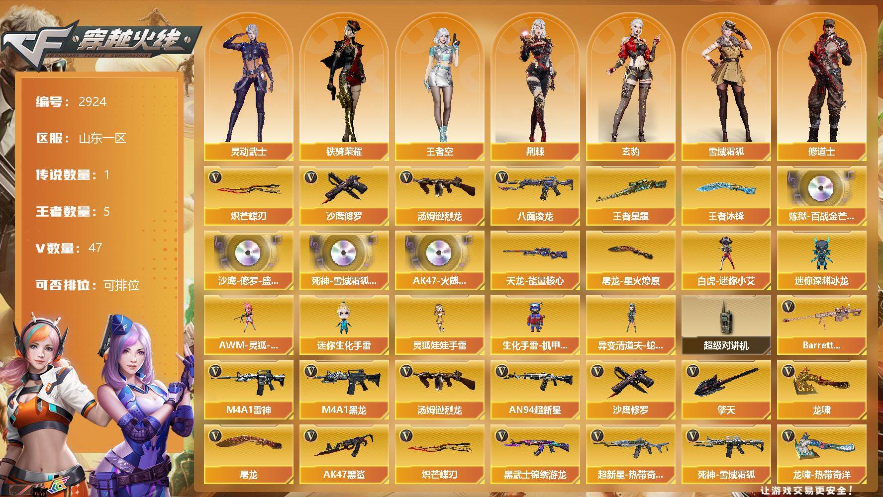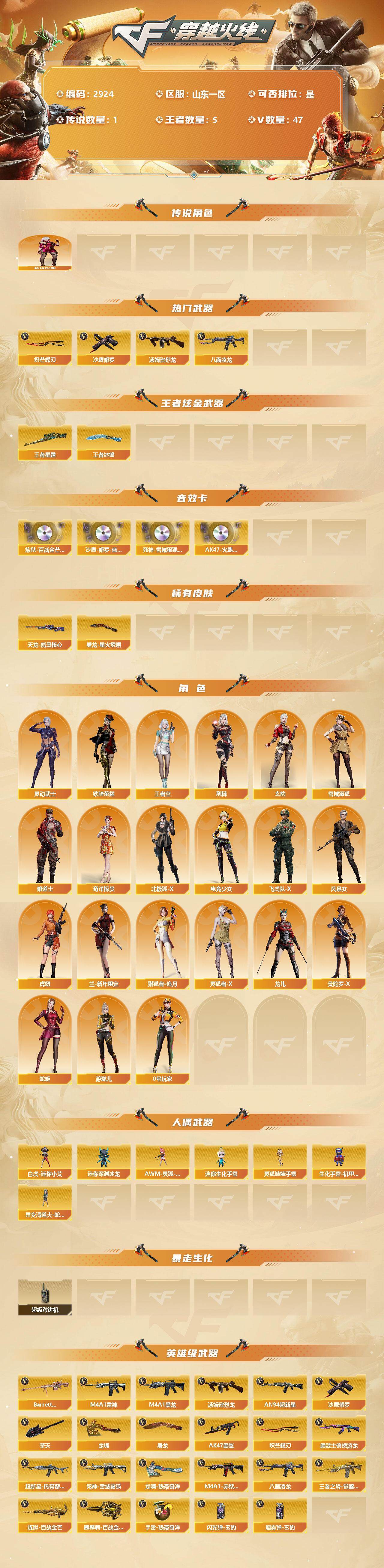 [13112492]山东一区-47V-5王者-0炫金 【传说角色】:传说影煞 【热门武器】:八面凌龙,汤姆逊-烈龙,沙鹰-修罗*2,炽芒蝶刃 【王者炫金武器】:王者星霆,王者冰锋 【音效卡】:炼狱-百战金芒-庆典舞曲音效卡,沙鹰-修罗-盛典舞曲音效卡,死神-雪域霜狐-怀旧音效卡,AK47-火麒麟-怀旧音效卡 【皮肤】:M4A1-再燃火线,毁灭-雪域霜狐 皮肤,黑龙-暗月,天龙-能量核心,屠龙-星火燎原,轻型军用手斧-再燃火线 【角色】:玄豹,荆棘,王者空,雪域霜狐,奇洋探员,修道士,北极狐-X,电竞少女,飞虎队-X,风暴女,虎妞,兰-新年限定,猎狐者-追月,0号玩家,灵动武士,灵狐者-X,龙儿,曼陀罗-X,蛇姬,铁骑荣耀,游珑儿 【人偶武器】:白虎-迷你小艾,异变清道夫-蛇影双骄,AWM-灵狐-15周年嘉年华*2,迷你深渊冰龙,迷你生化手雷,灵狐娃娃手雷,生化手雷-机甲核心*2 【暴走生化】:超级对讲机 【英雄级武器】:M4A1-黑龙*2,M4A1-雷神,AN94-超新星,AK47-黑鲨,黑武士-锦绣游龙,超新星-热带奇洋,八面凌龙,死神-雪域霜狐,SCAR Light-玄豹,王者之势-觉醒版,Barrett-金色蔷薇,炼狱-百战金芒,汤姆逊-烈龙,沙鹰-修罗*2,屠龙,龙啸,擎天,炽芒蝶刃,龙啸-热带奇洋,麒麟刺-百战金芒,手雷-热带奇洋,高爆手雷-玄豹*7,闪光弹-玄豹*7,烟雾弹-玄豹*7,M4A1-赤狱骑士 【特殊枪械】:1烈龙